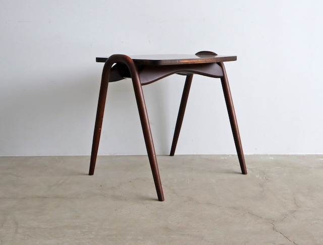 【商品詳細】 老舗木工メーカー、キツツキマークで有名な飛騨産業のヴィンテージサイドテーブル。 国産曲木椅子の歴史の中でも重要な位置付けとなる、1960年デザイン 同社の名作「アイガーチェア」とセットで販売されていたモデルで、曲げ木加工による脚部の造形が美しい隠れた名作。 軽量で小ぶりなサイズ感は、ソファ脇でコーヒーテーブルとして。ベッドサイドで、灯りと本を置くための場所として。あるいは玄関で、花器やオブジェを添える台としても。 現代の空間にもすっと馴染んでくれるサイドテーブルです。 【状態】 全体的に経年の使用感のあるヴィンテージ品になります。 クリーニング、ポリッシュ済み。 天板や脚部の傷、ペイントロス、褪色などございますので画像にてご確認ください。 【サイズ】 幅 50センチ 奥行 44センチ 高さ 50センチ 【ご配送】 送料無料 クロネコヤマト160サイズで山形県からの発送になります。 【注意事項】 運送事故を除いてノークレームノーリターンになります。 長期保管はお受けしておりません。 ご購入から最長でも14日以内にお受け取りいただける方のみ、ご検討ください。