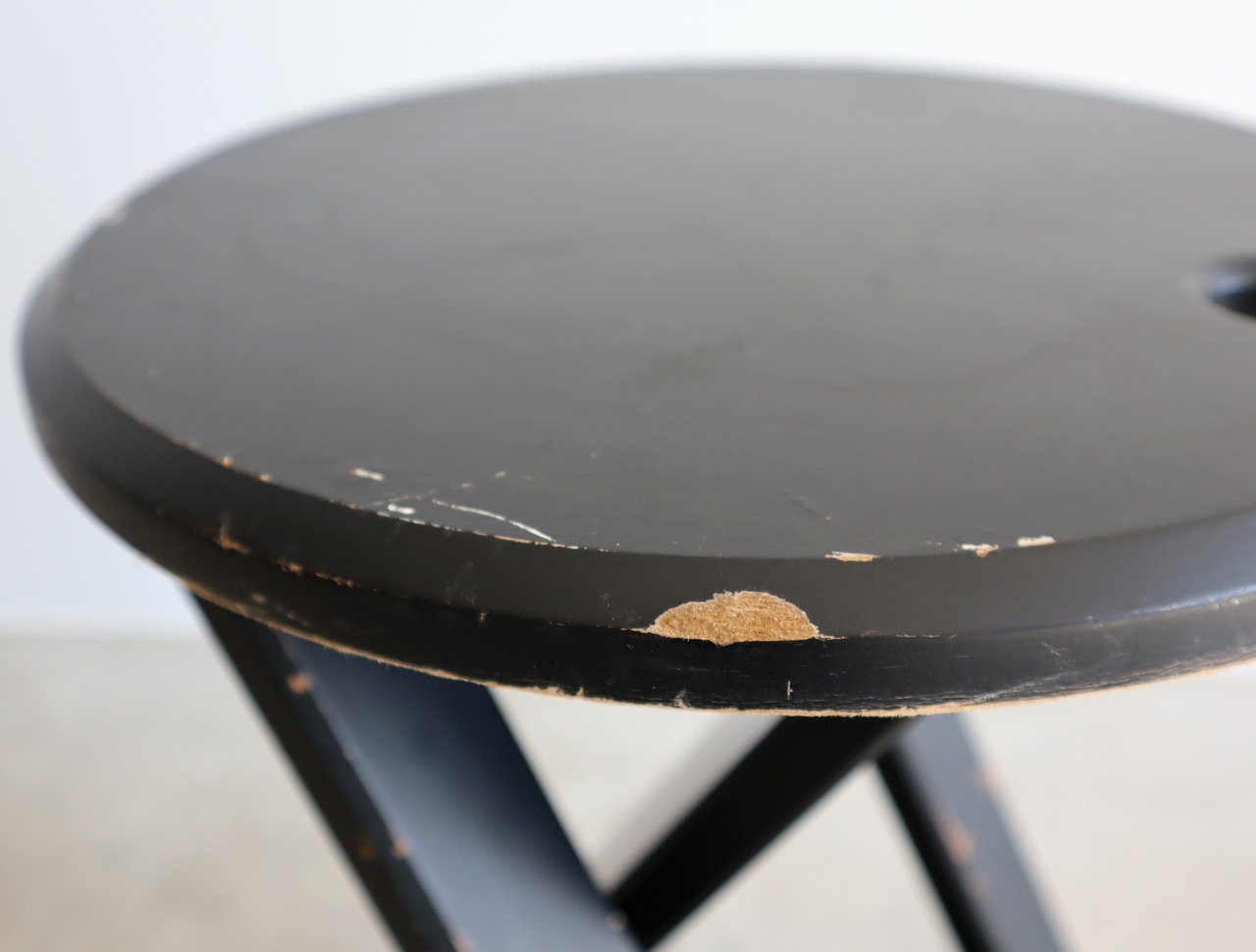 Xの形に開いた脚部はオブジェのような佇まいながら、持ち上げるだけでフラットに折り畳みが可能、座面の丸い穴部分を利用し壁に掛けることによってウォールアートとしても存在感を発揮いたします。