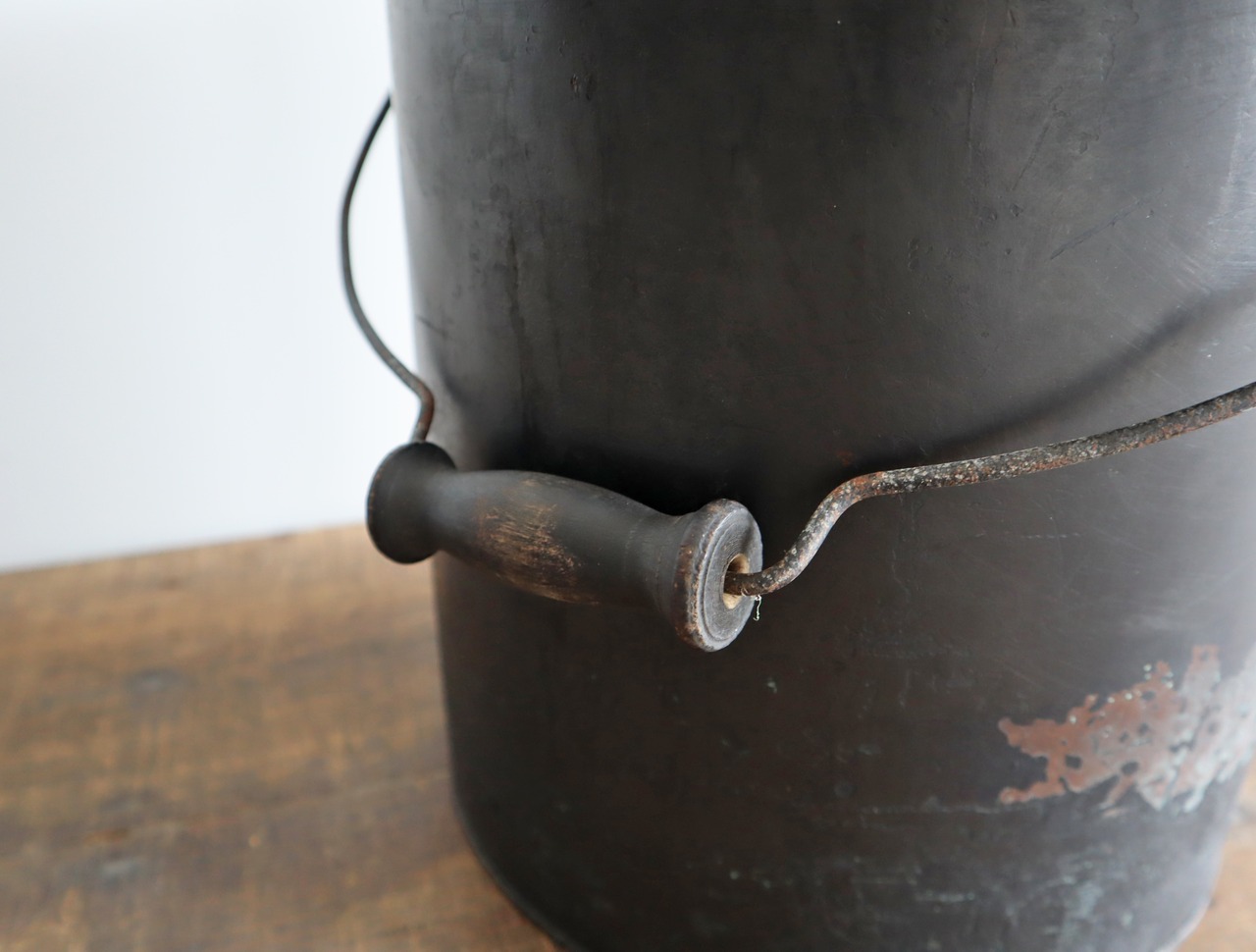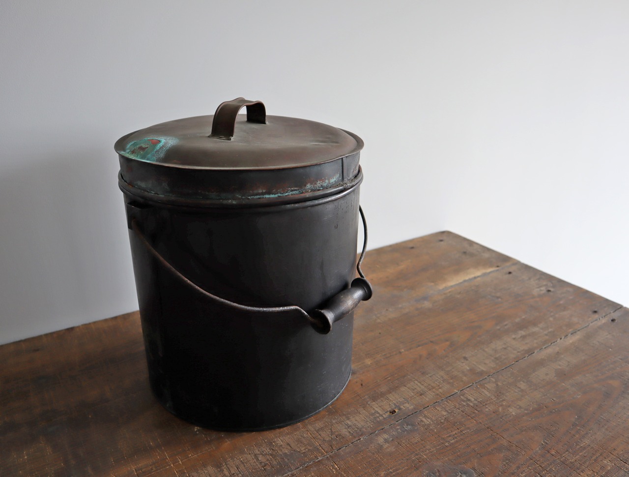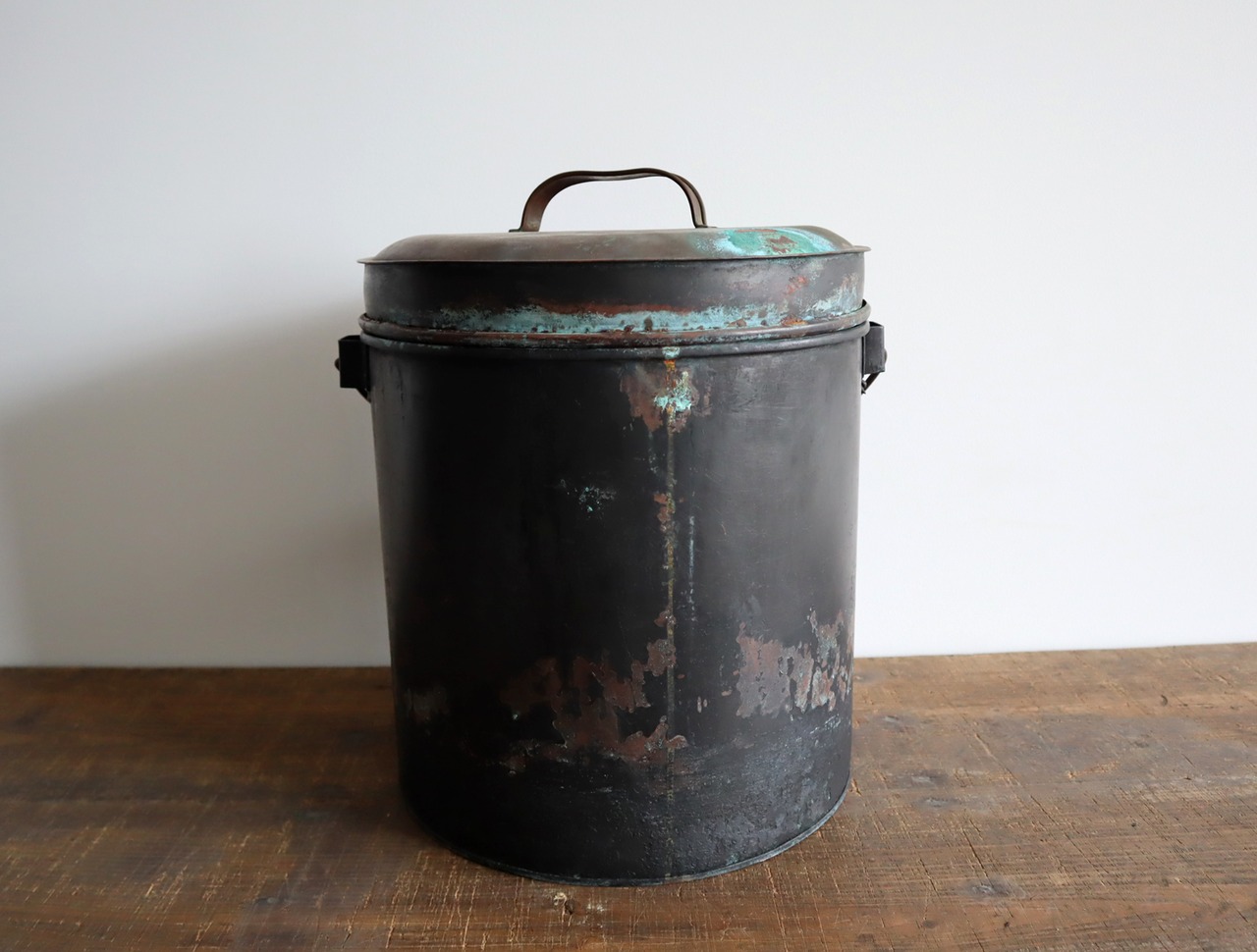 ブリキのような素材の内側とは対照的な外面の経年変化が印象的で、古い真鍮製品に見られるような蓋の緑青も良いアクセントとなり、独特の存在感を醸し出しております。