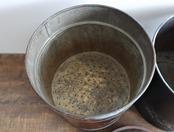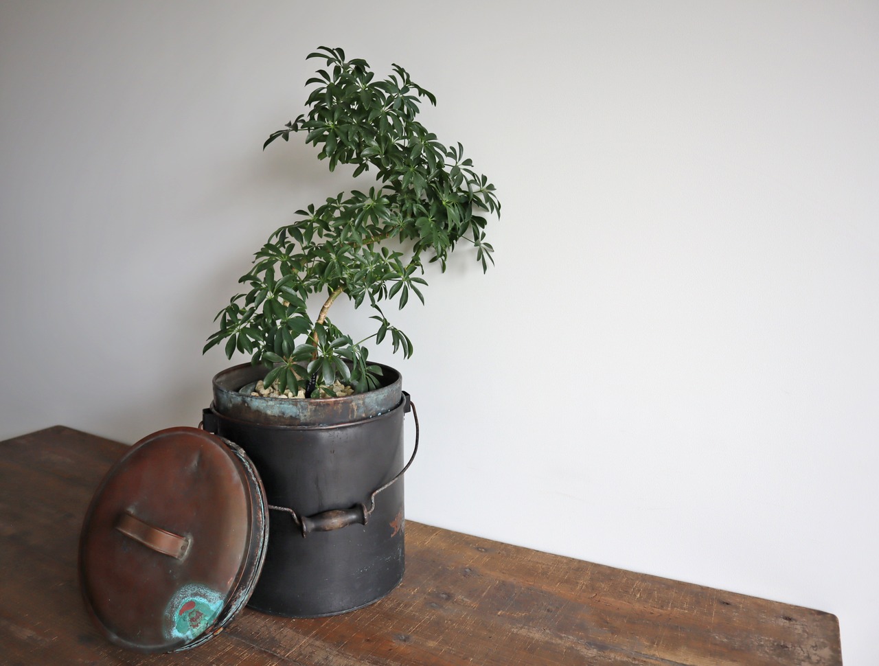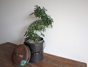 よく見るブリキ缶と比べ肉厚でずっしりした印象、観葉植物とのマッチングが期待できる外観のうえ、内側に収まる方の底面に通気口がございますので、鉢カバーとしてうってつけの古道具としてお勧めいたします。