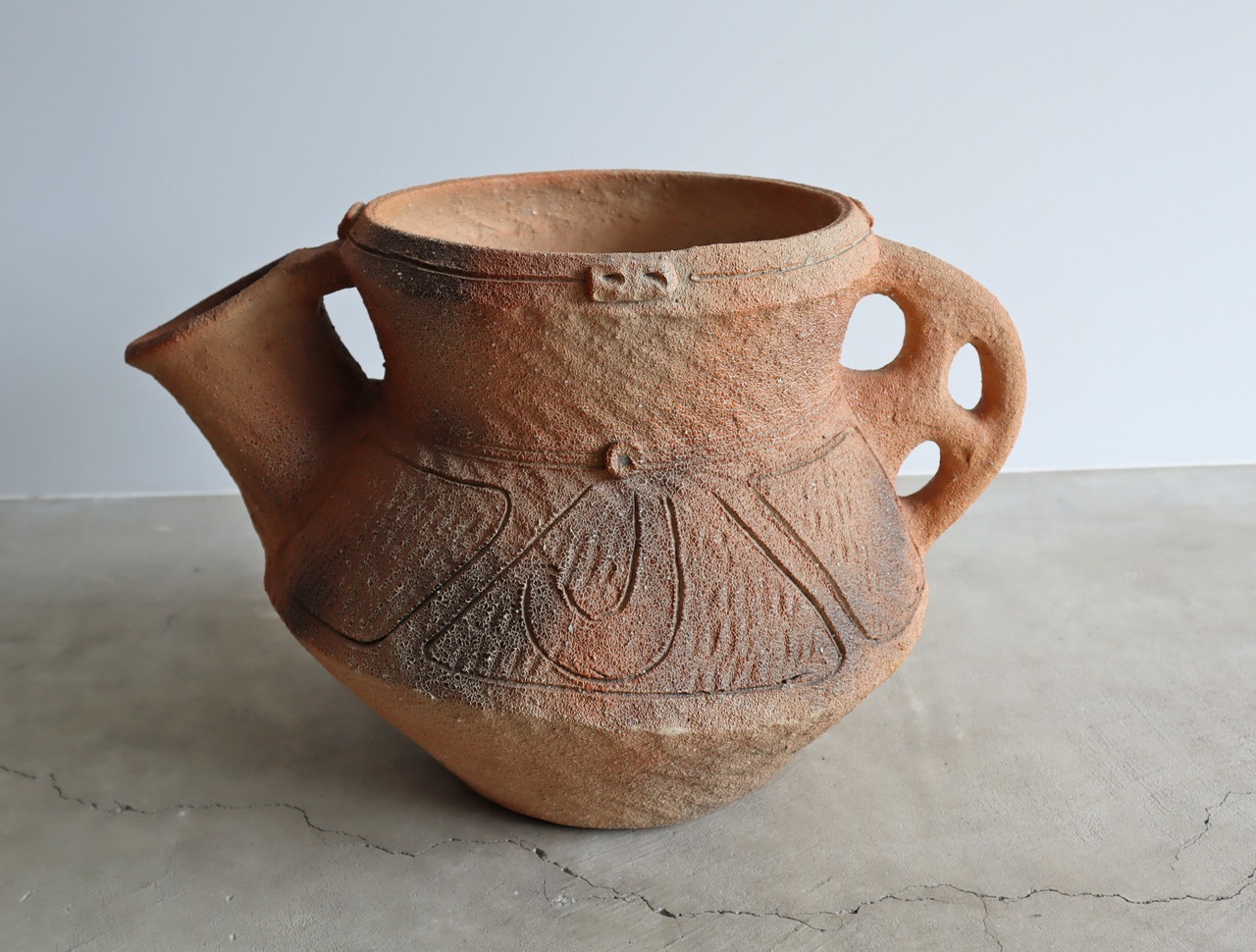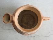 ジョウロ、水差しのような形が印象的な、鉢カバーサイズの素焼きの陶器。