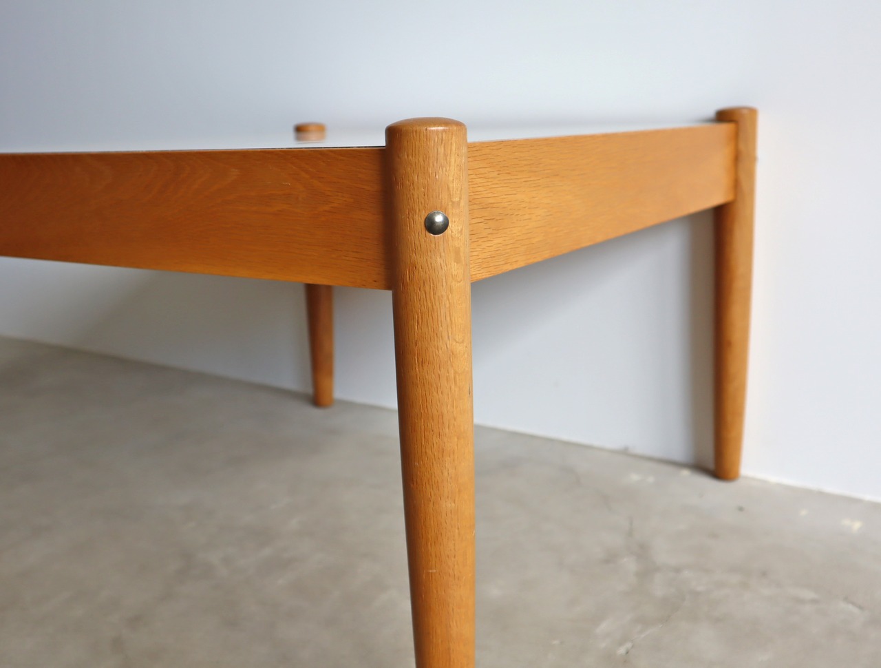 クリア塗装のオーク材とホワイトのメラミントップによるナチュラルな風合いが北欧風の国産ヴィンテージになります。