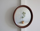 秋田木工のロングセラー、柳宗理デザインの曲木鏡、丸型、小サイズ、古代色の中古品。