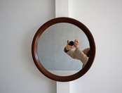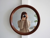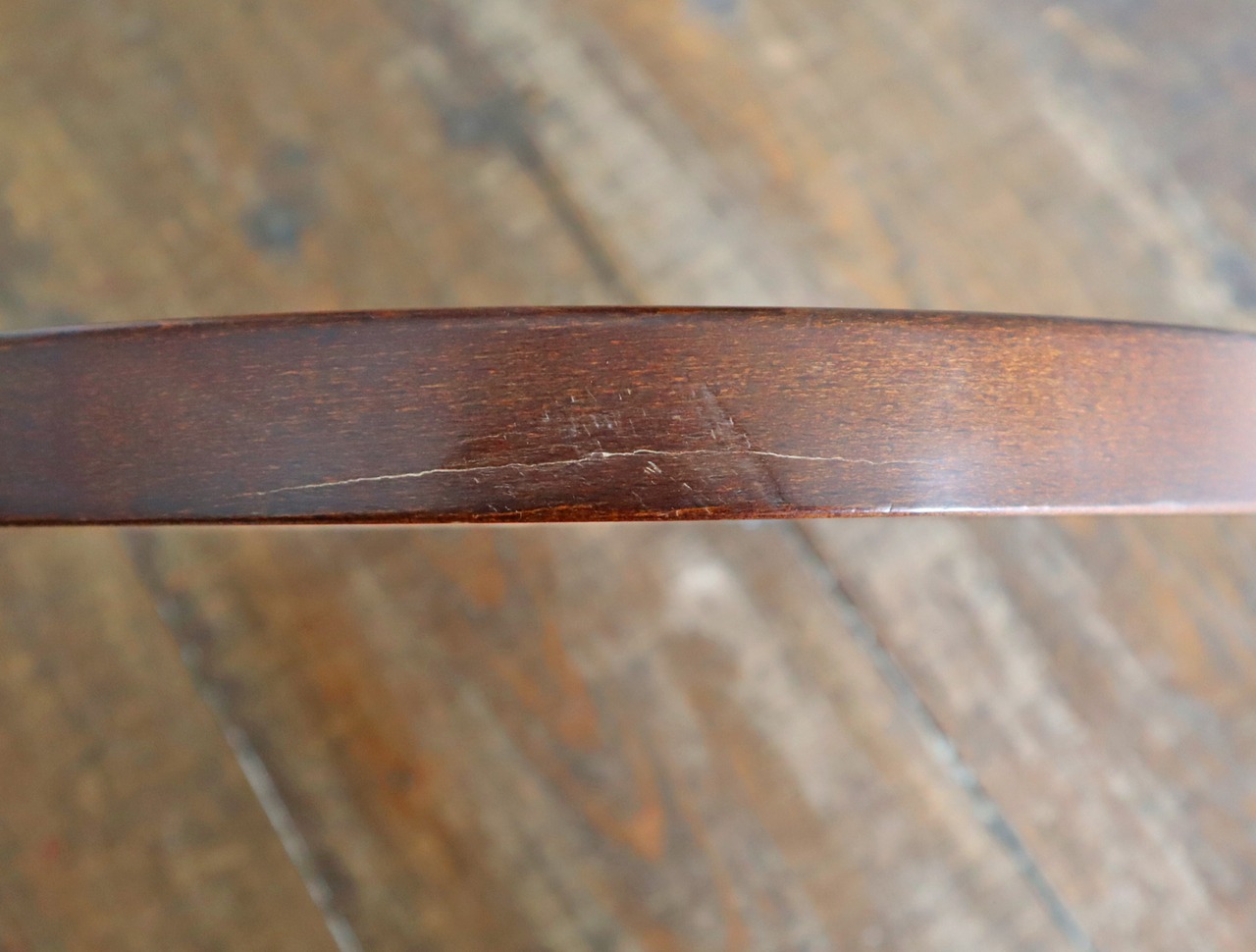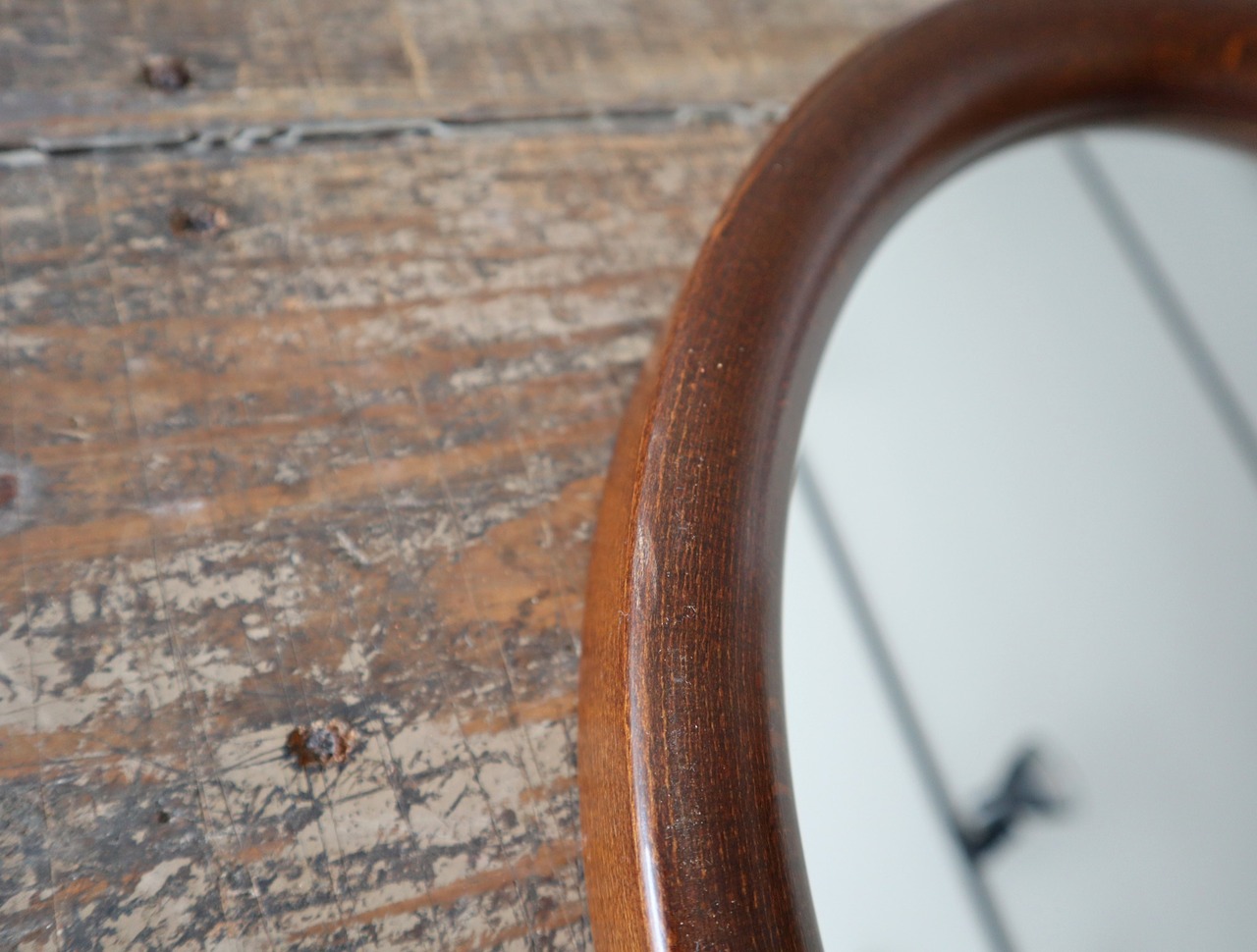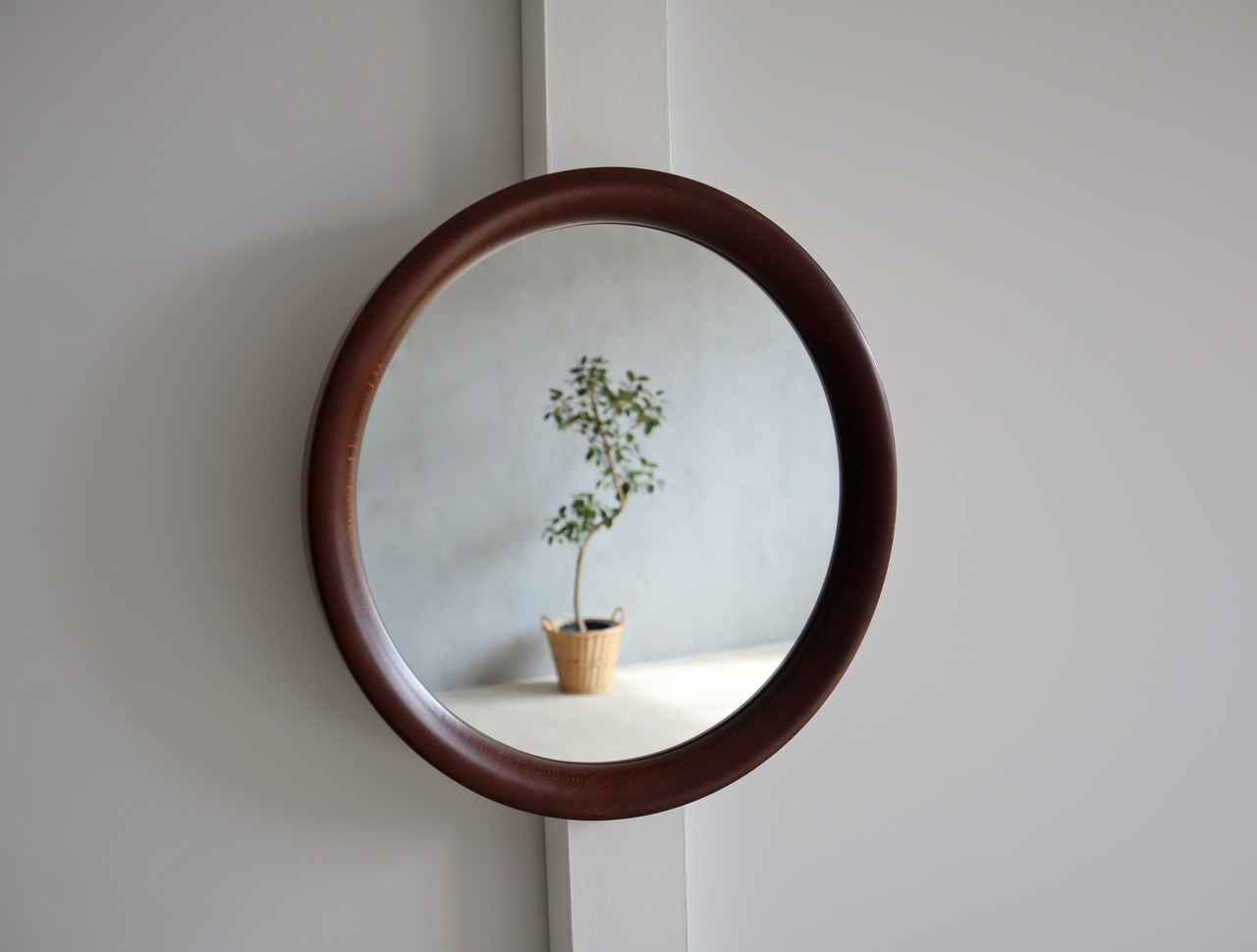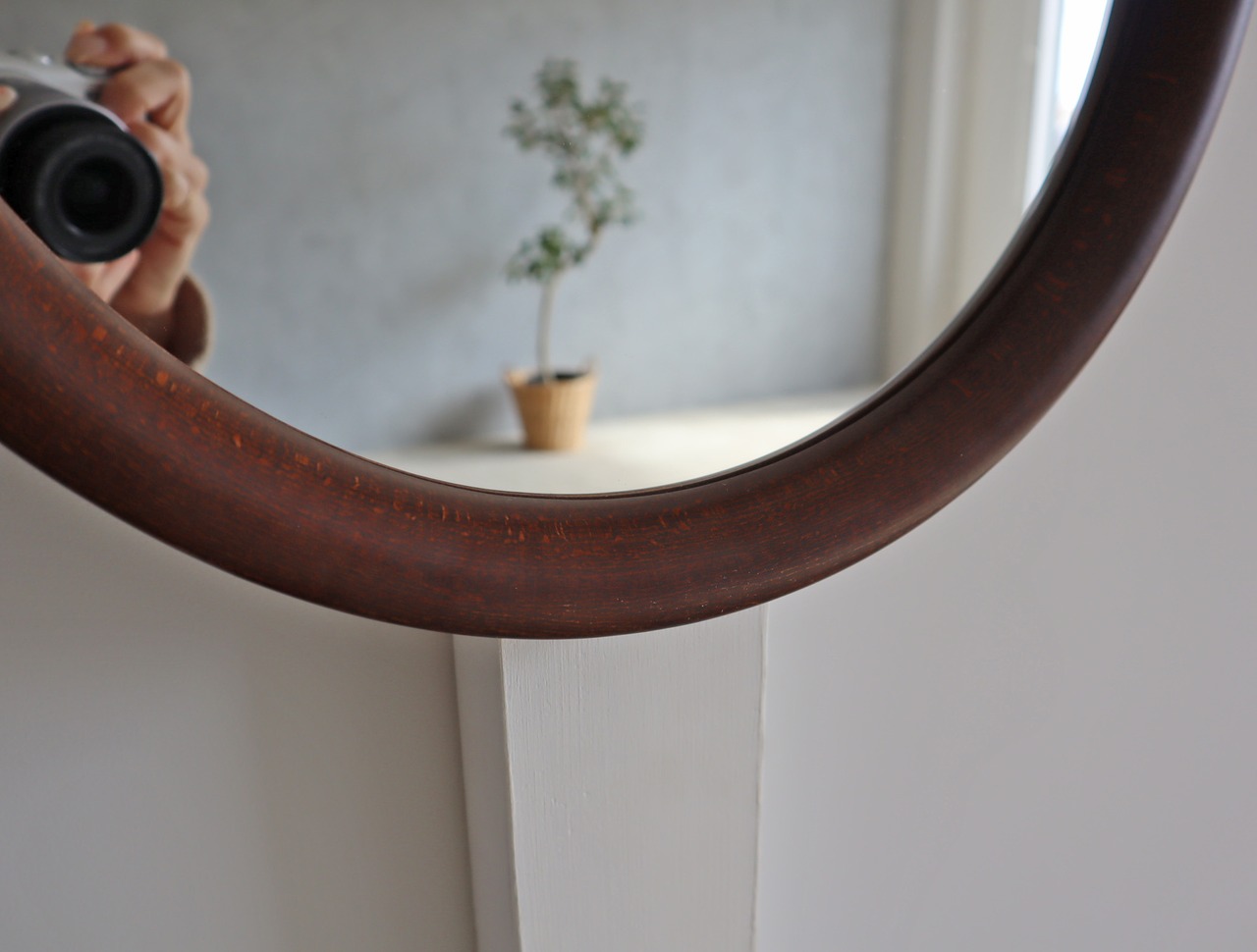 秋田木工のロングセラー、柳宗理デザインの曲木鏡、丸型、小サイズ、古代色の中古品。
