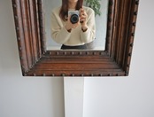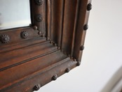 レザー張りの額装とスタッズの組み合わせがクールな装いのヴィンテージミラー。