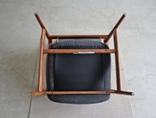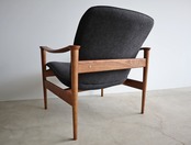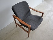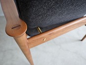 着色されたアッシュ材フレームはひじ掛けの楔留めが意匠となり、ダークグレーファブリックに真鍮のマイナスボルトがアクセントとなった、北欧テイスト色濃い一脚。