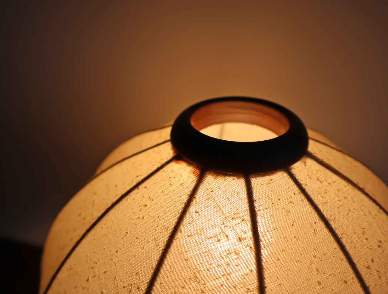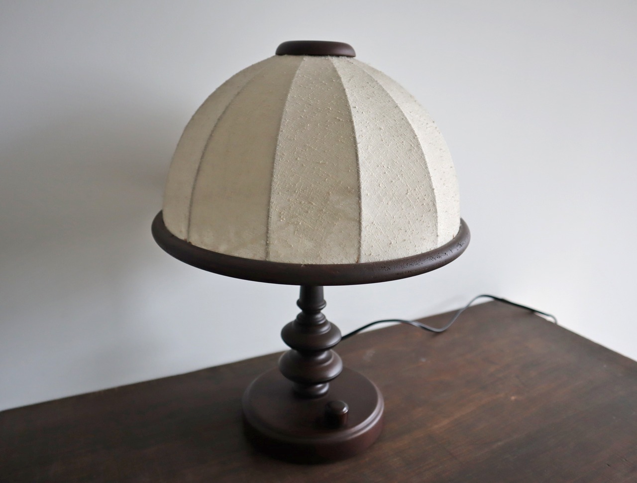 挽き物細工の支柱がベースの中心からずれた独特なフォルム、布張りの半球型シェードは和紙シェードにも似た、ぼんやりとしたオーガニックなあかりを灯します。