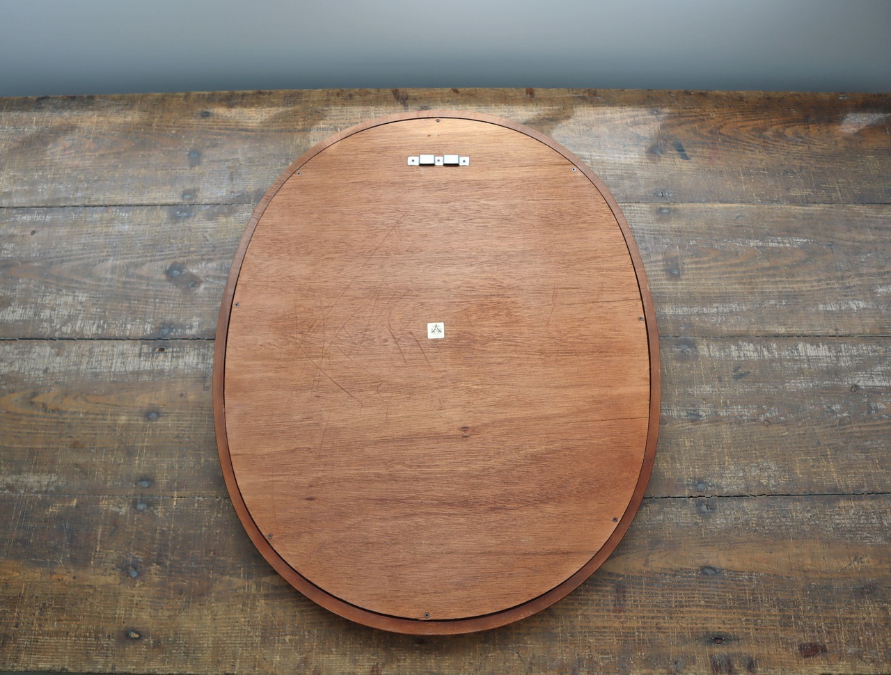 秋田木工のロングセラー、柳宗理デザインの曲木鏡、小判型、大サイズ、古代色の中古品。