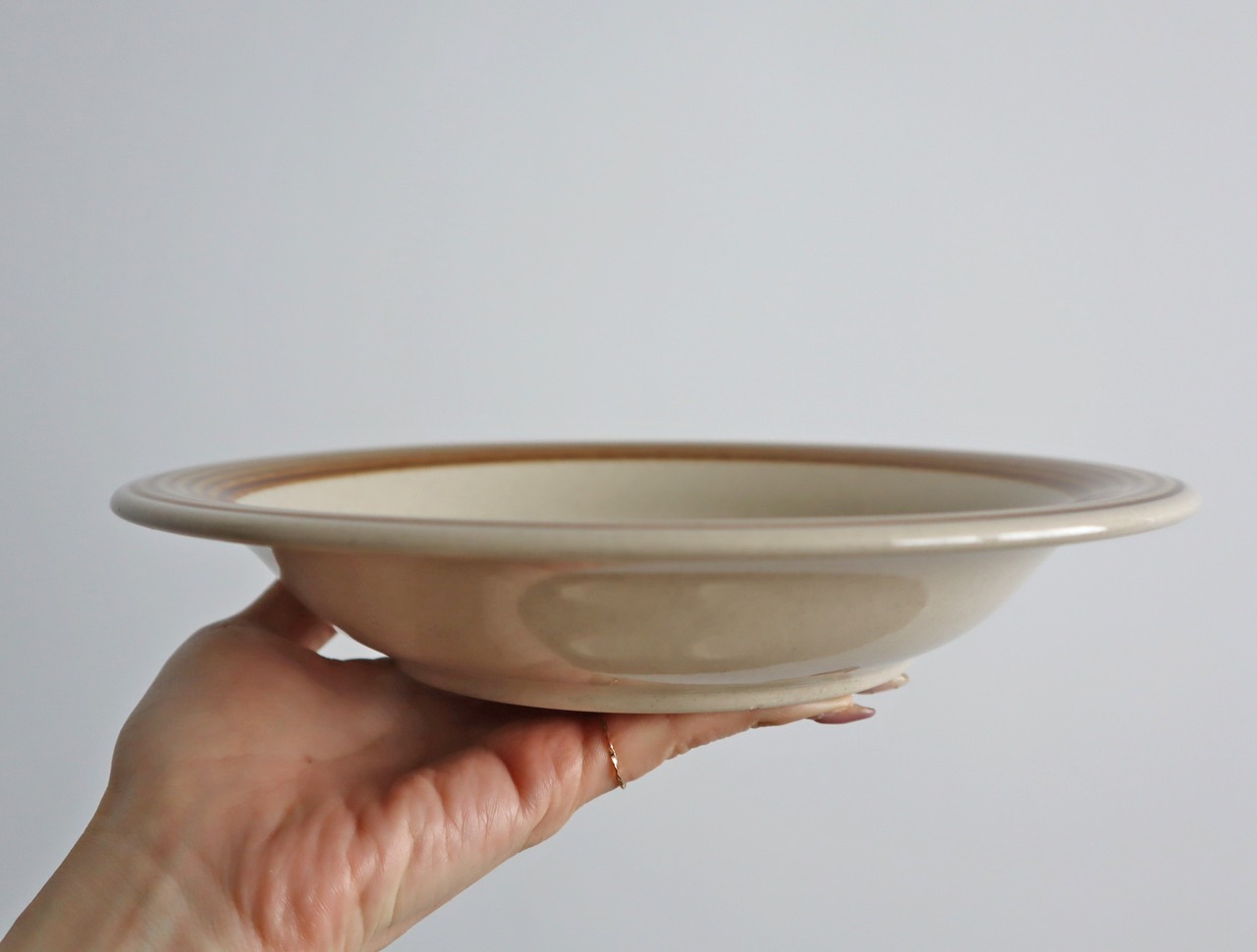 淡いブラウンのリムと、ベージュカラーのベースが柔らかい雰囲気を醸し出す器です。