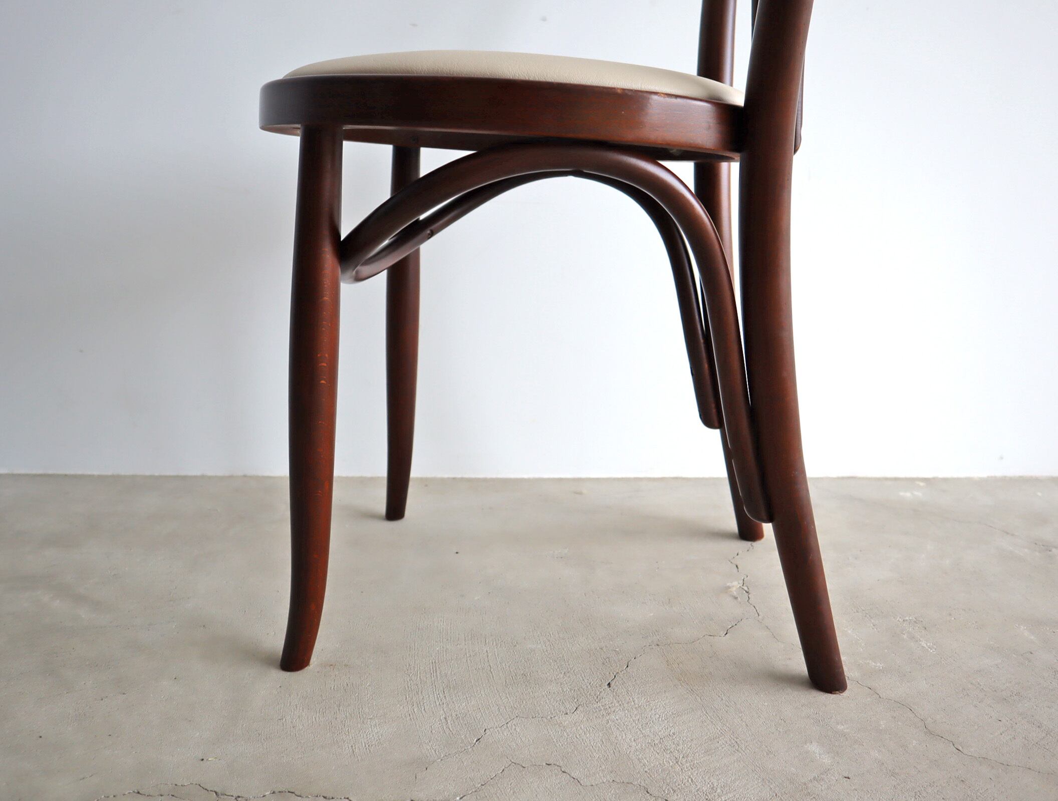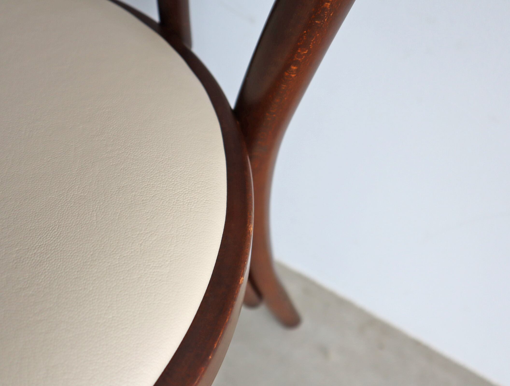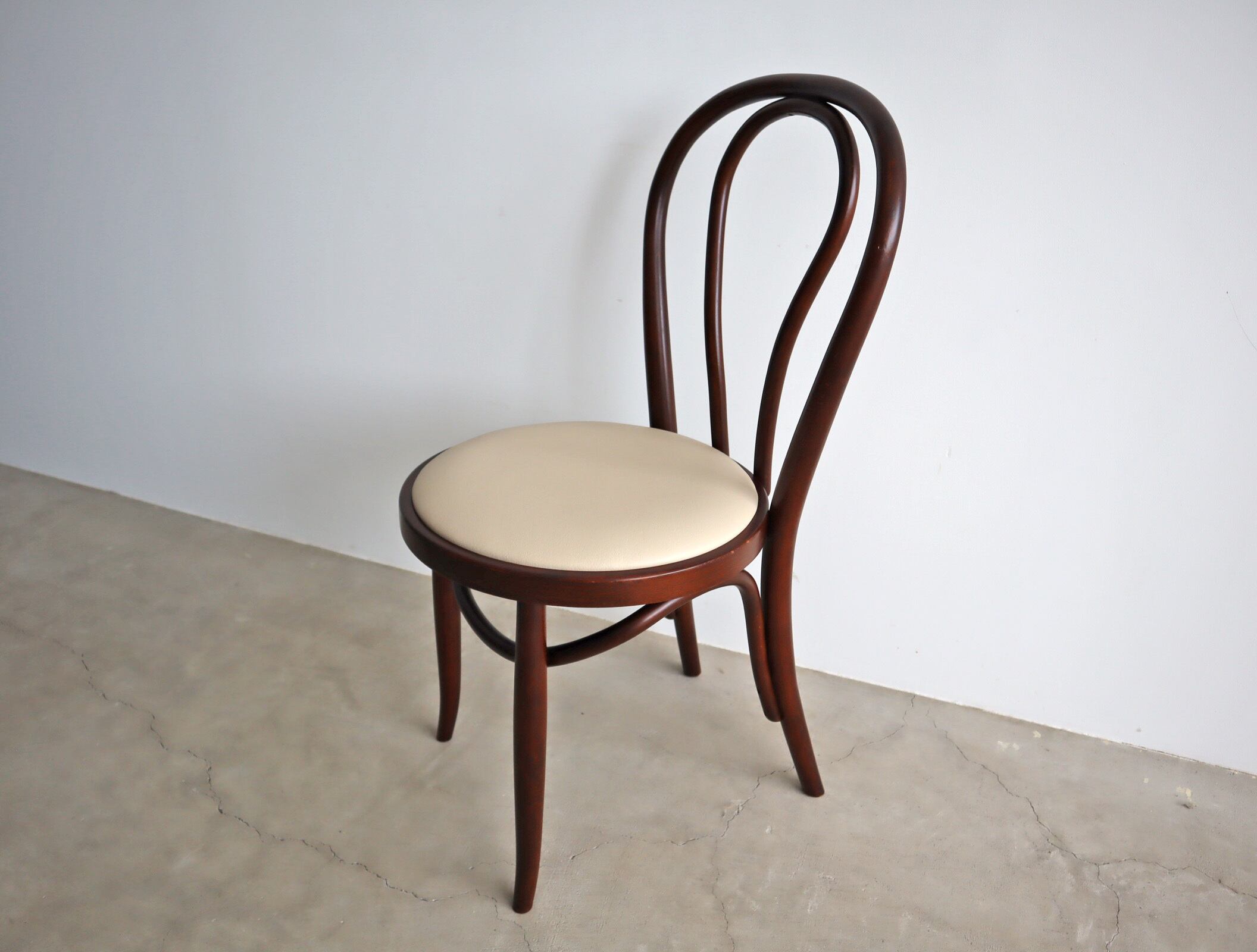 当店で張り替えたアイボリーの座面が、過去と今をやさしくつなぎ、日々の暮らしに馴染みながら、新たな物語を紡いでくれる1脚です。