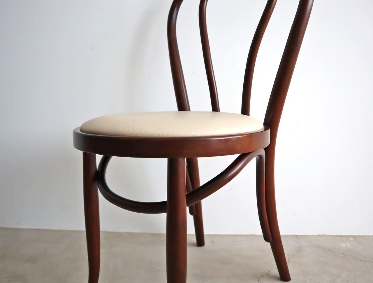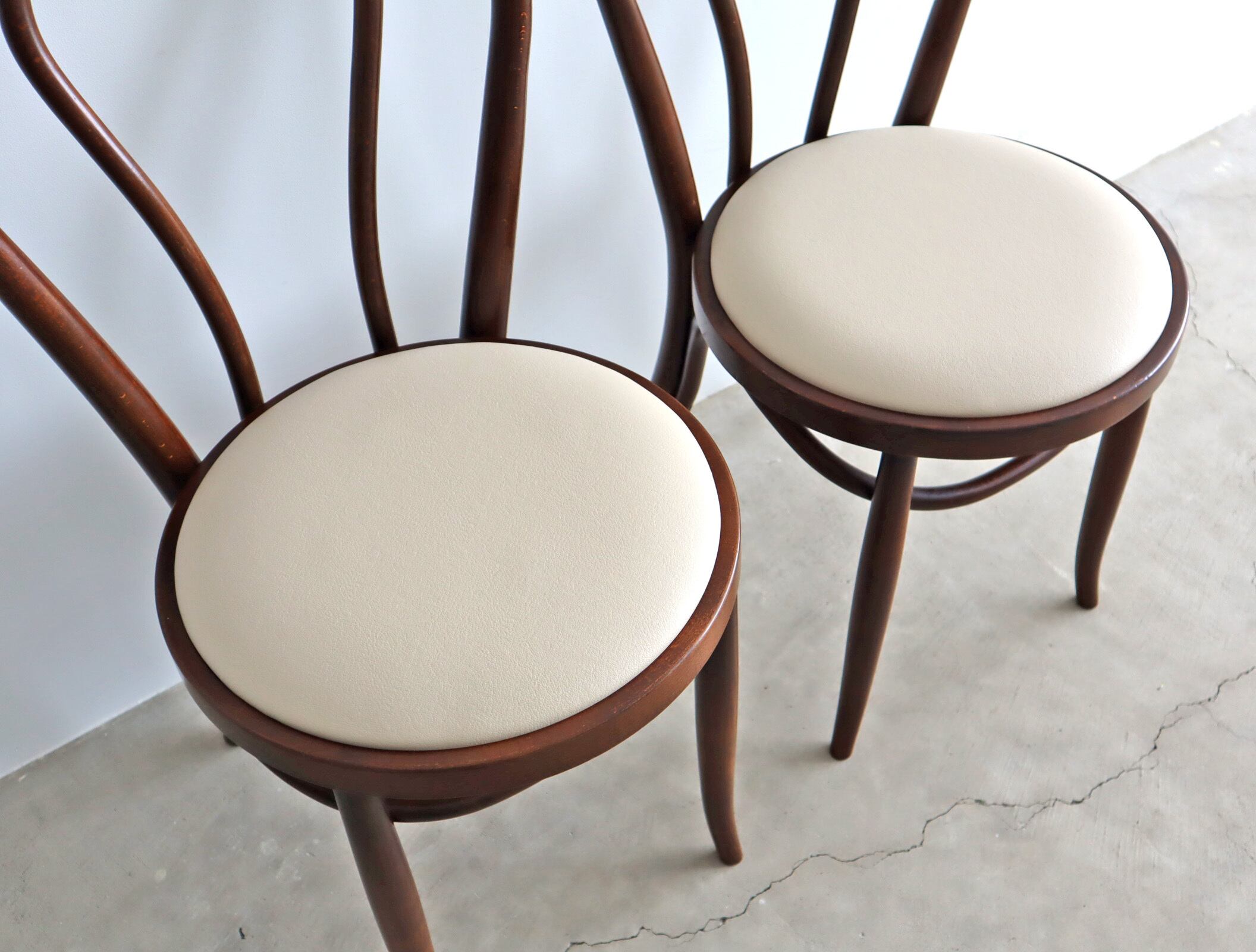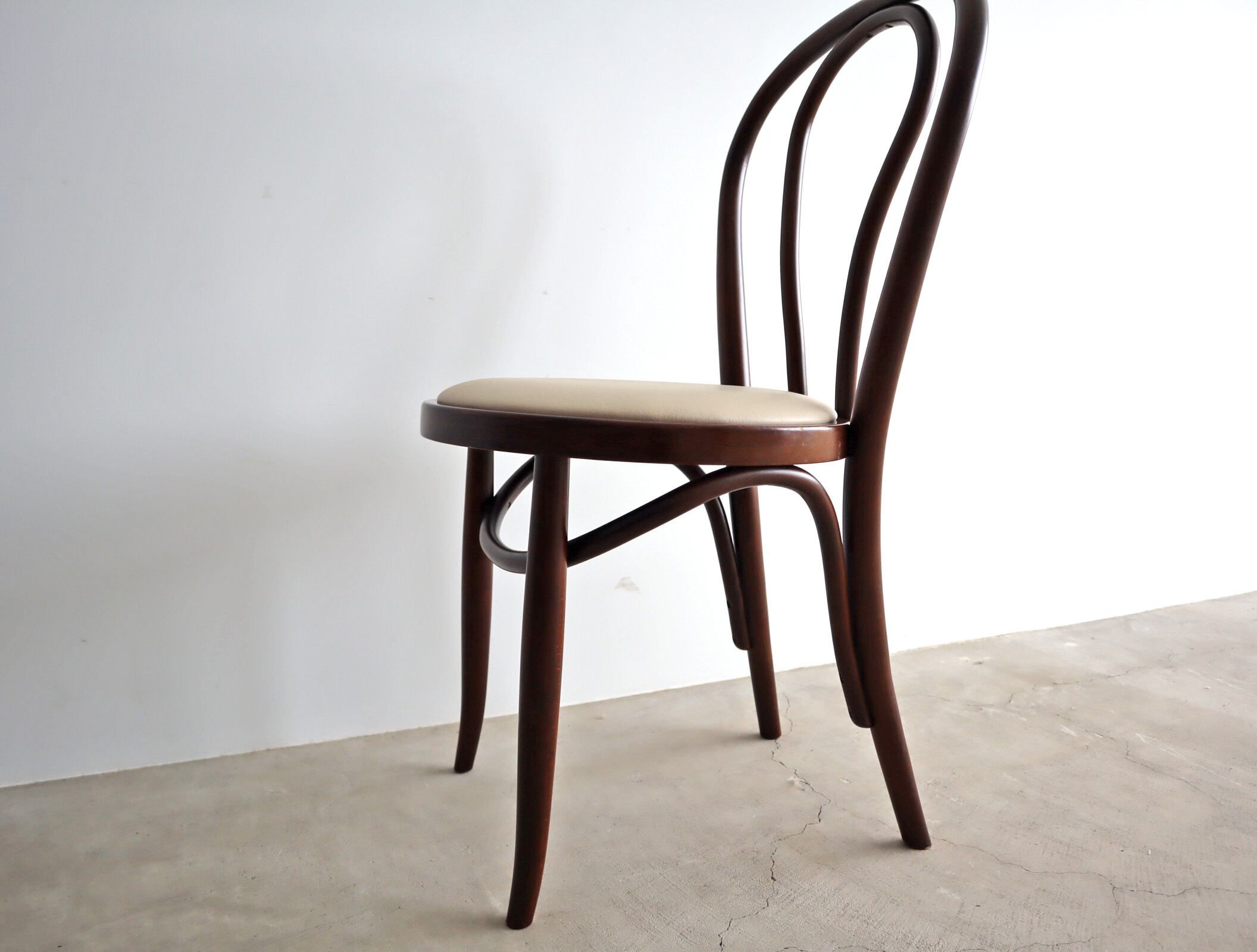 当店で張り替えたアイボリーの座面が、過去と今をやさしくつなぎ、日々の暮らしに馴染みながら、新たな物語を紡いでくれる1脚です。