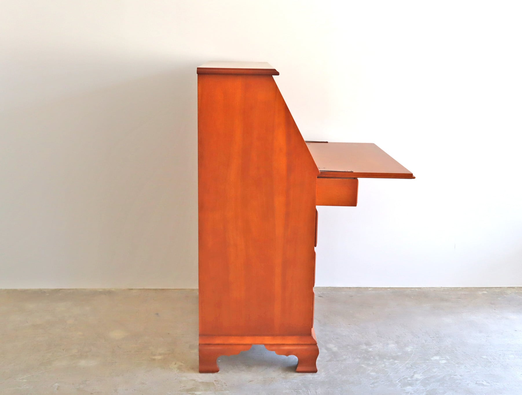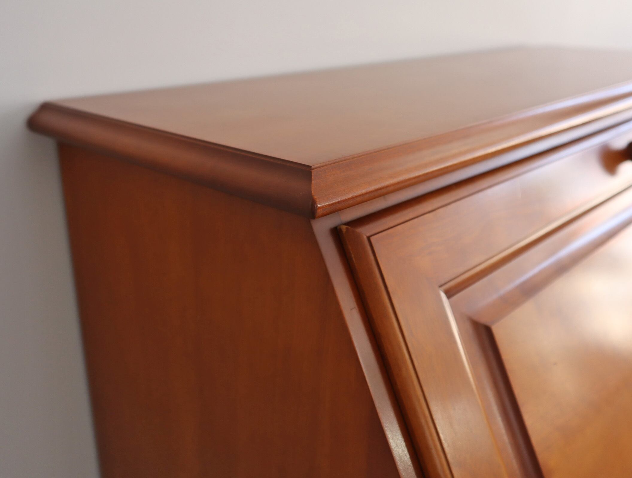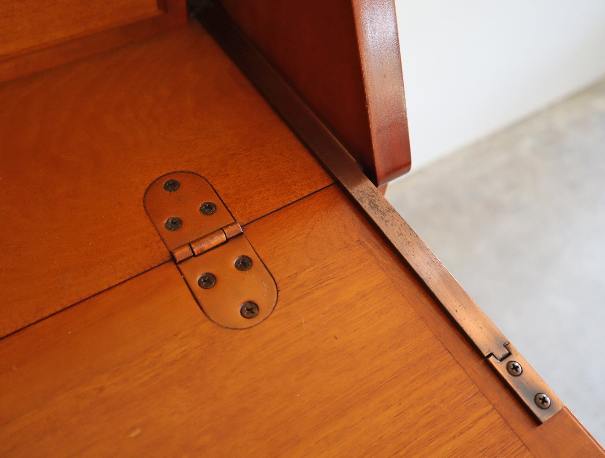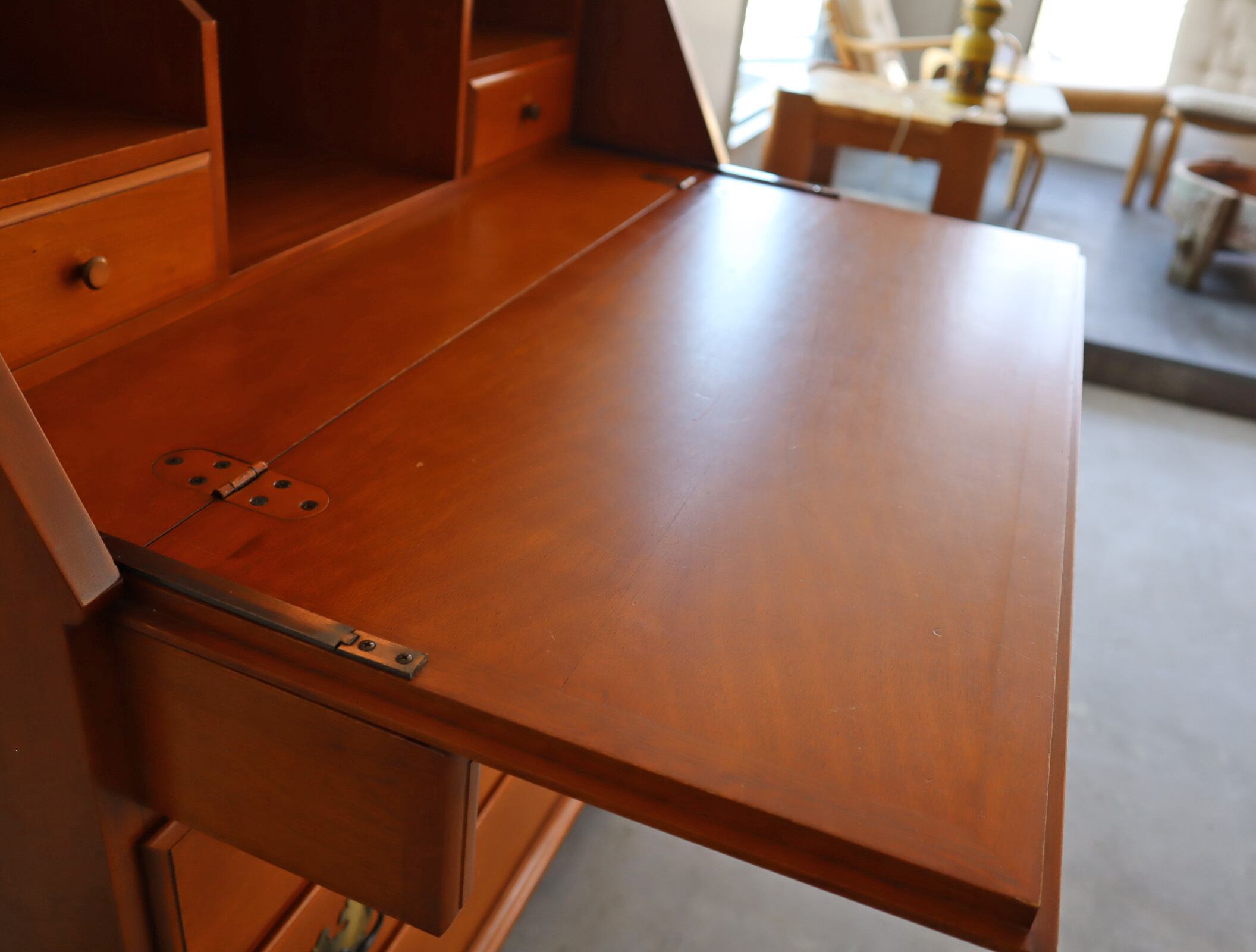 職人の手仕事ならではの繊細な面取り、クラシックな真鍮の取手、そして、天板面を倒すと現れる静かな作業空間。