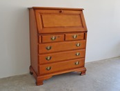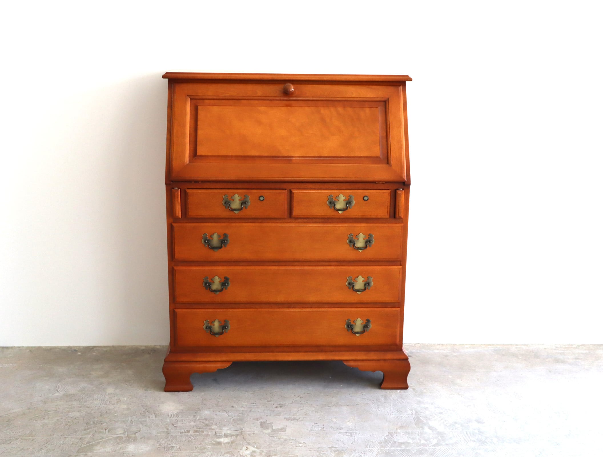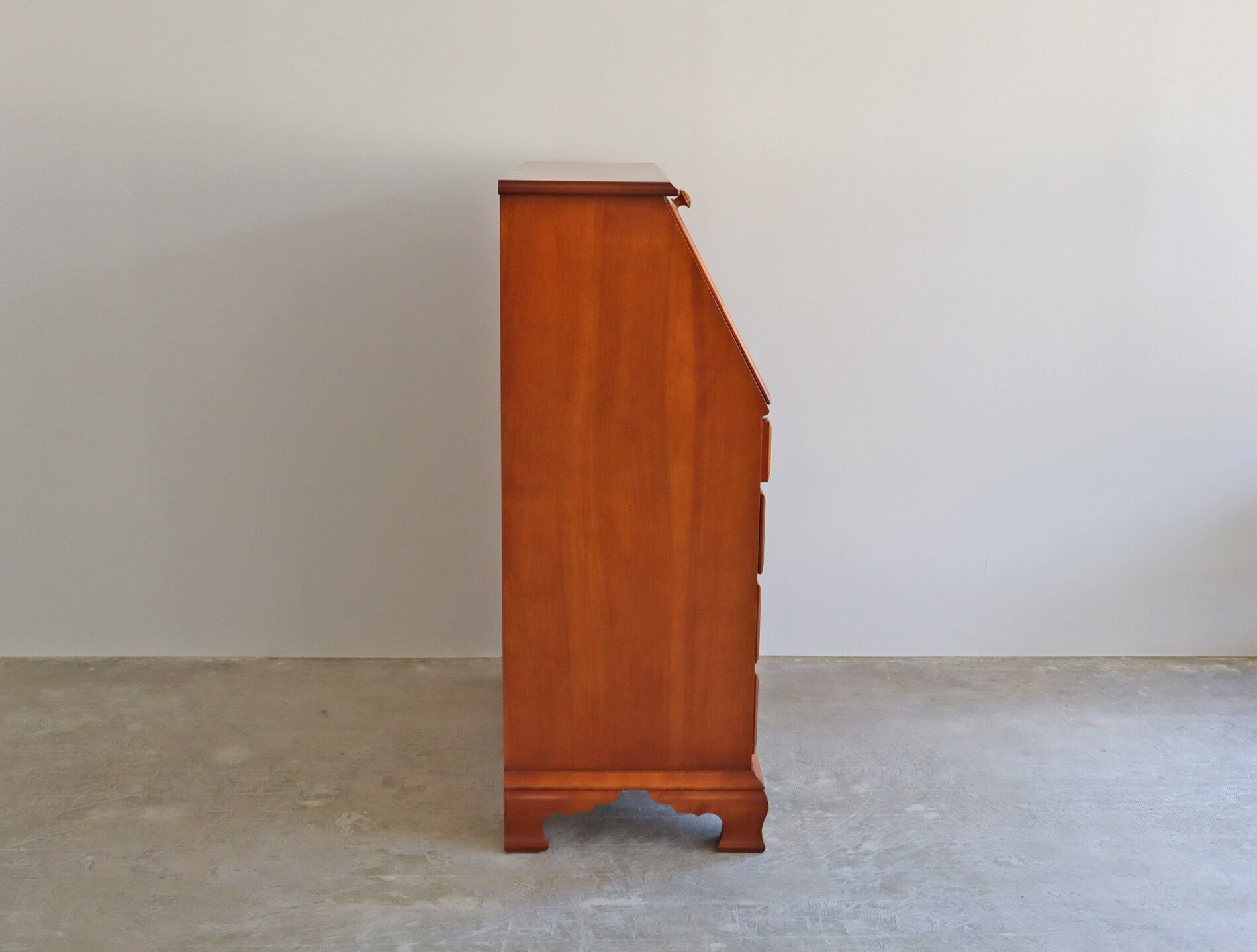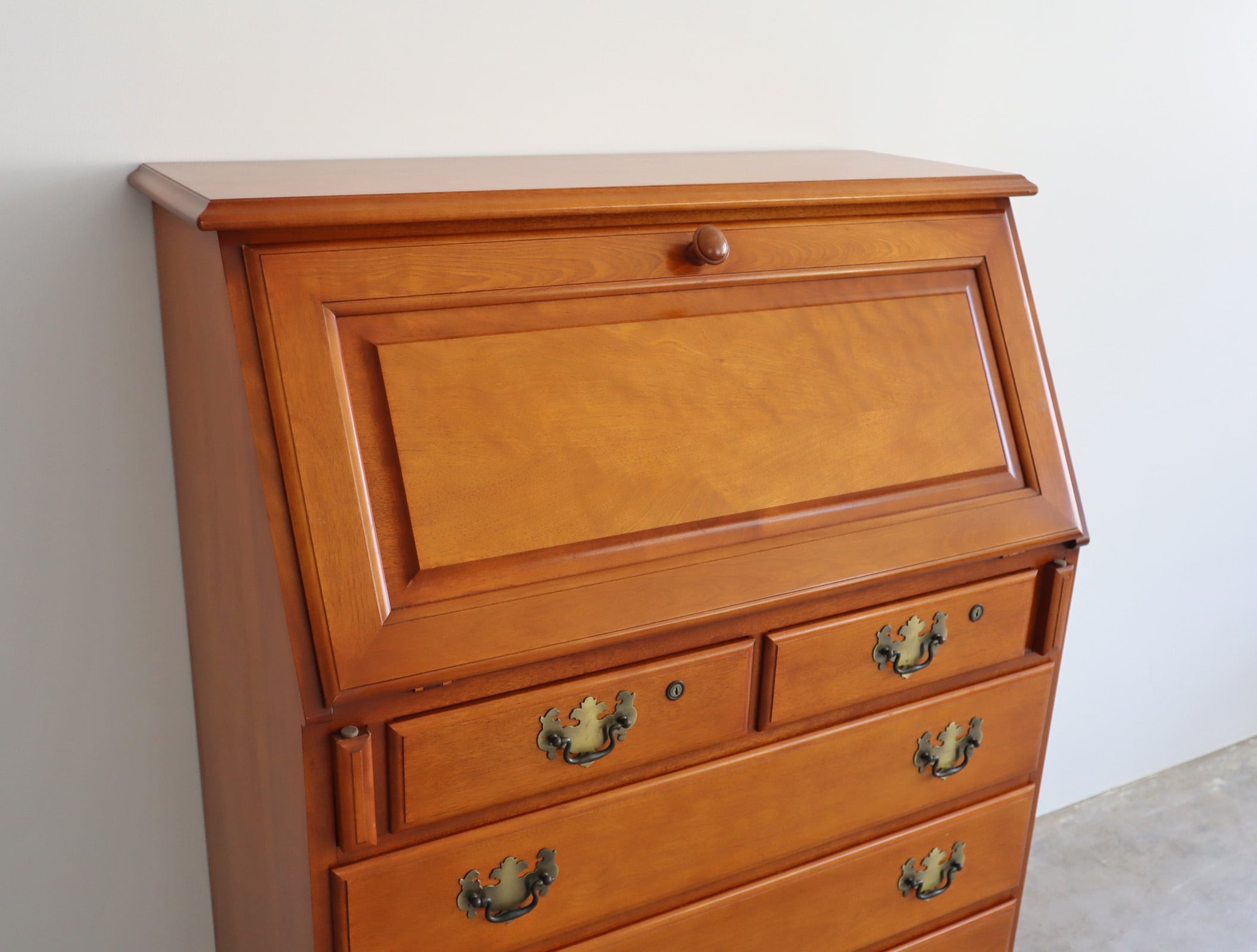 職人の手仕事ならではの繊細な面取り、クラシックな真鍮の取手、そして、天板面を倒すと現れる静かな作業空間。