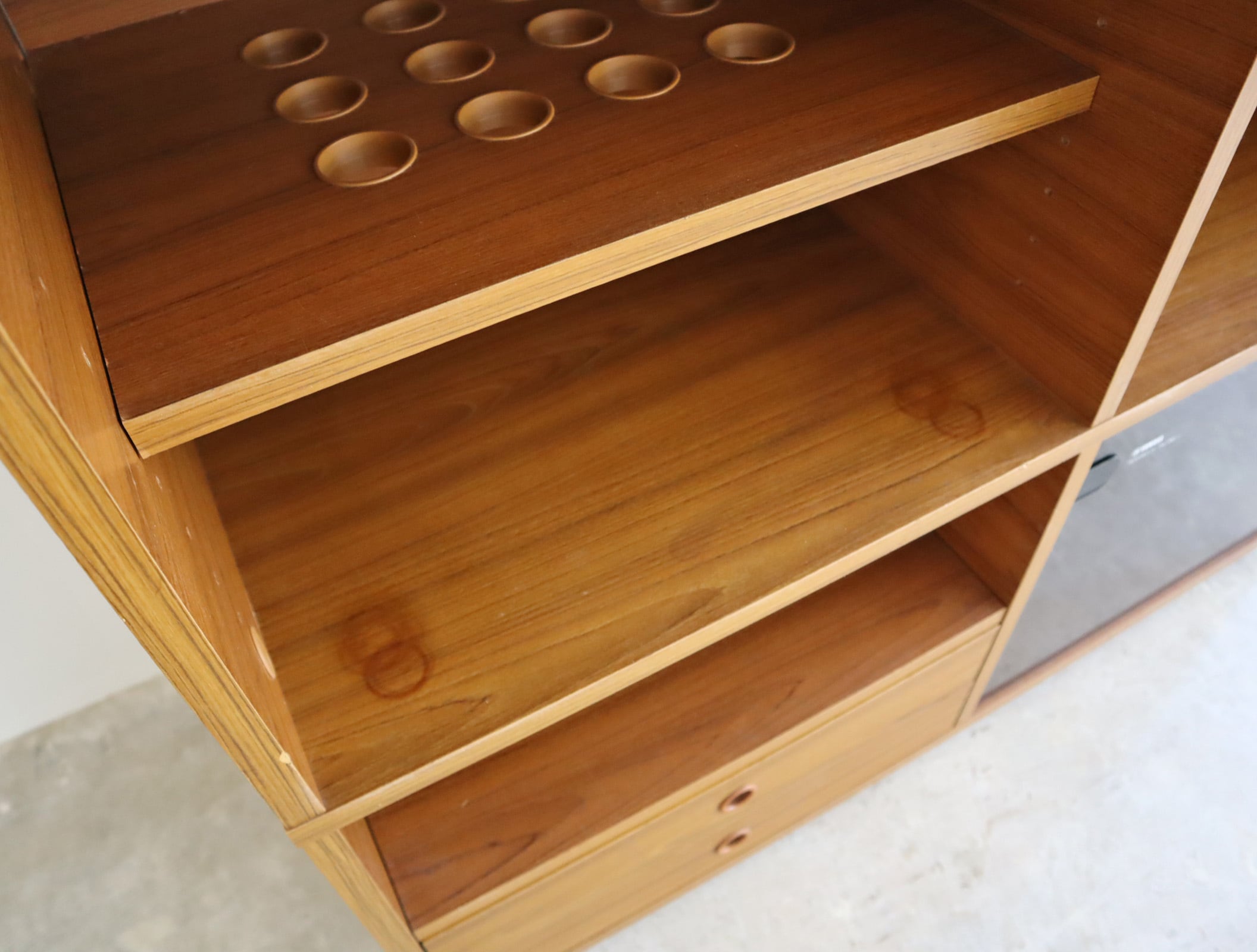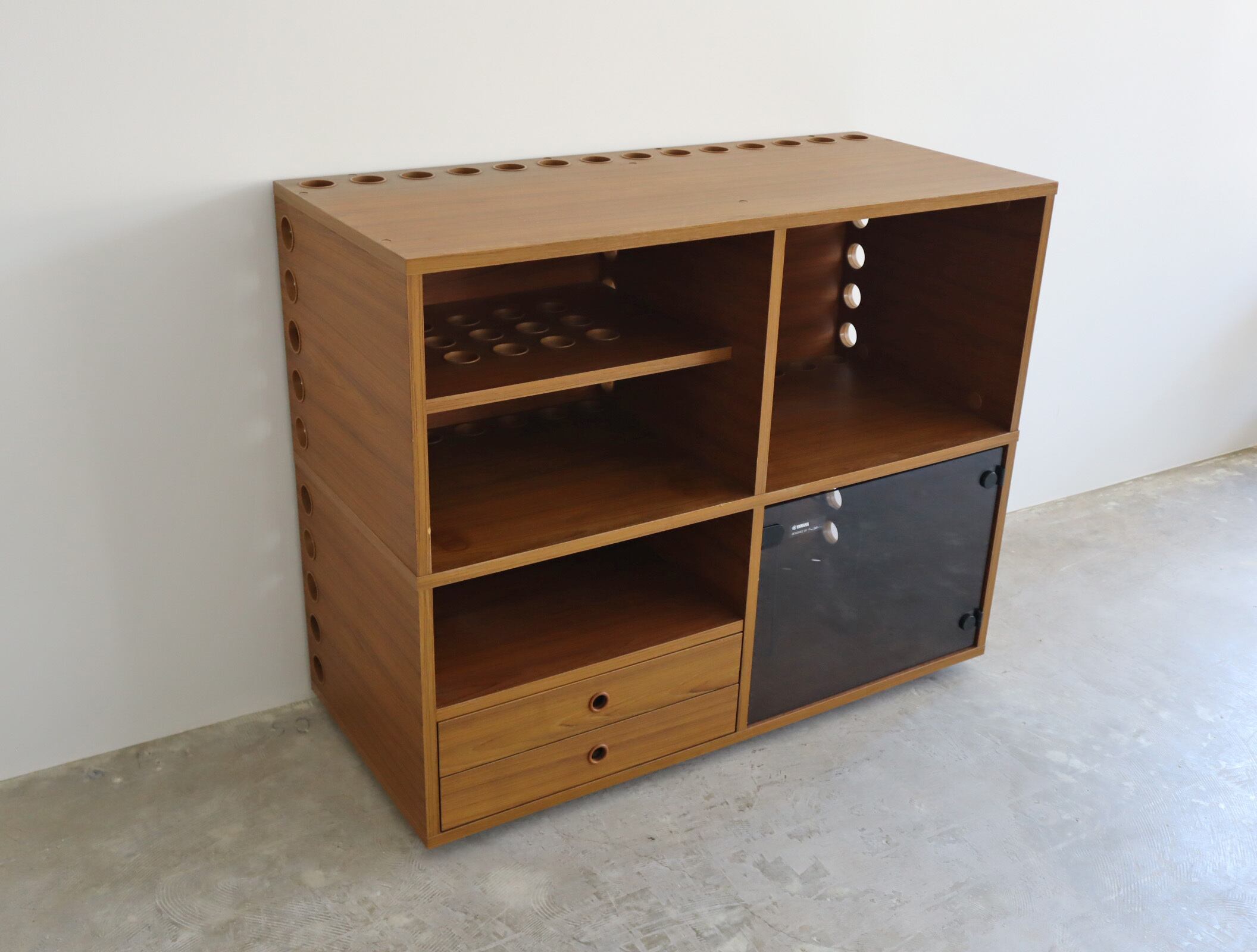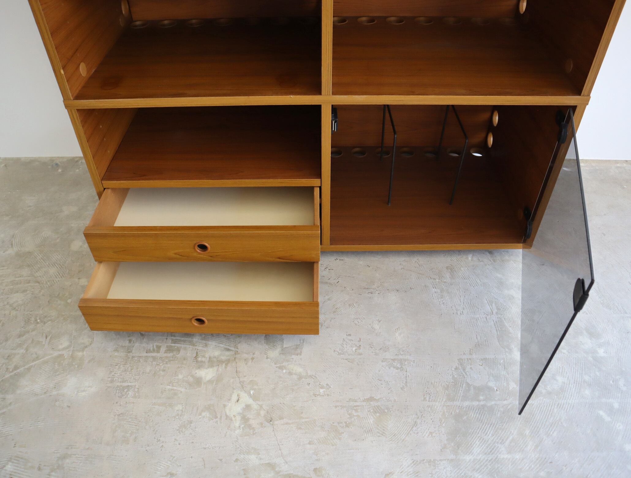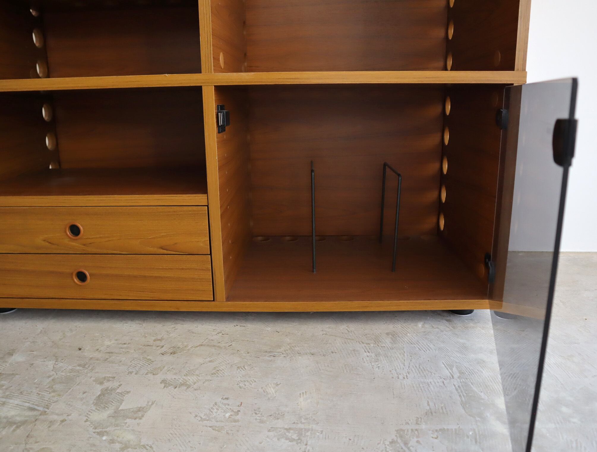 右下のガラス扉のラックは、レコードを立てて収納できるように仕切りがついており、左上の棚板は可動式、右上に移動することも外すことも可能。