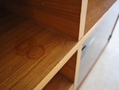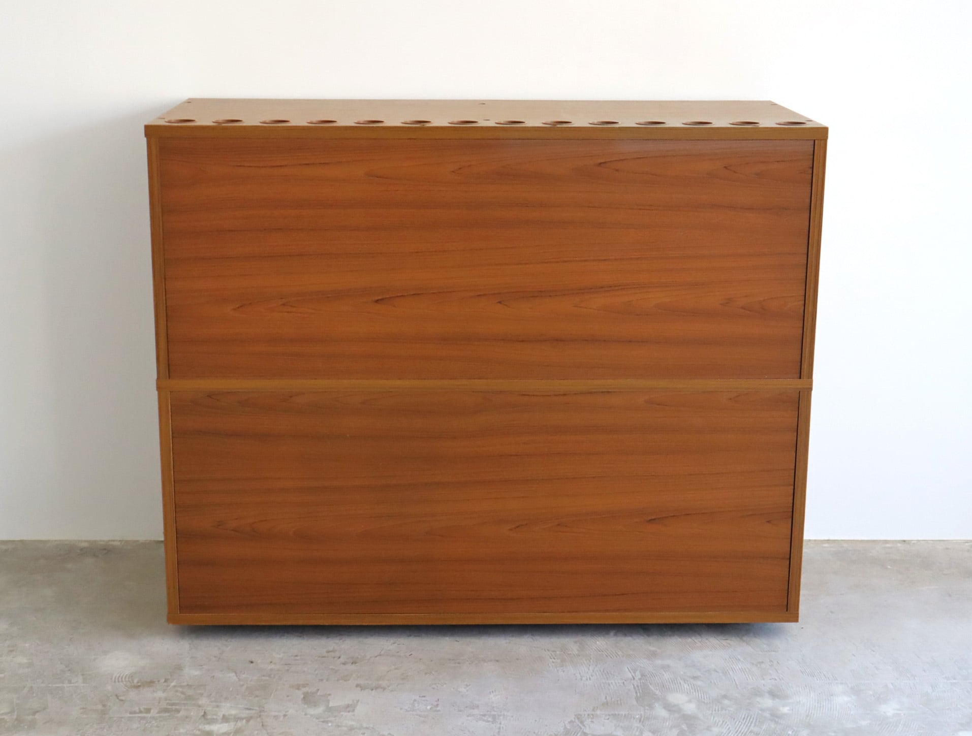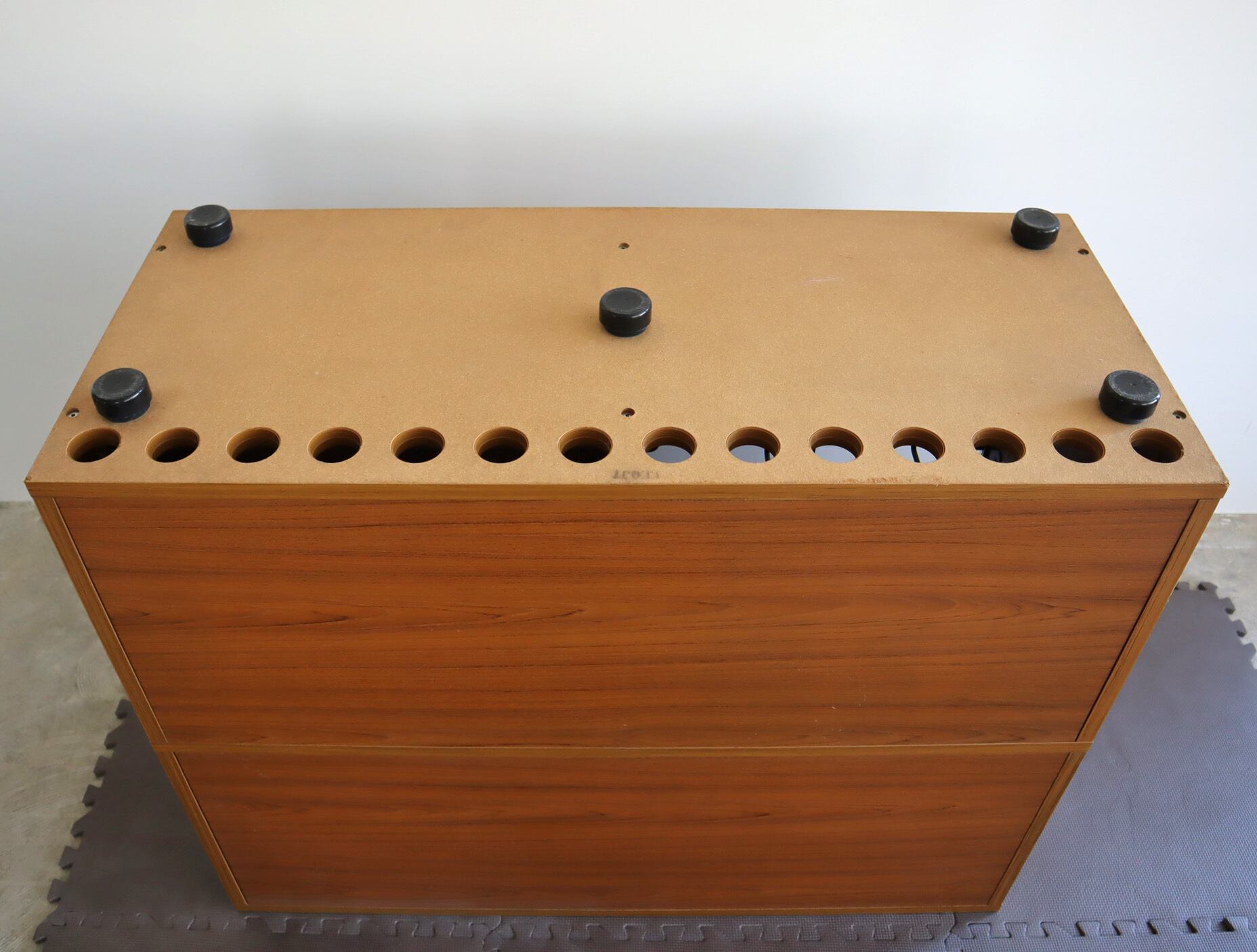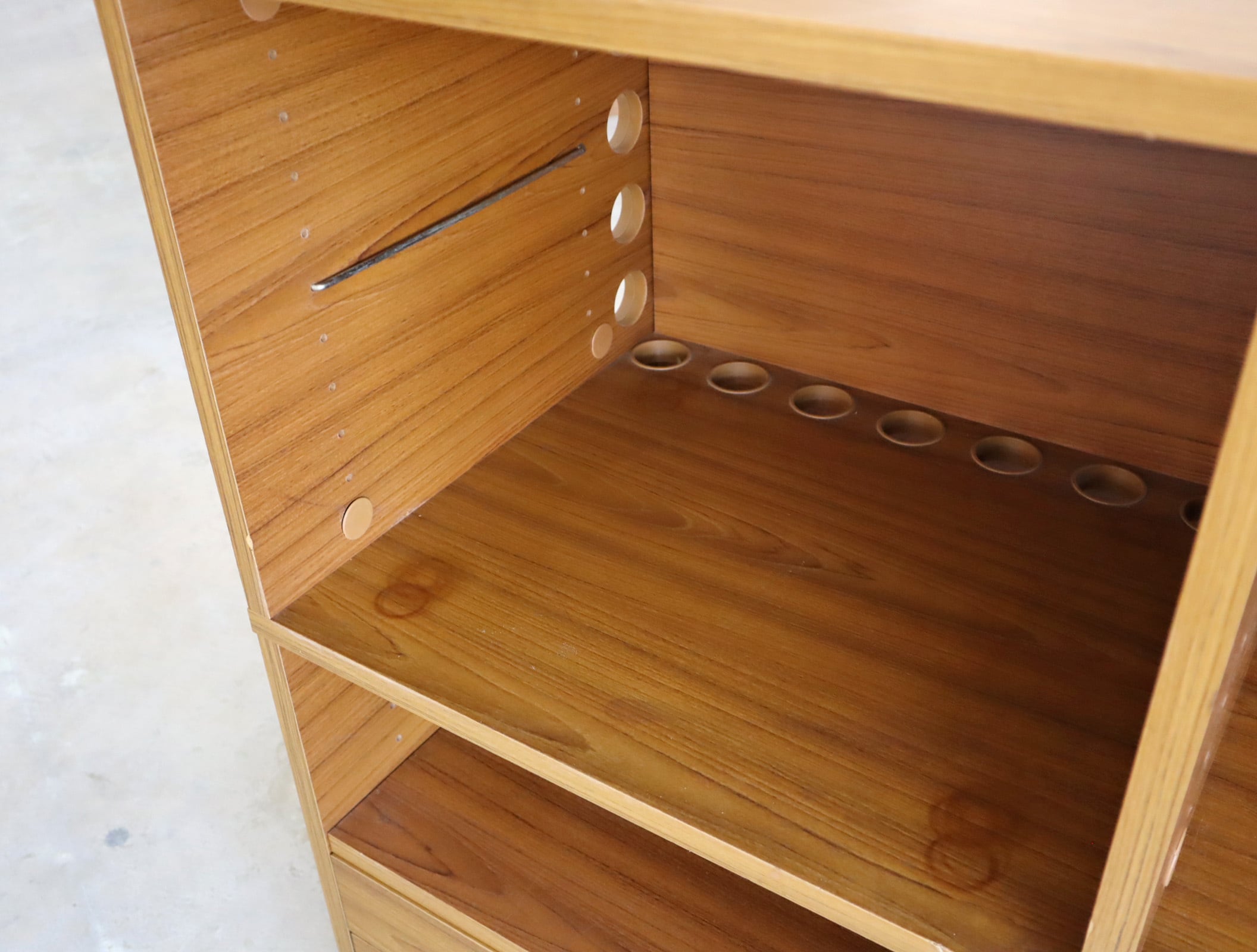 右下のガラス扉のラックは、レコードを立てて収納できるように仕切りがついており、左上の棚板は可動式、右上に移動することも外すことも可能。