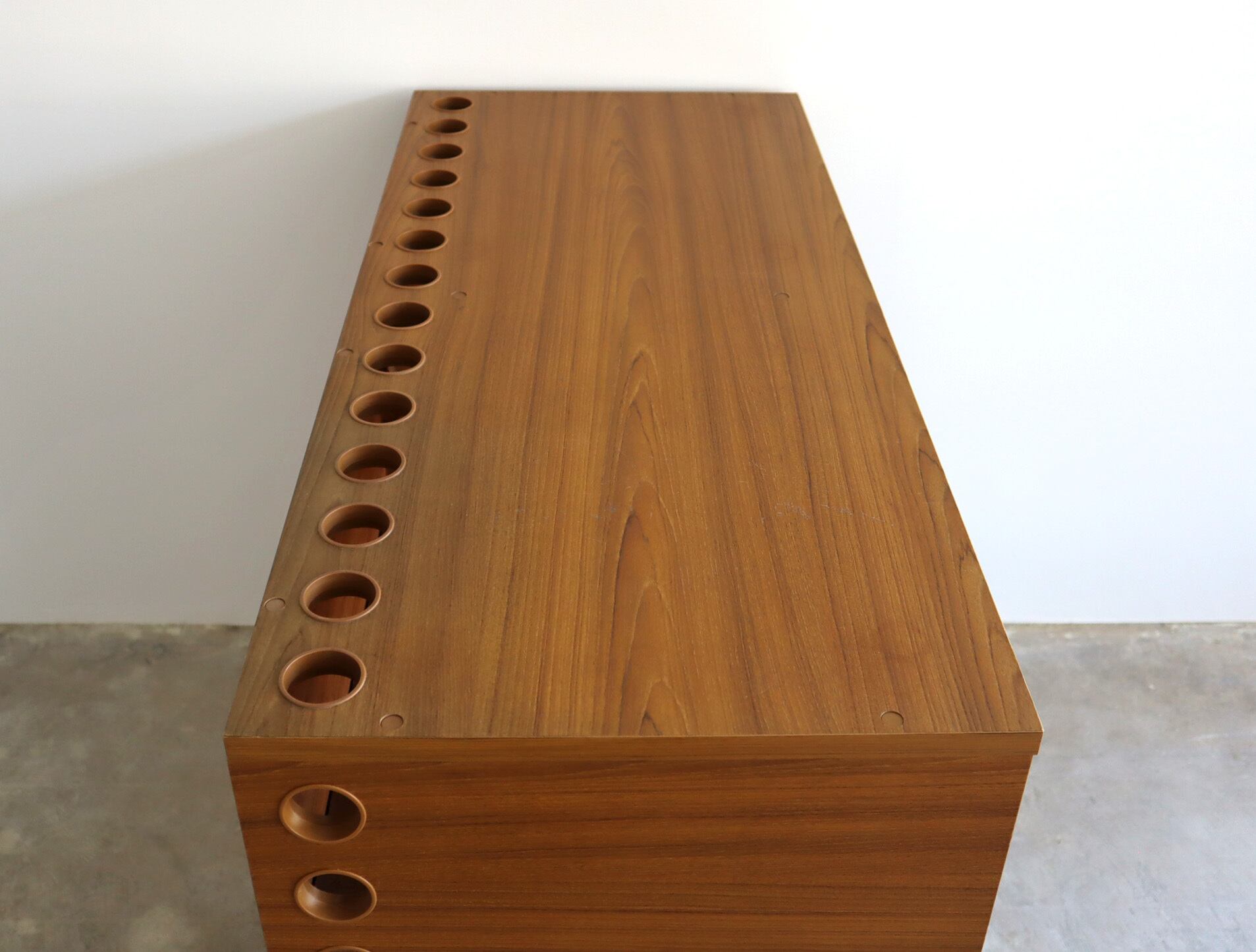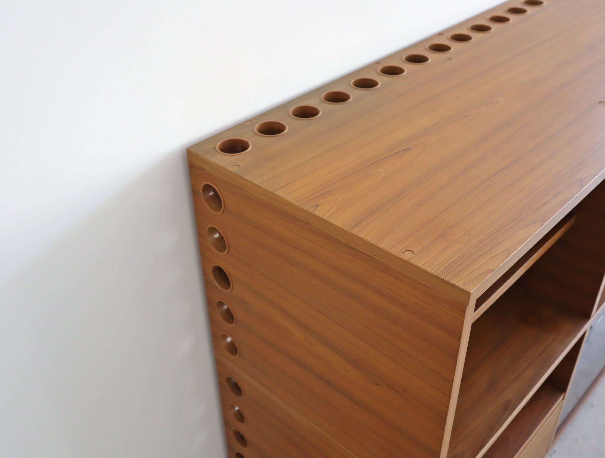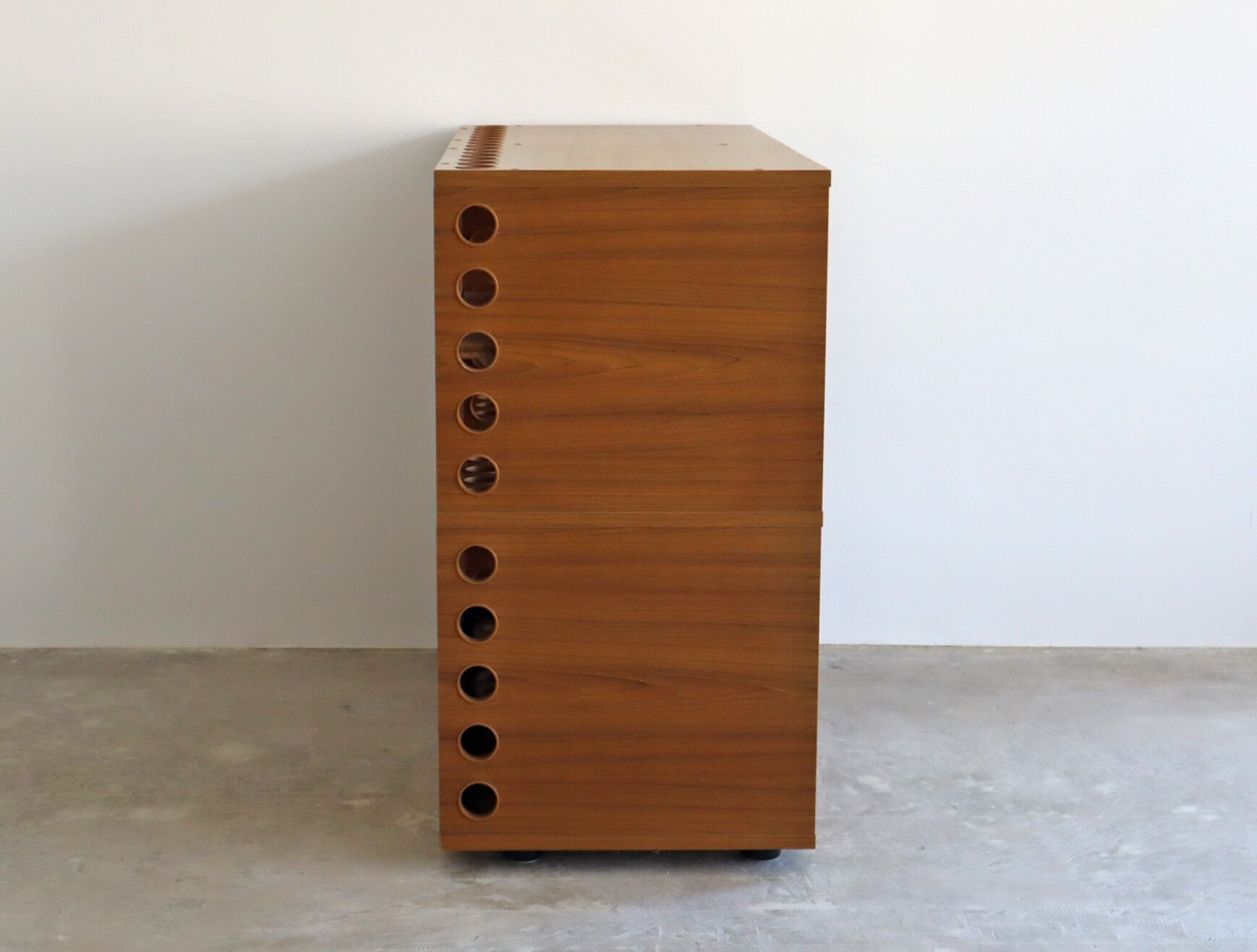 熱の放散と配線を通すための穴がデザインポイントにもなっており、機能をデザインに落とし込んだ、イタリアンモダンらしいオーディオラックになっています。