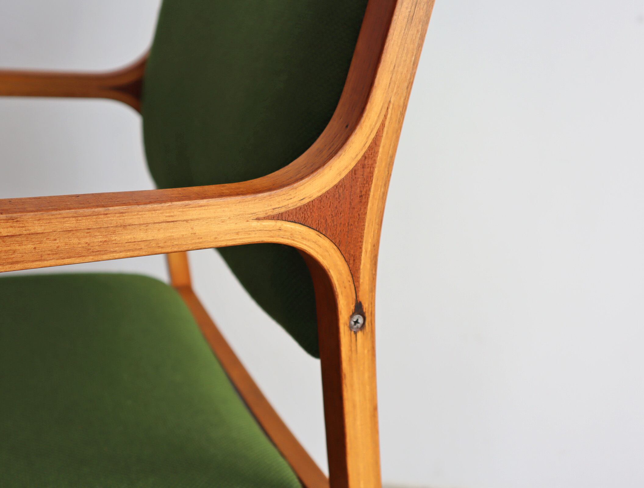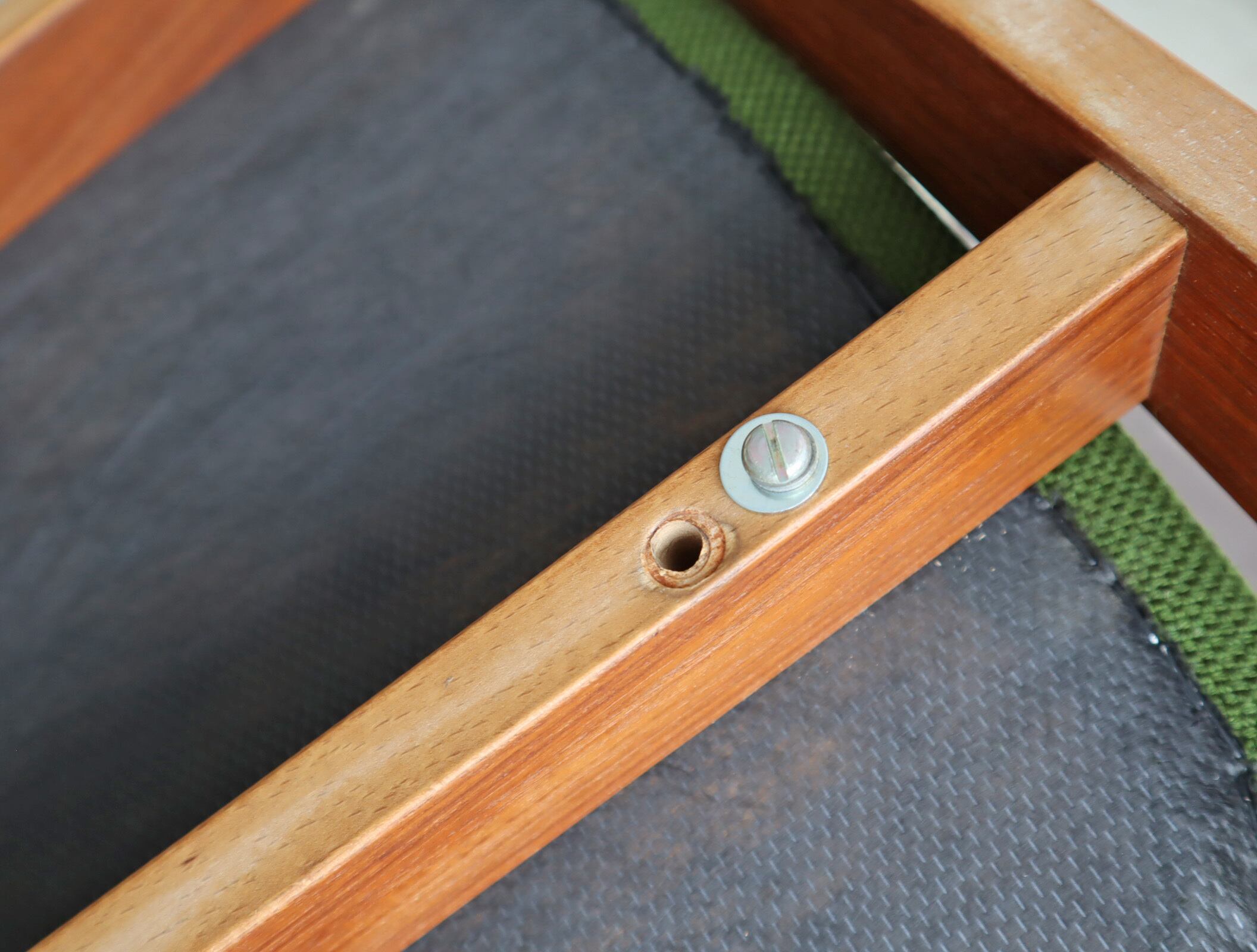 表面材に今では希少価値の高い木目の美しいチーク材を使用しており、モスグリーンで張り替えたファブリックとのコントラストが美しい北欧テイスト色濃い仕上がり。