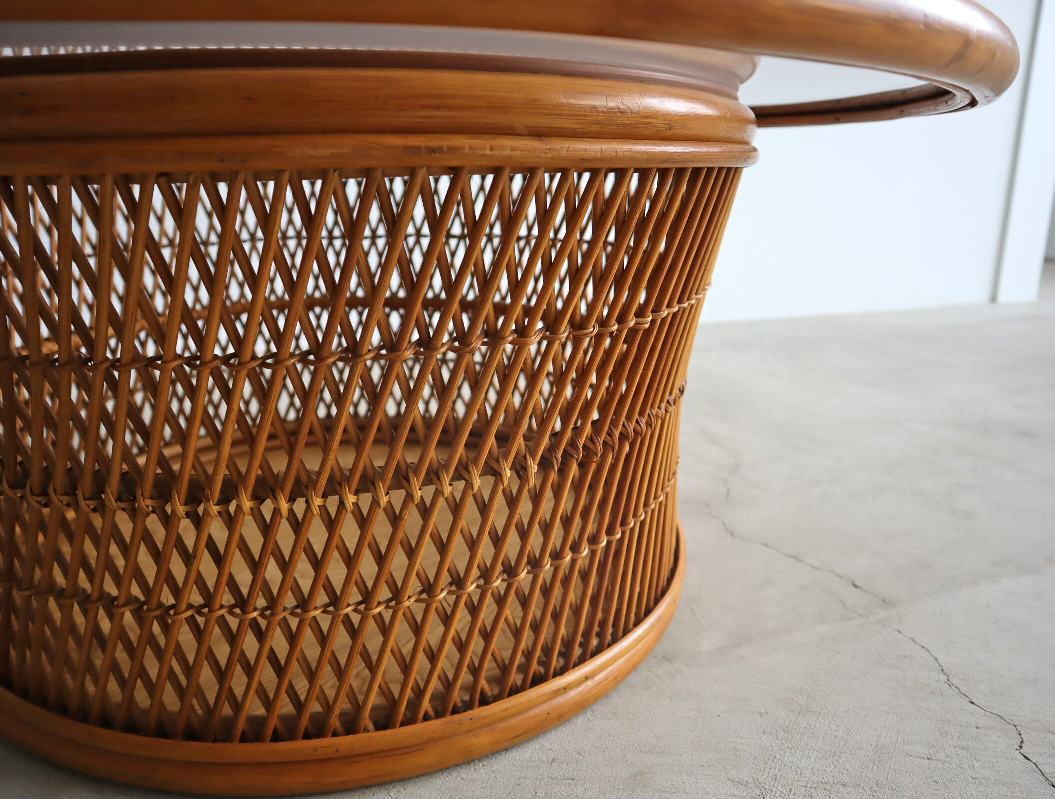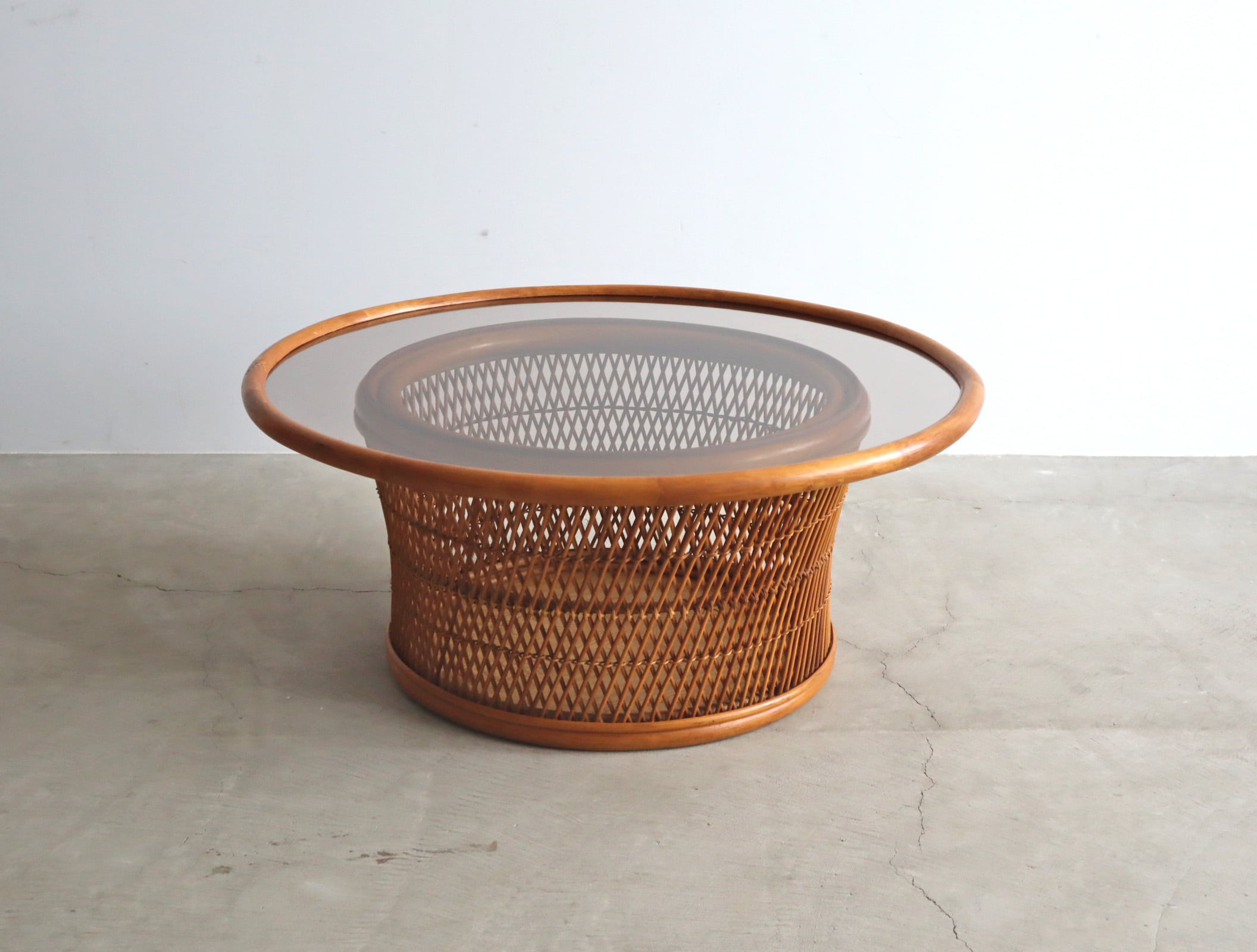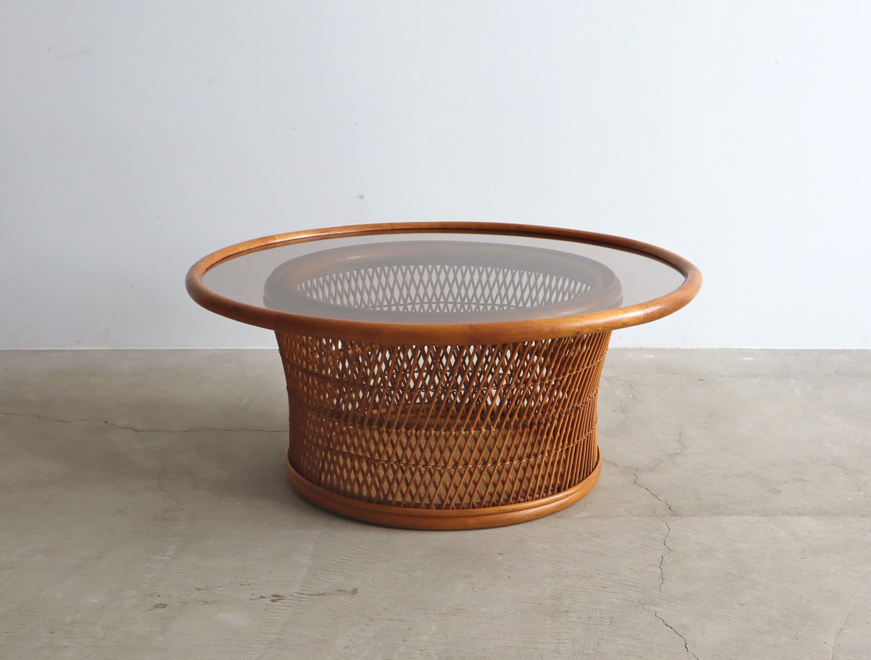 柔らかなラタンの編み込みと、透明感のあるアンバーカラーのガラス天板が美しく調和したラウンドセンターテーブル。