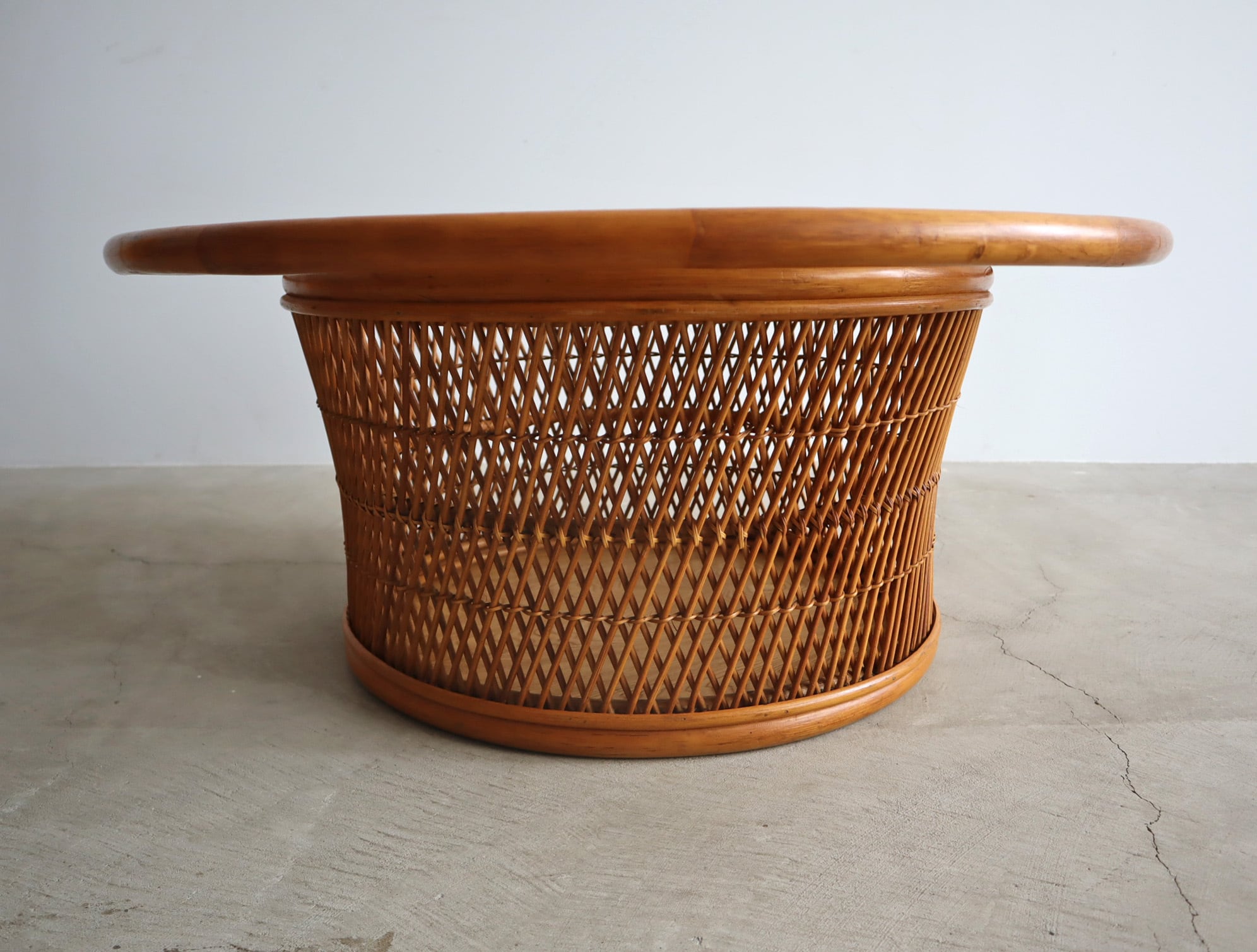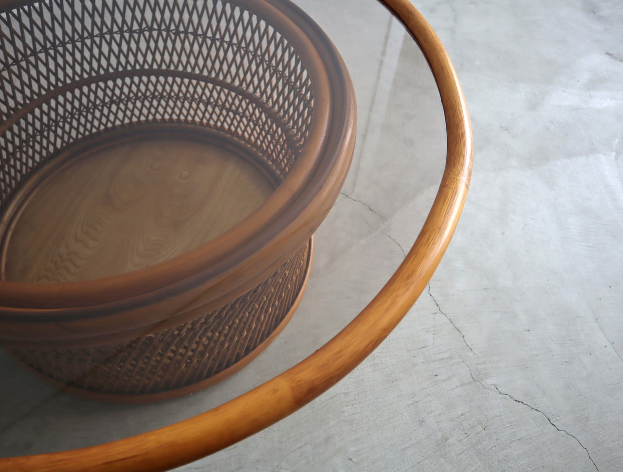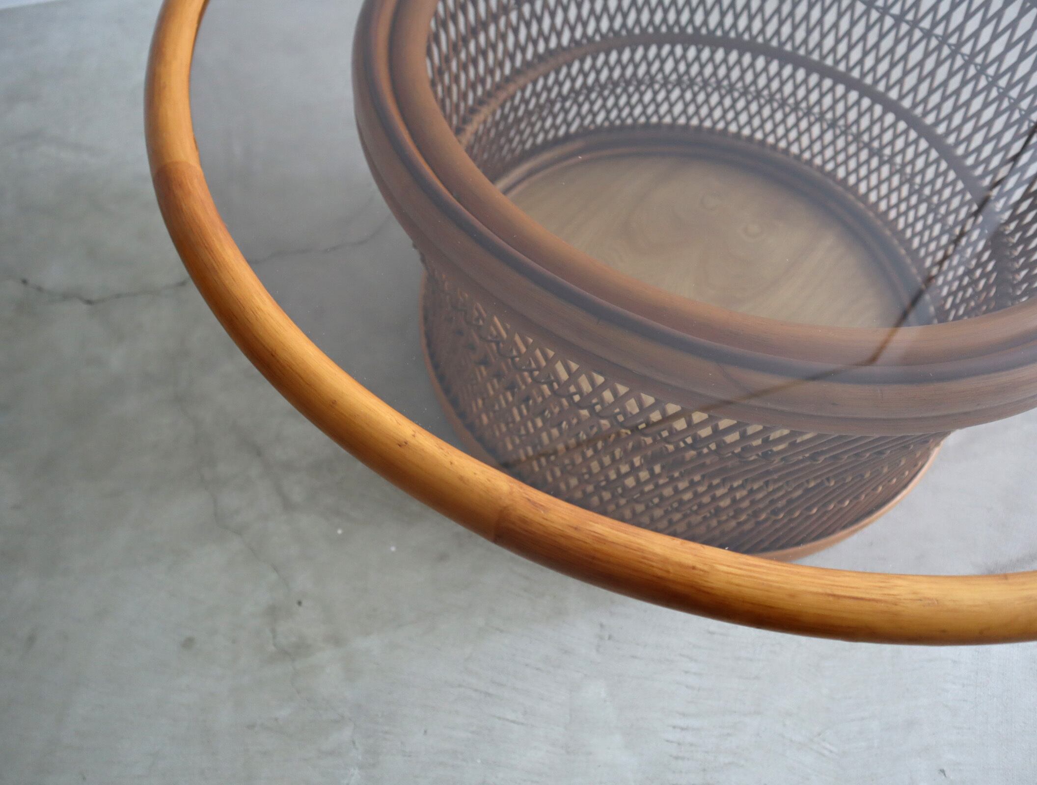 柔らかなラタンの編み込みと、透明感のあるアンバーカラーのガラス天板が美しく調和したラウンドセンターテーブル。