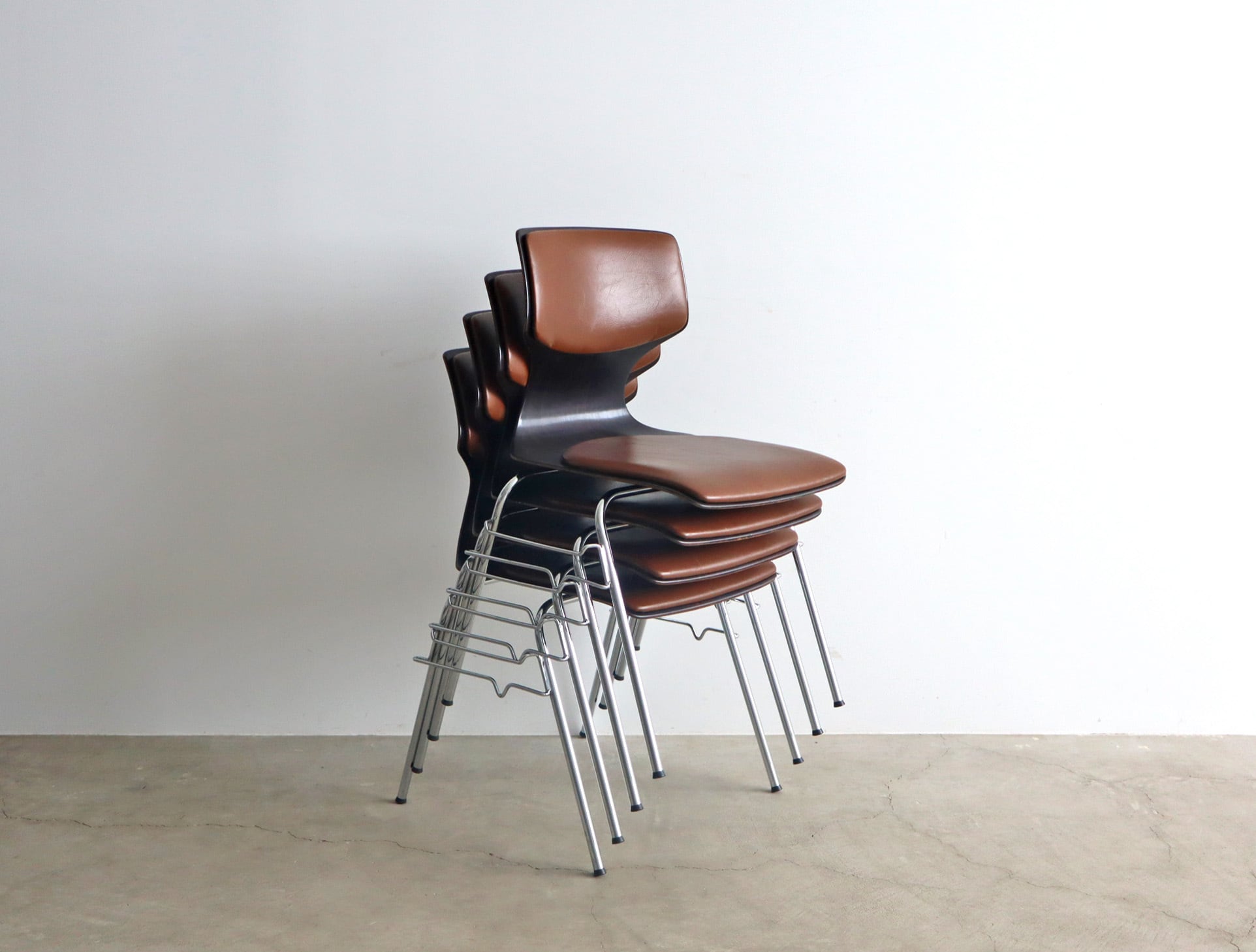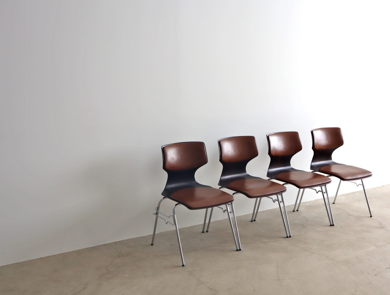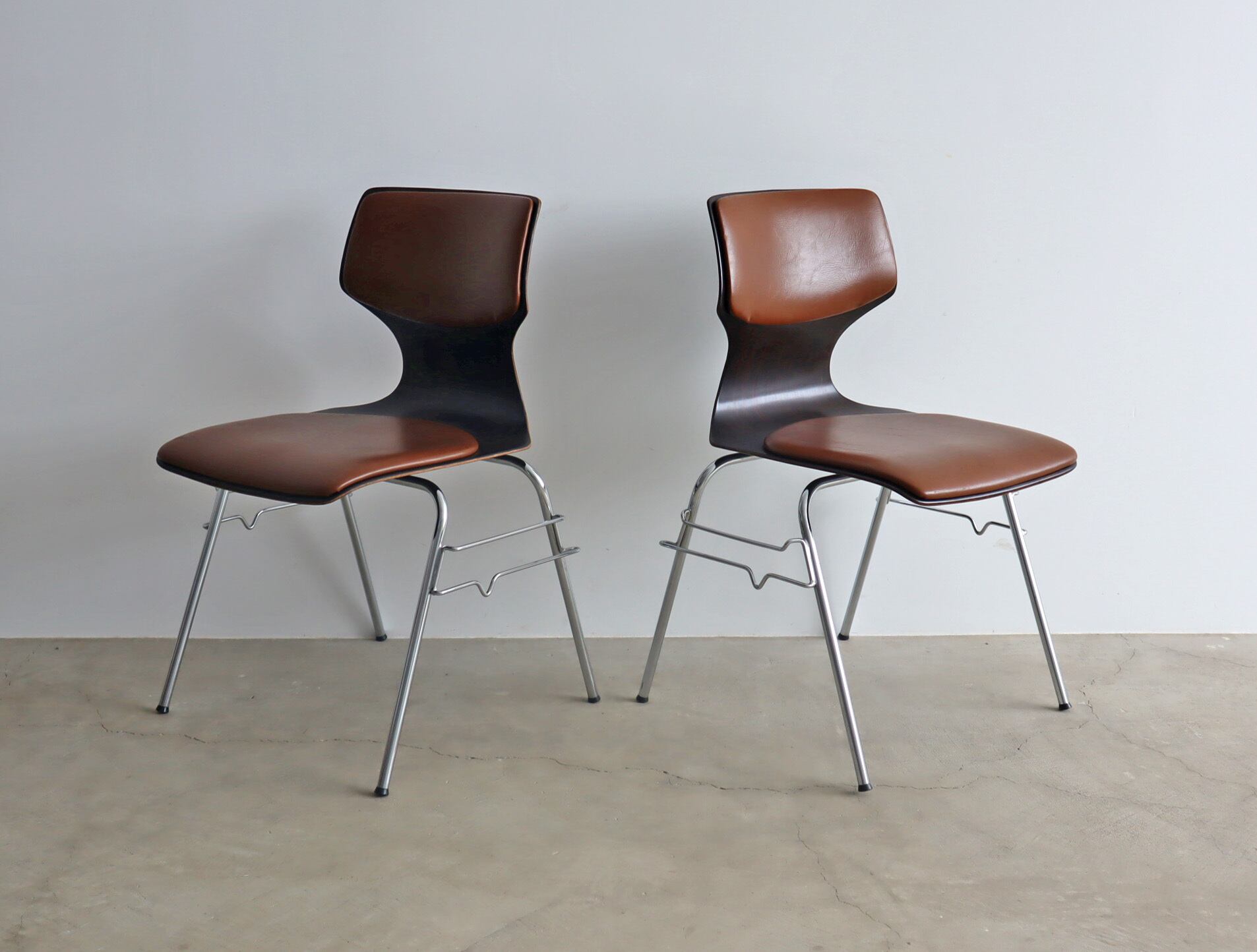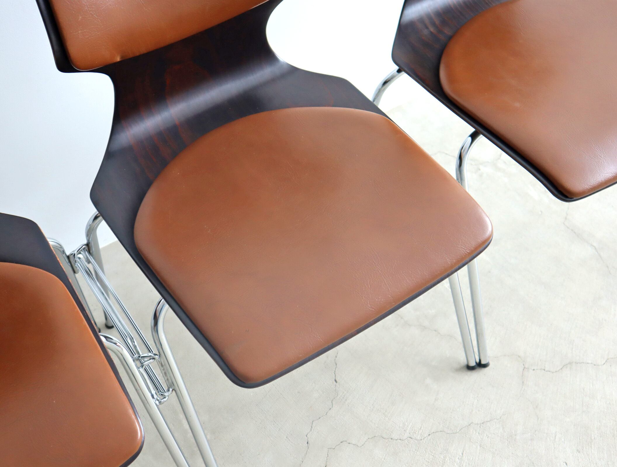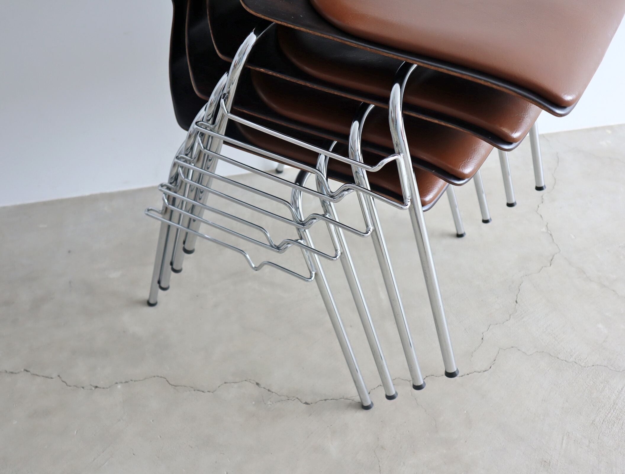 こちらのモデルはパグホルツらしい流線型のシルエットを持ったオーソドックスなシェルに4本脚の連結型スタッキングペース、座面のみならず背にもビニールレザー張りのパットが施された珍しいモデル。