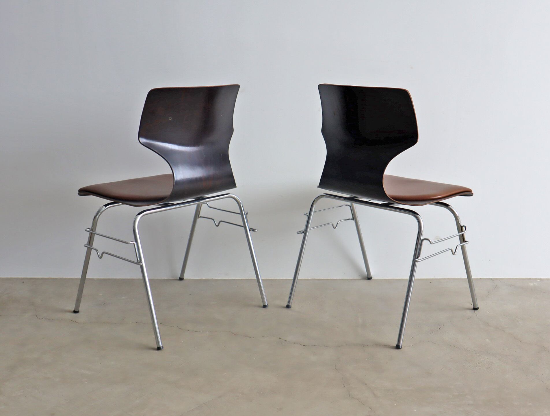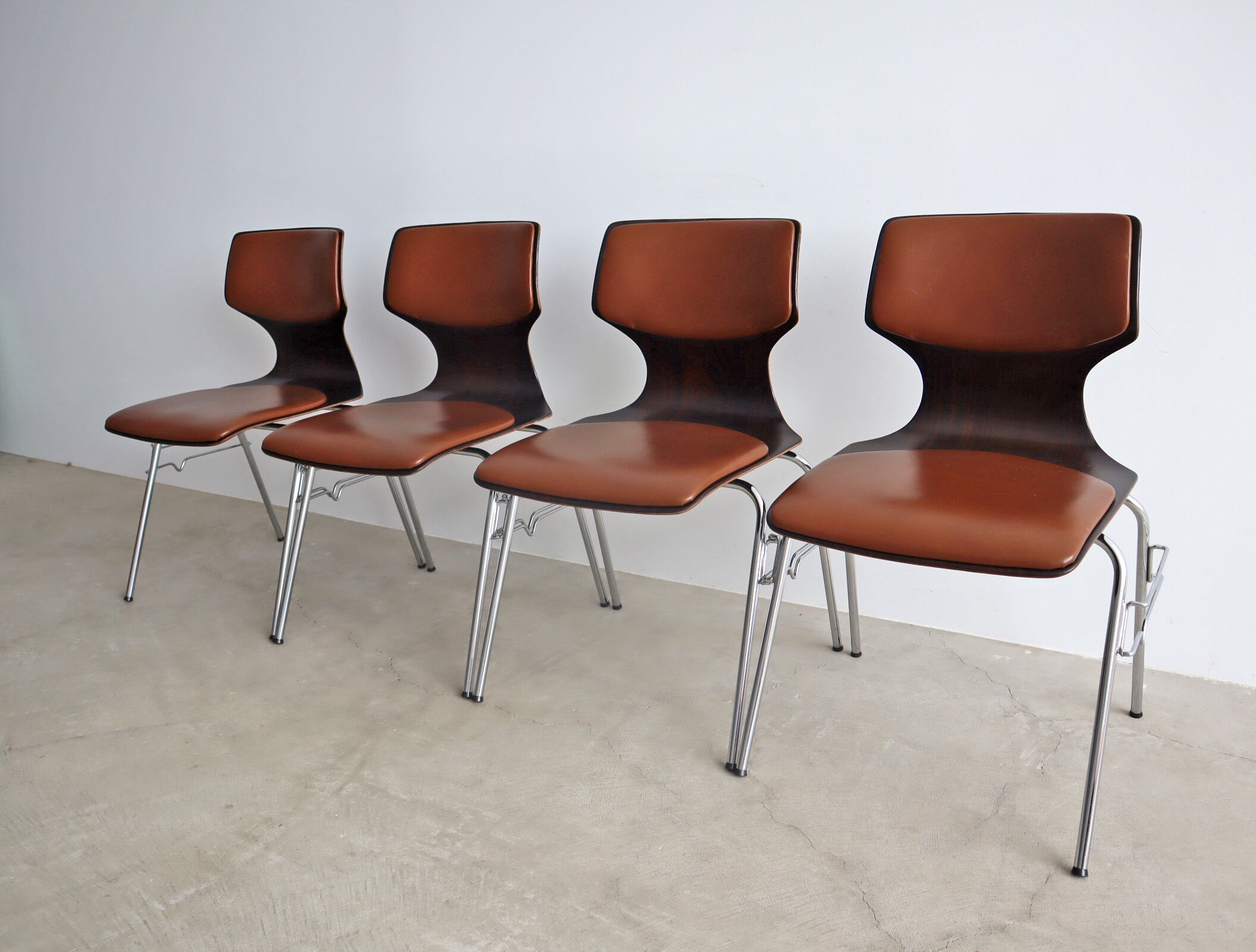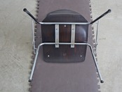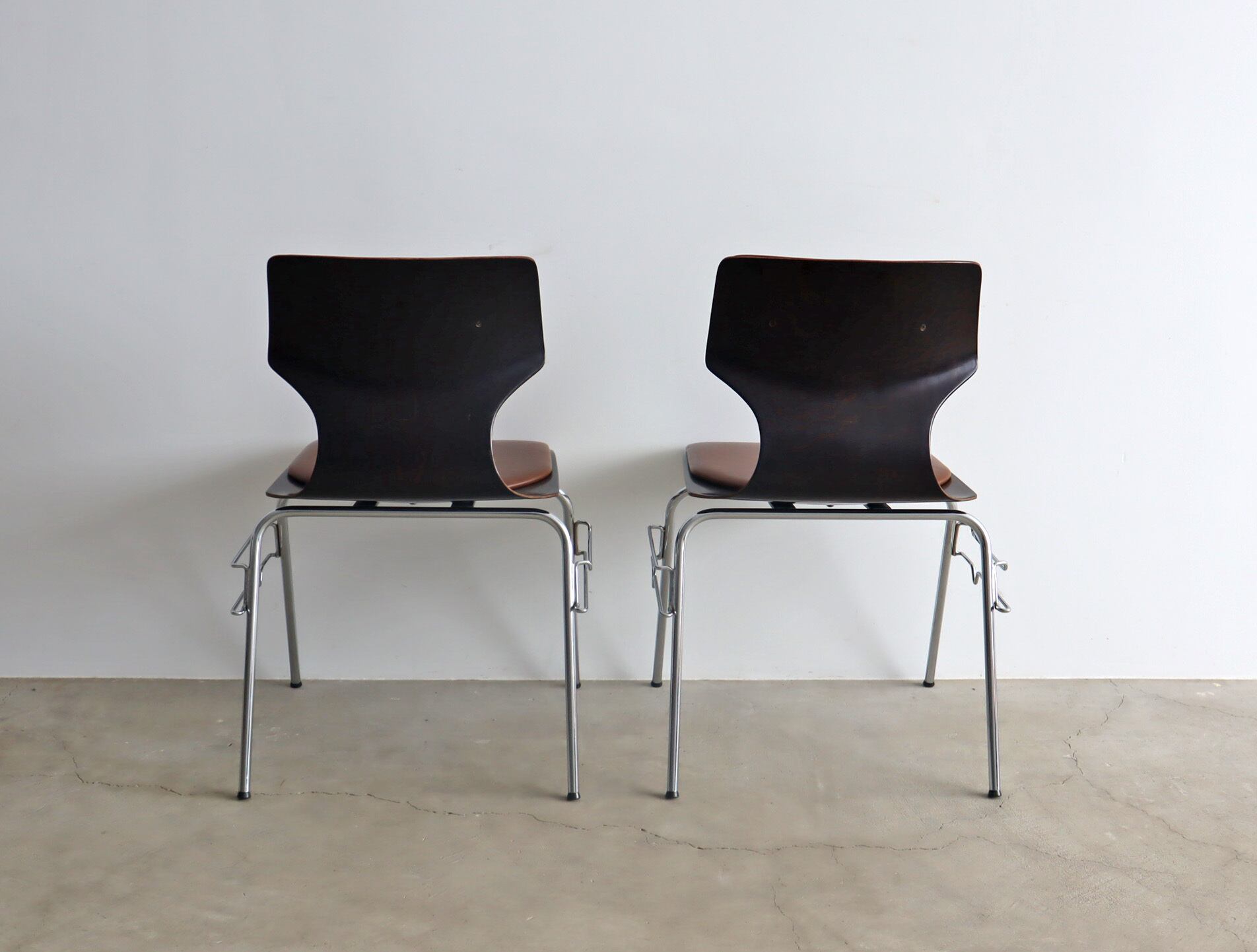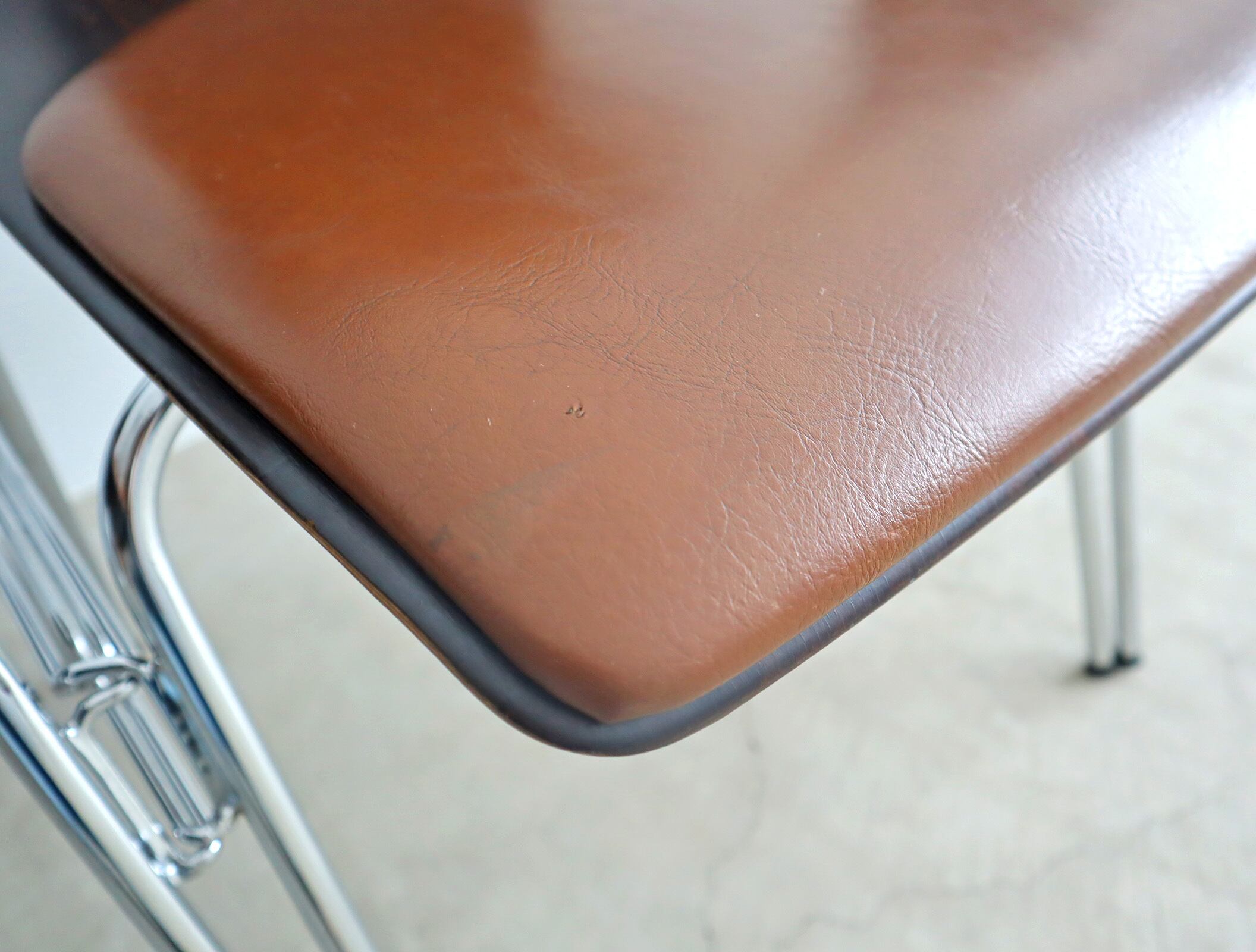 こちらのモデルはパグホルツらしい流線型のシルエットを持ったオーソドックスなシェルに4本脚の連結型スタッキングペース、座面のみならず背にもビニールレザー張りのパットが施された珍しいモデル。