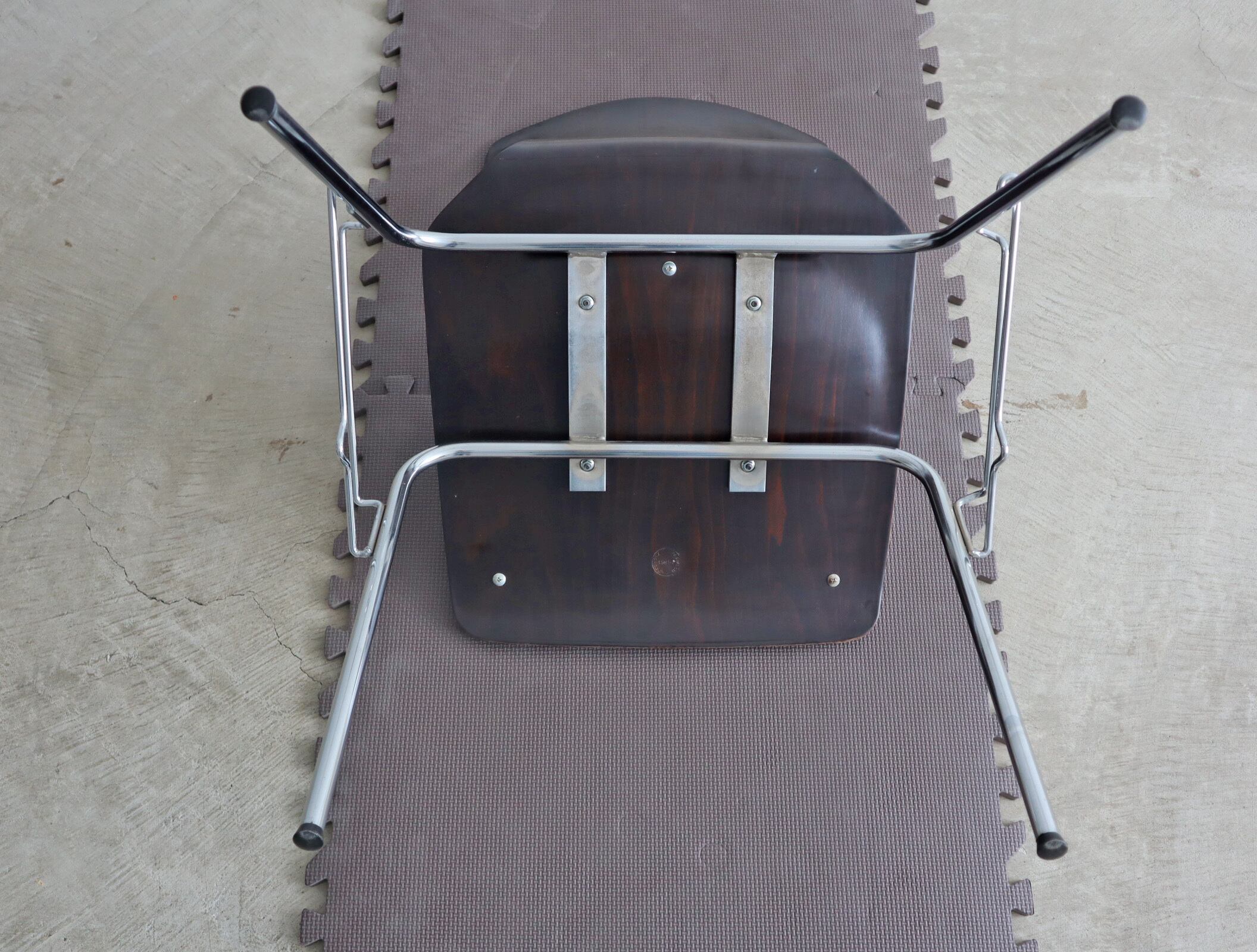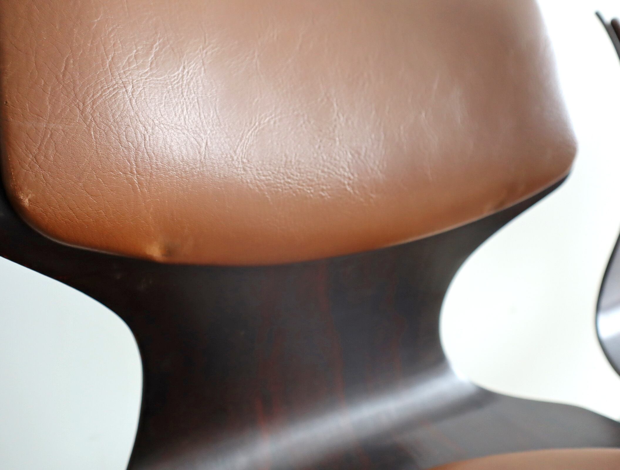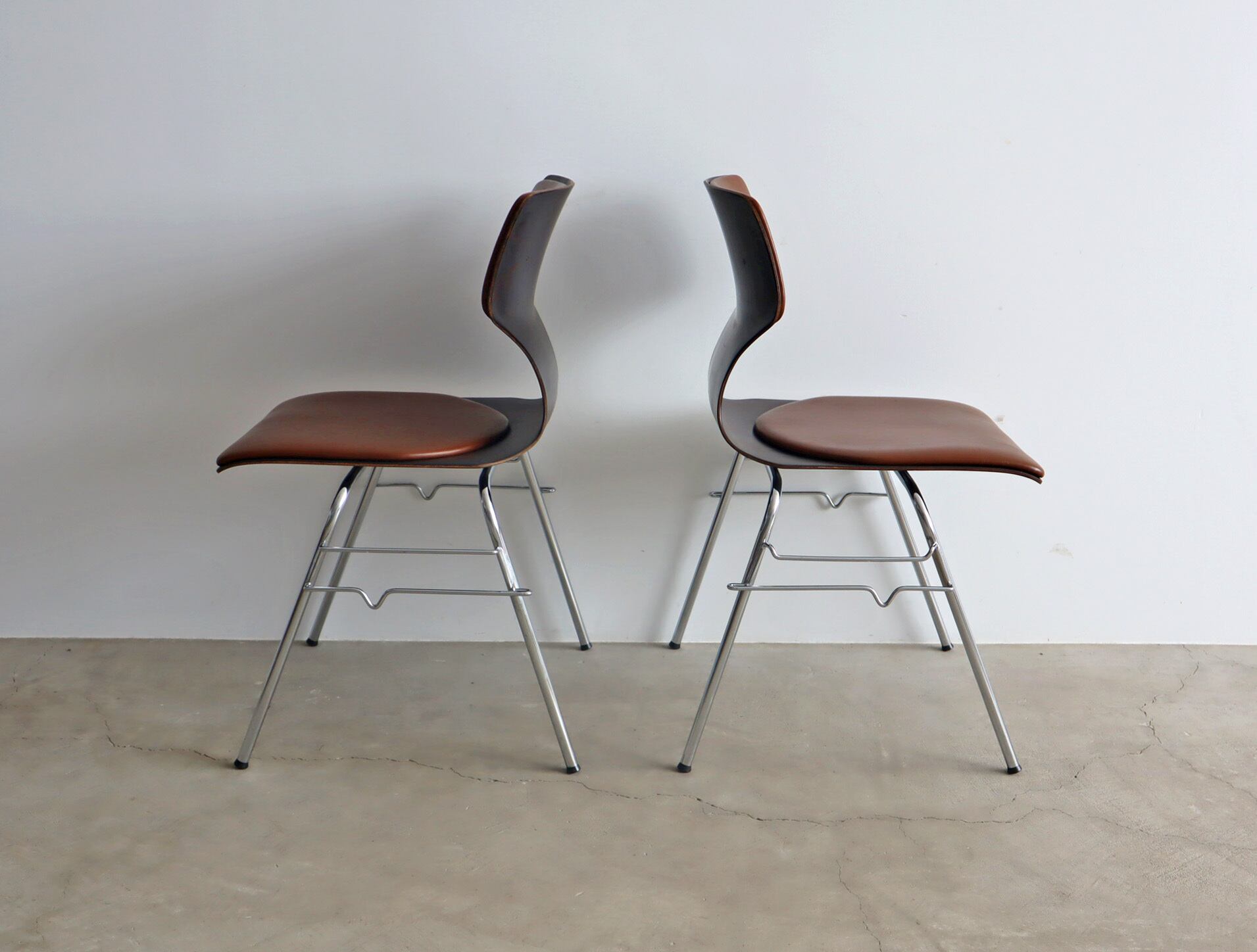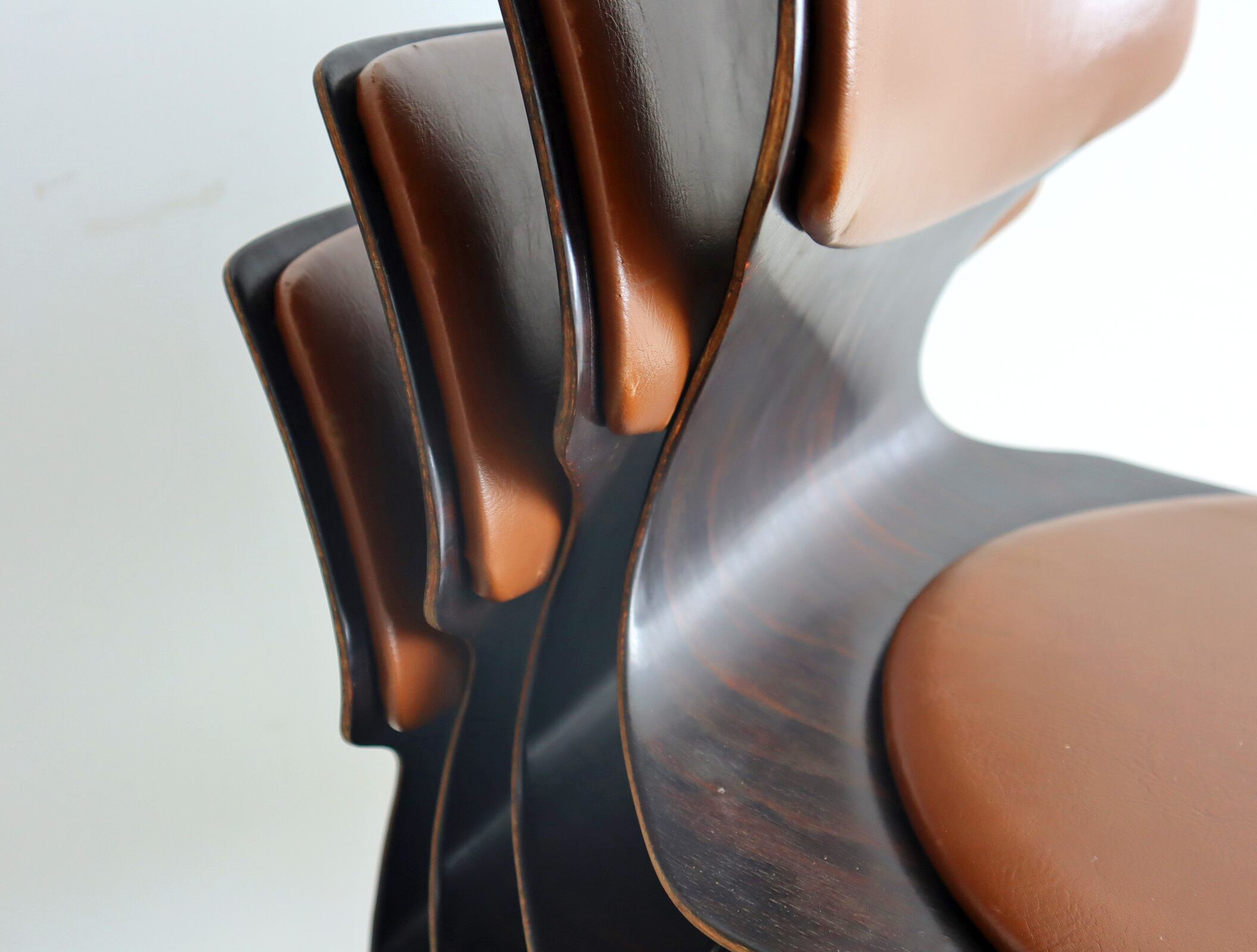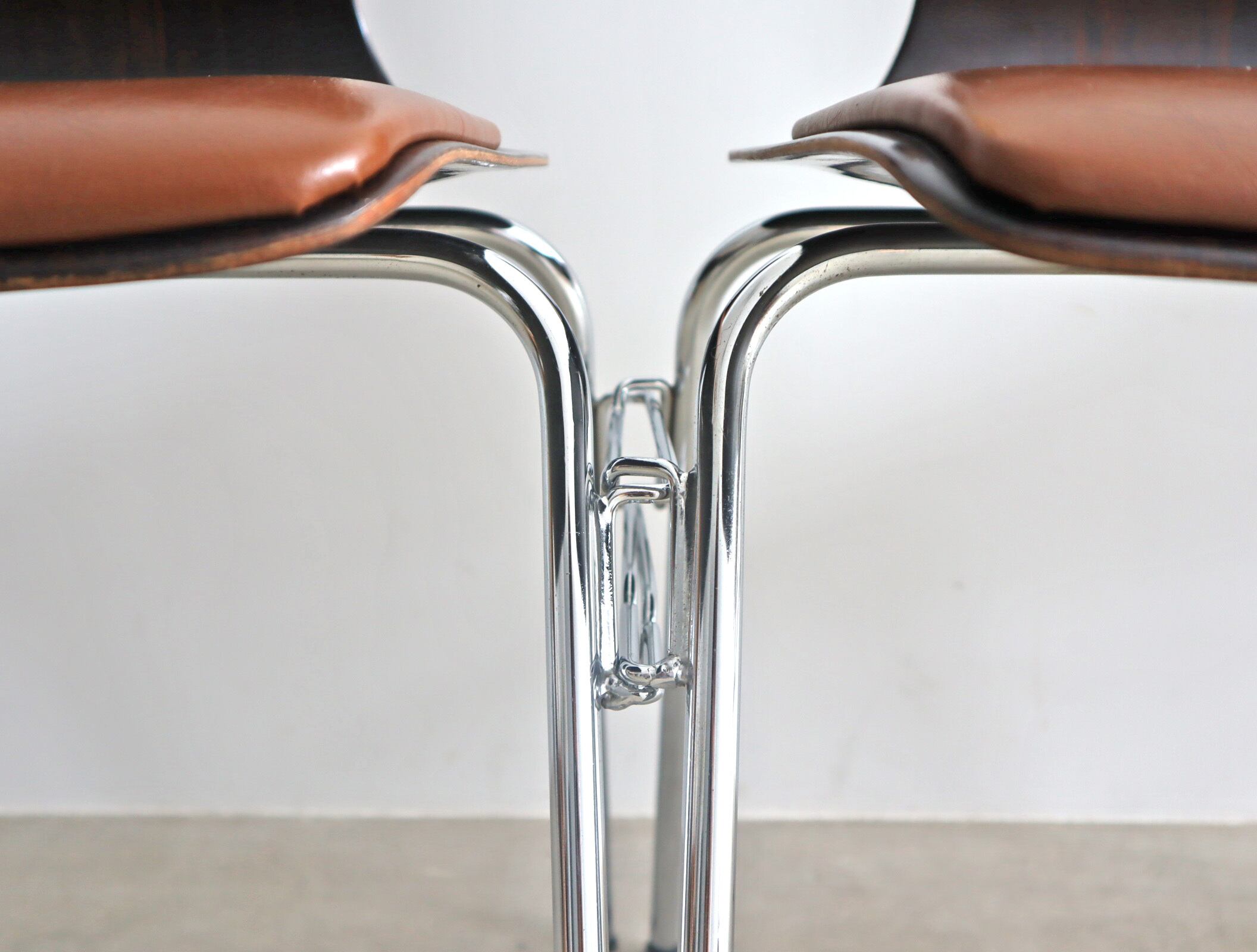 こちらのモデルはパグホルツらしい流線型のシルエットを持ったオーソドックスなシェルに4本脚の連結型スタッキングペース、座面のみならず背にもビニールレザー張りのパットが施された珍しいモデル。