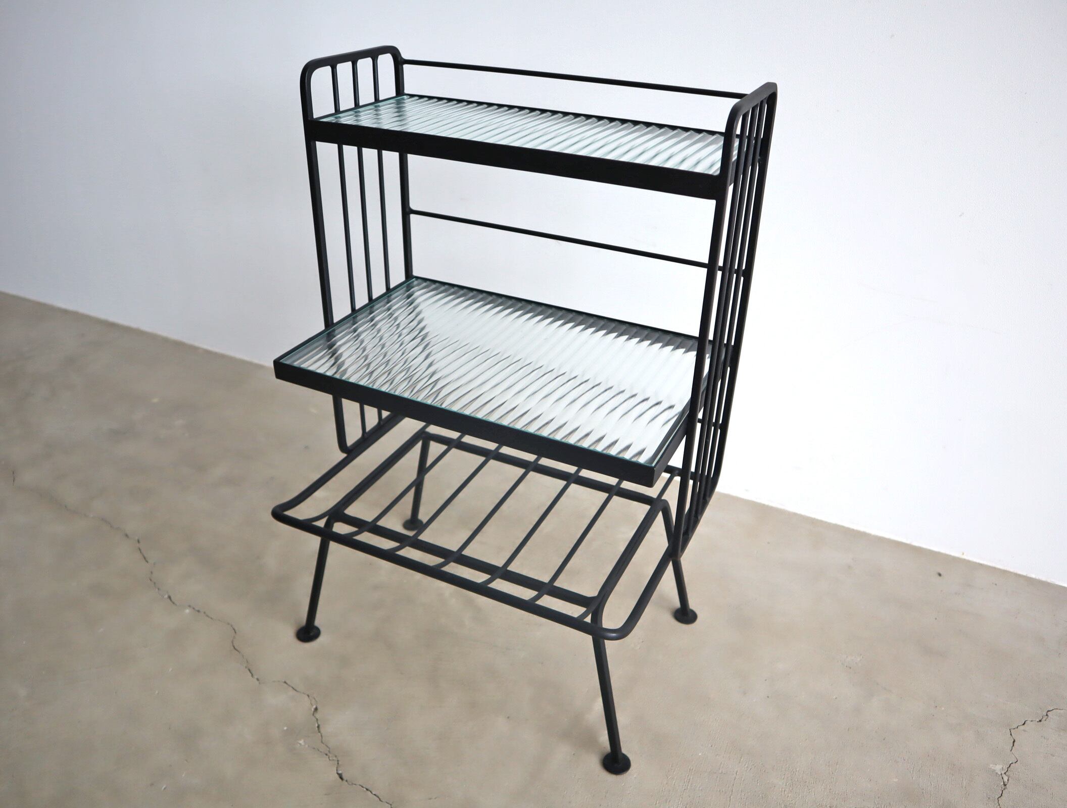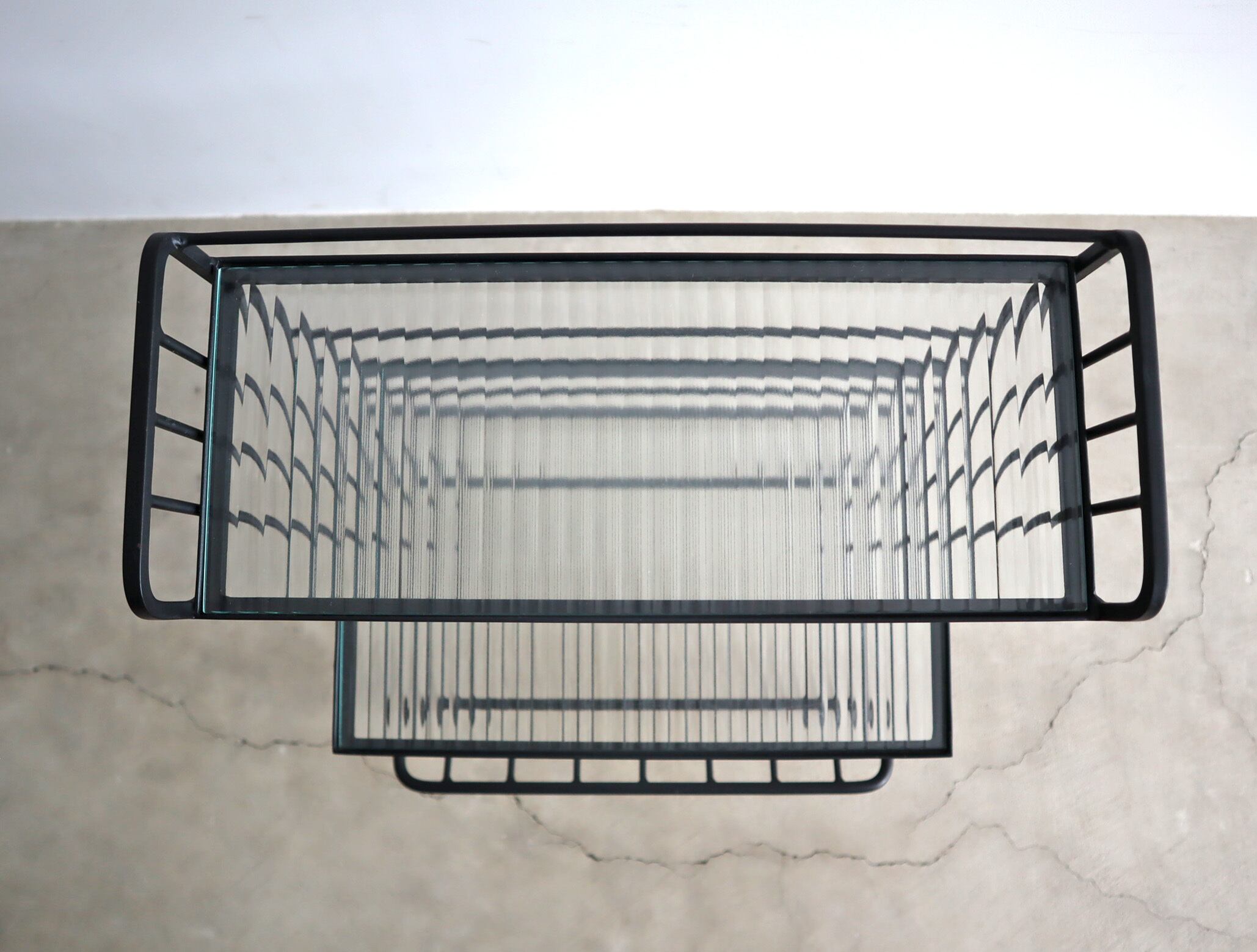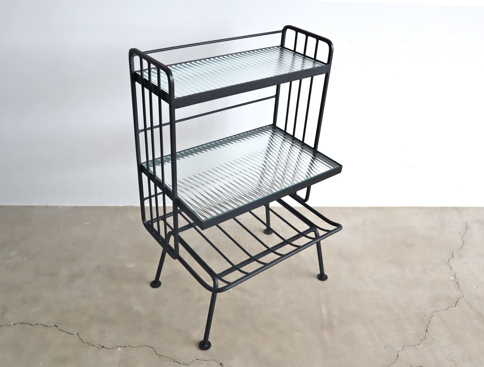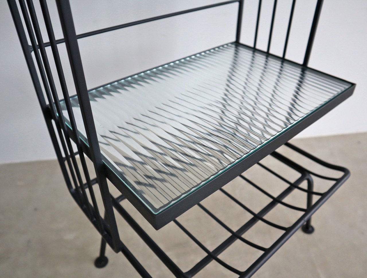 ブラックアイアンのフレームに、凹凸のあるガラス棚板を組み合わせたデザインは、軽やかさとモダンな存在感を兼ね備えています。
