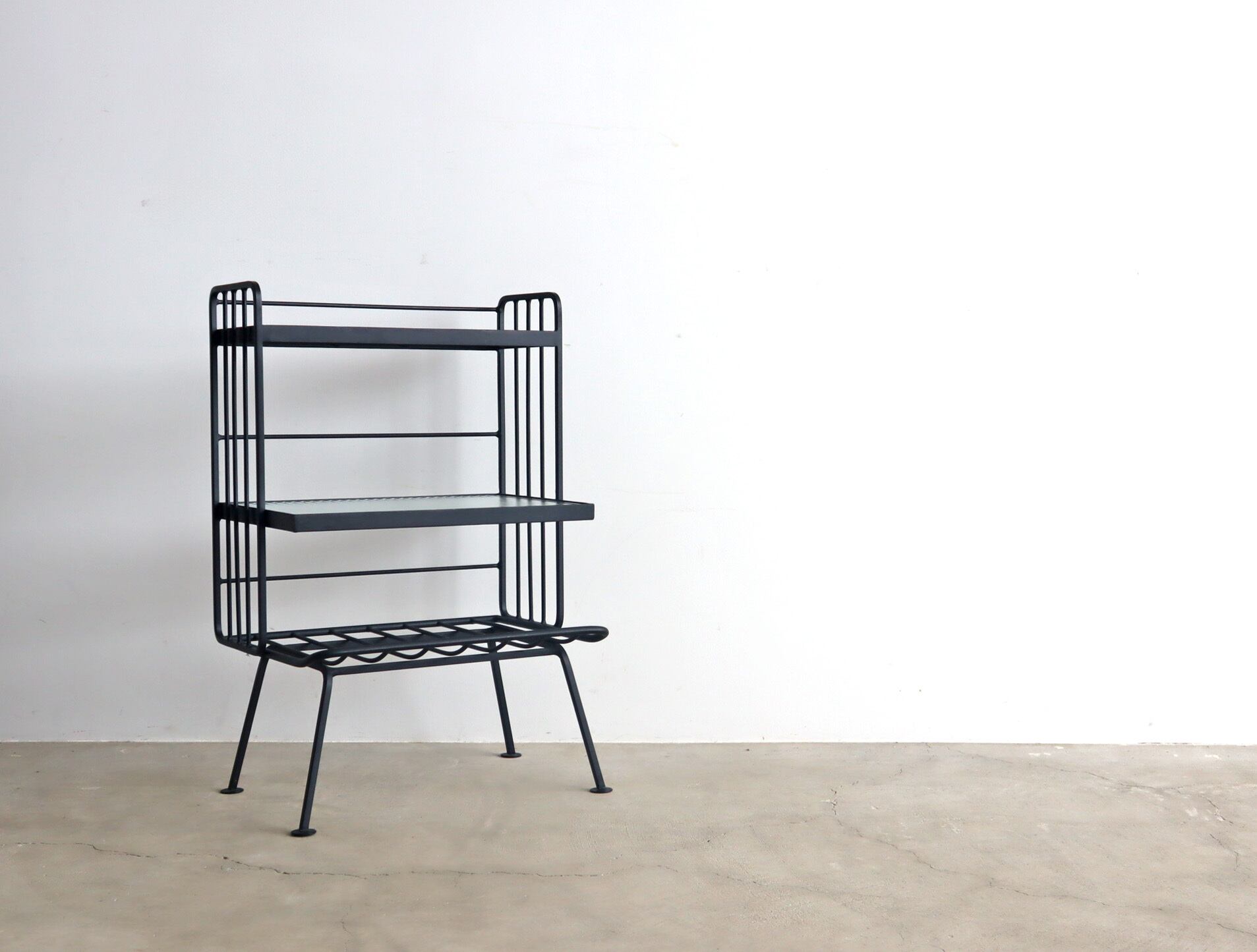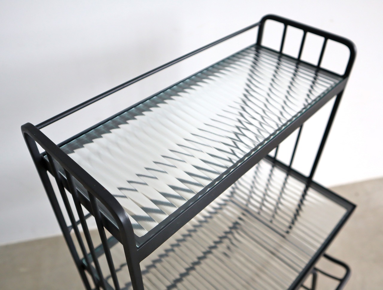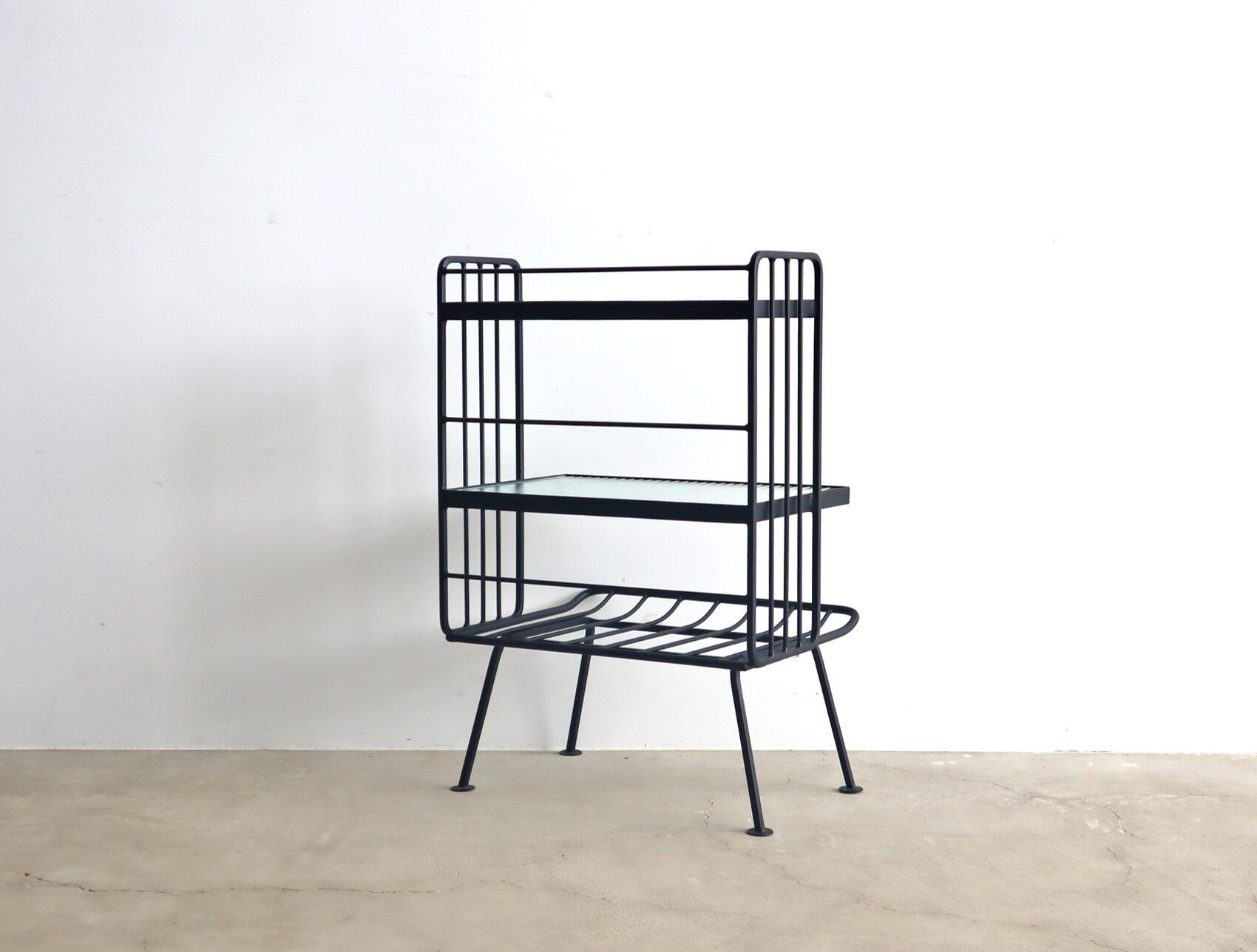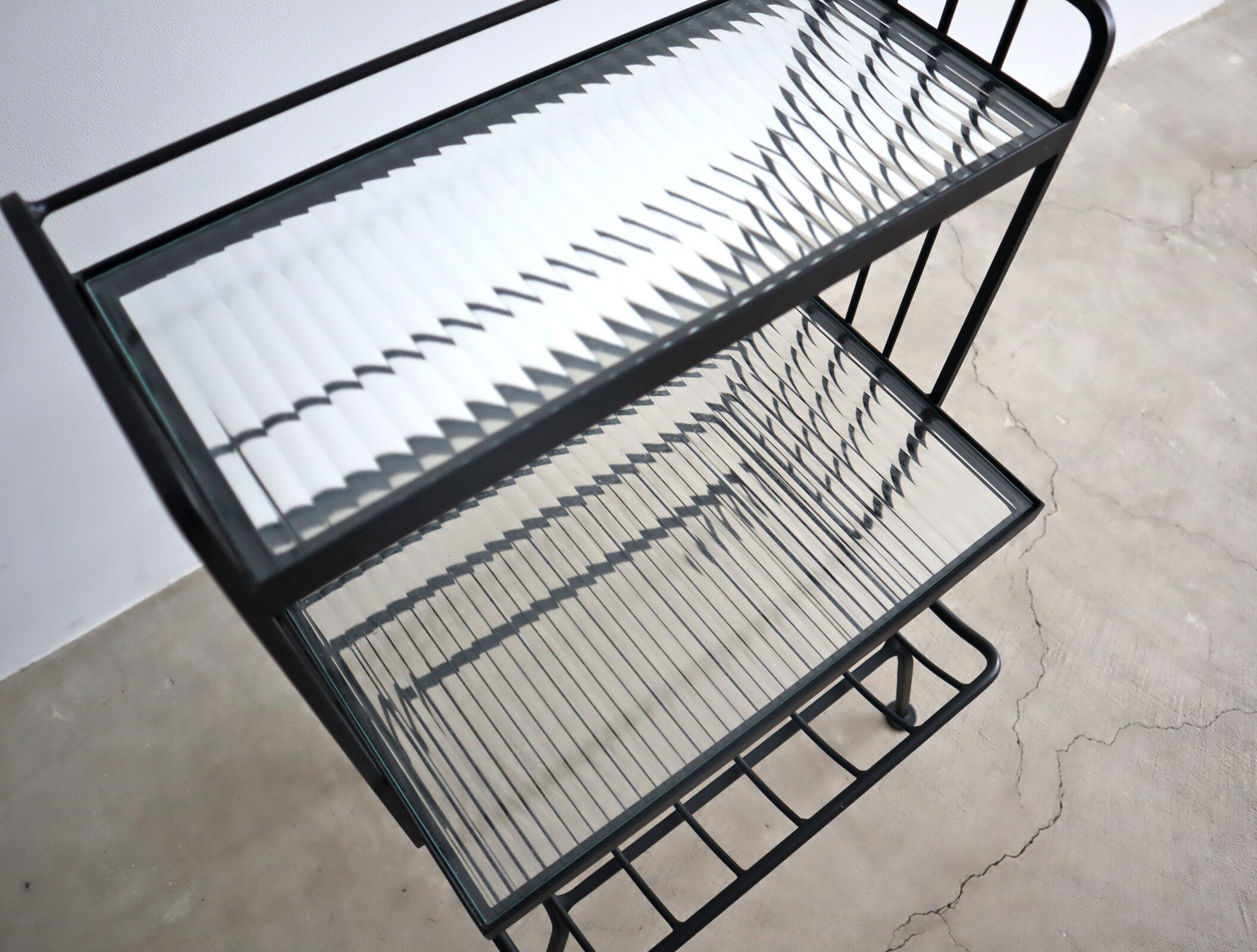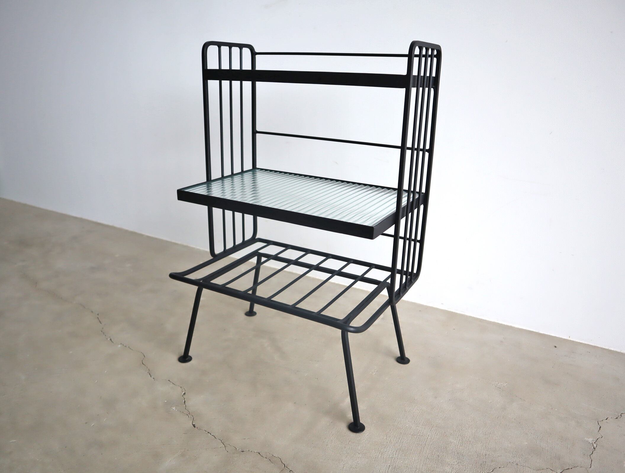 ブラックアイアンのフレームに、凹凸のあるガラス棚板を組み合わせたデザインは、軽やかさとモダンな存在感を兼ね備えています。