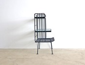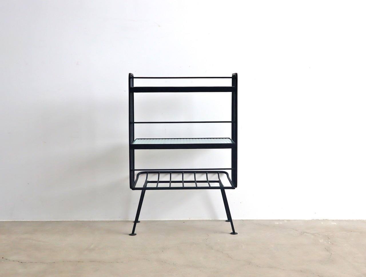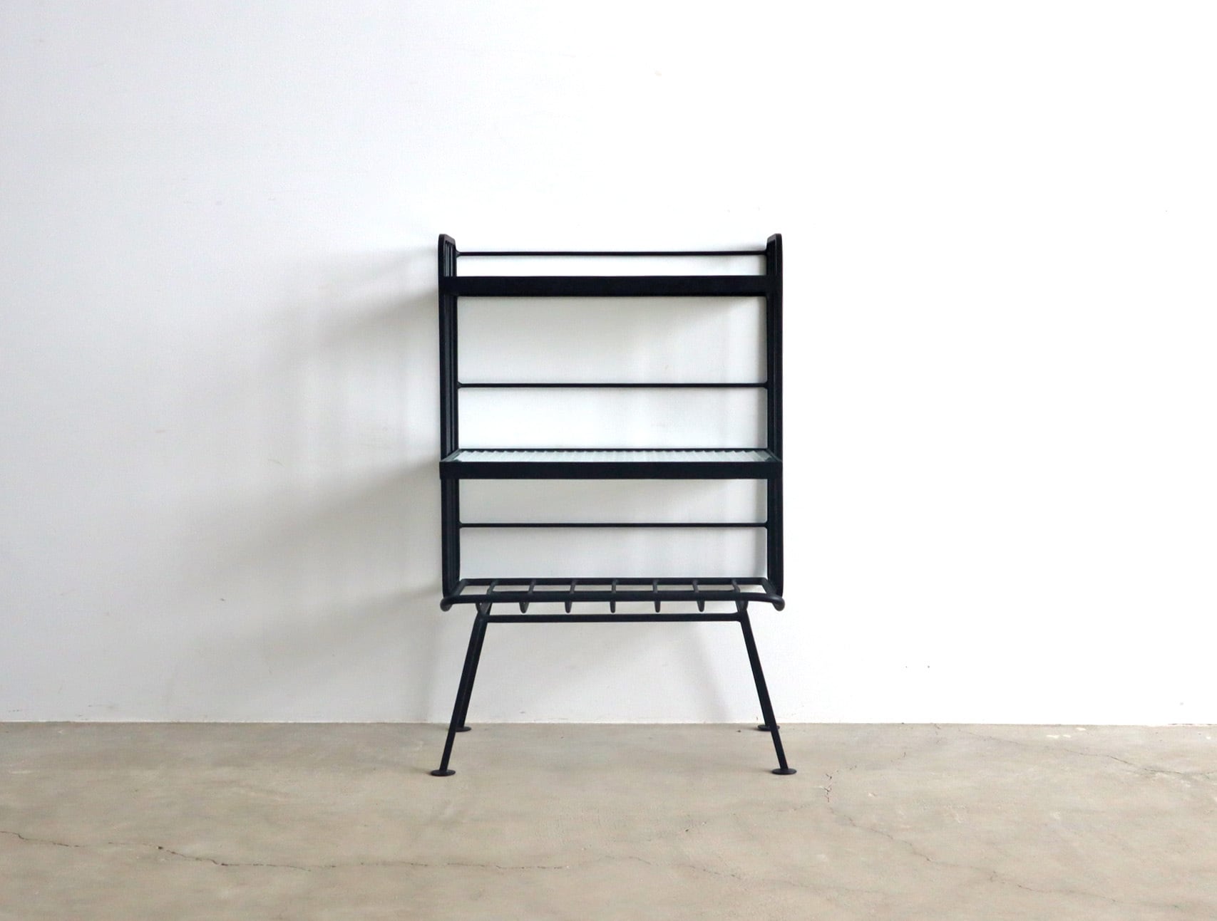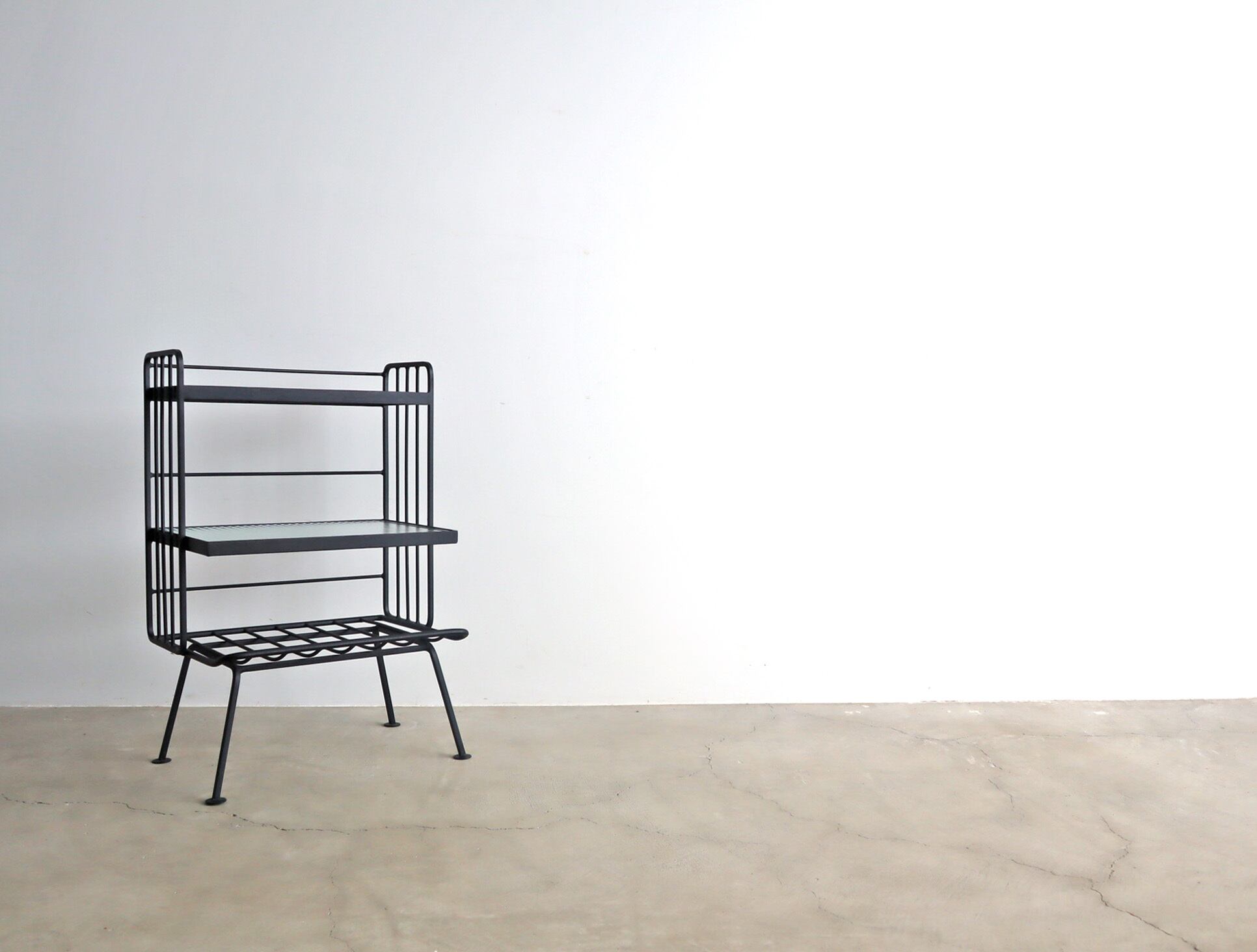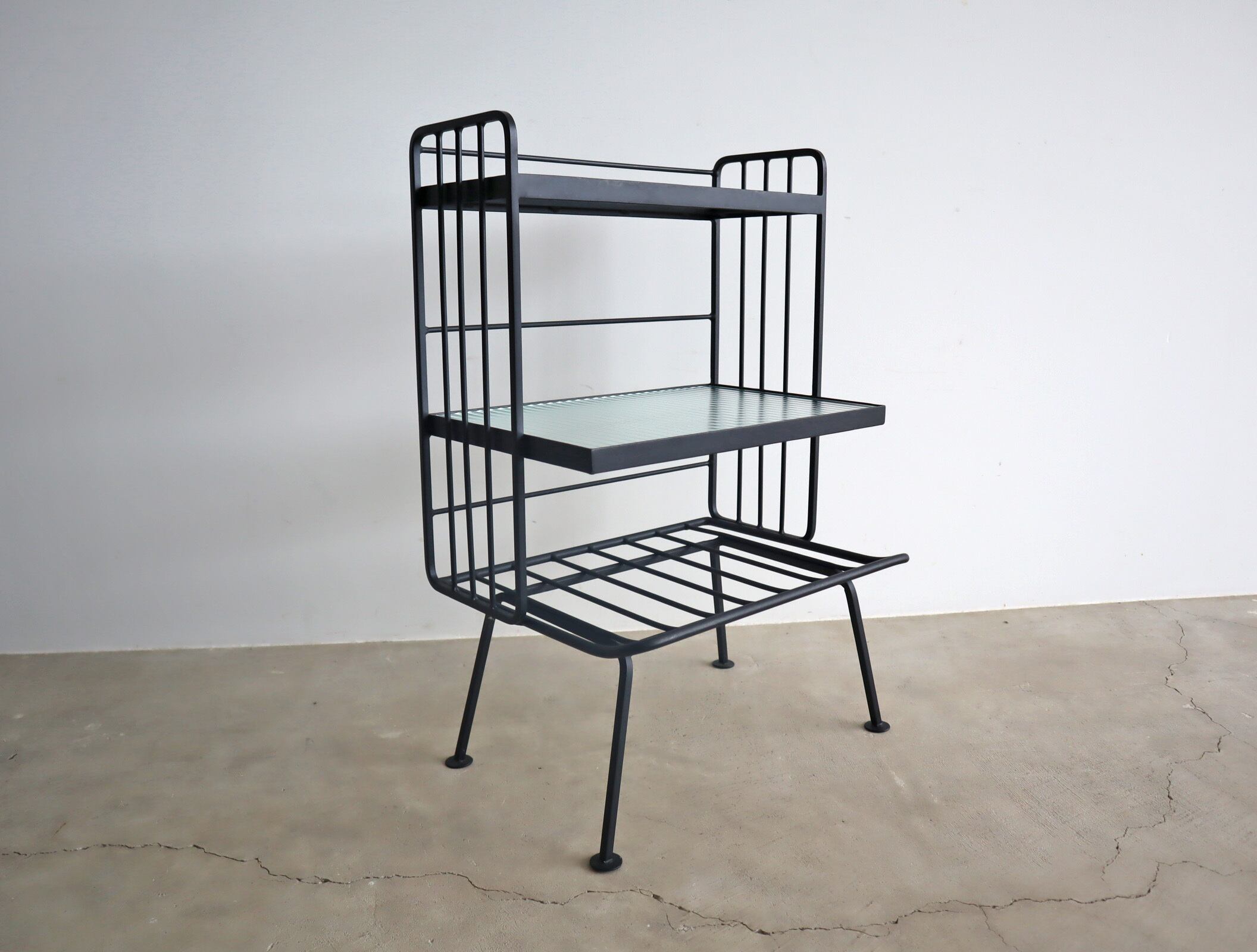 ブラックアイアンのフレームに、凹凸のあるガラス棚板を組み合わせたデザインは、軽やかさとモダンな存在感を兼ね備えています。
