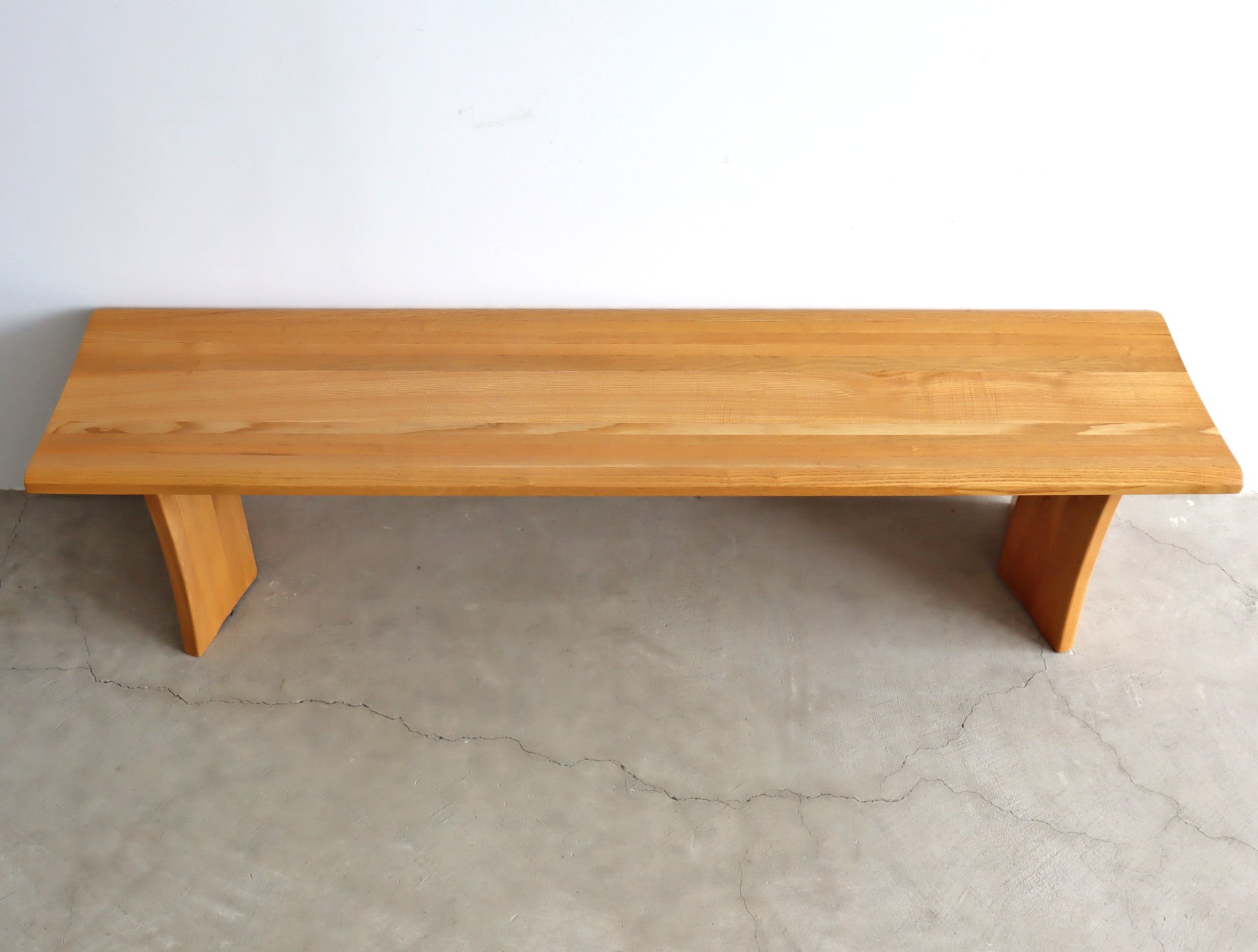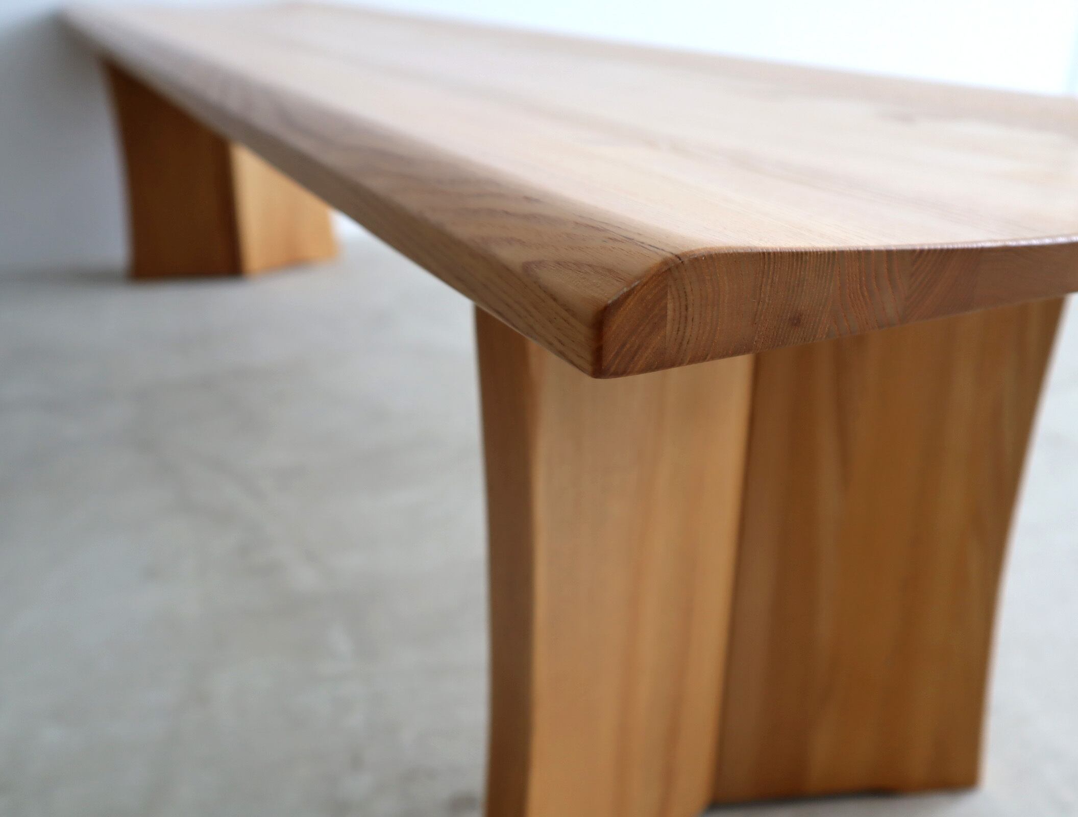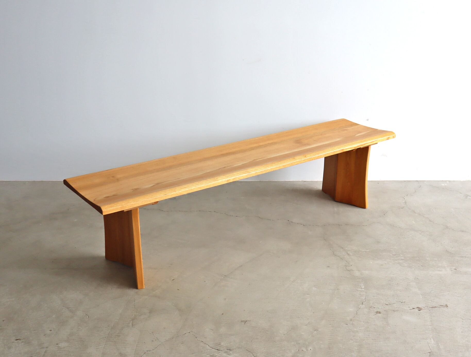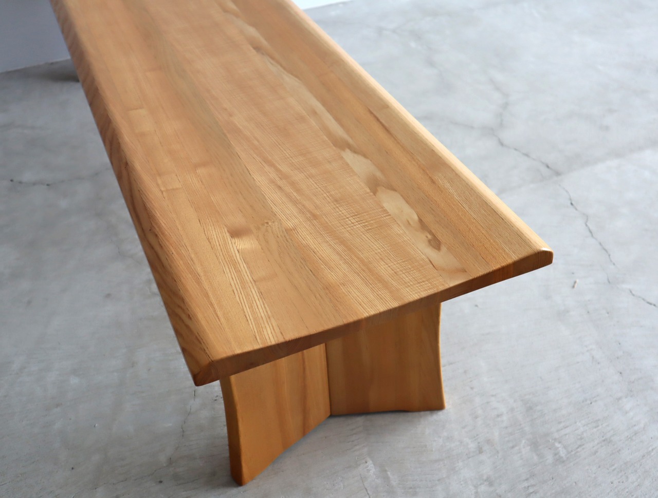 一枚一枚異なる温かみのある木目が織りなす表情は、無垢材ならではの美しさ。しっかりとした厚みを持つ座面は重厚感がありながら、直線的で無駄のないフォルムが空間にすっきりとした印象を与えます。