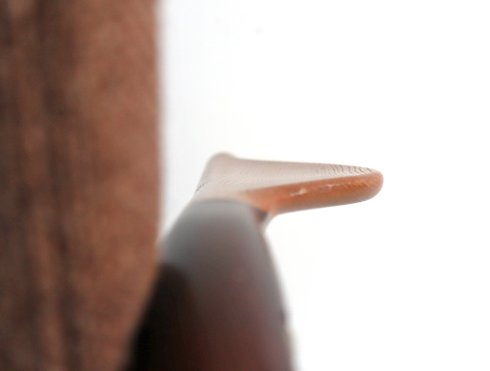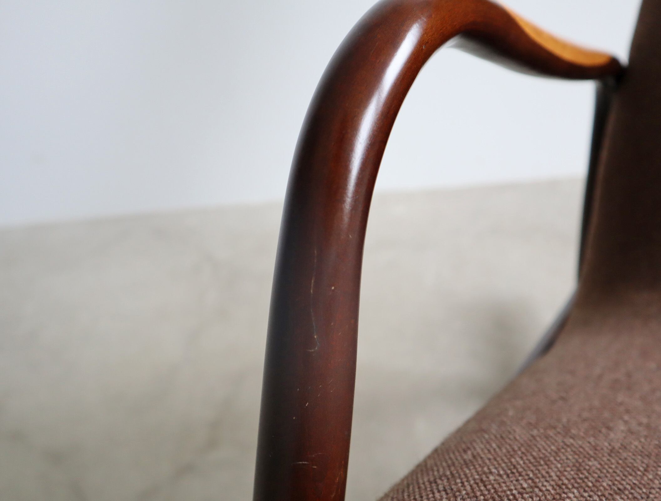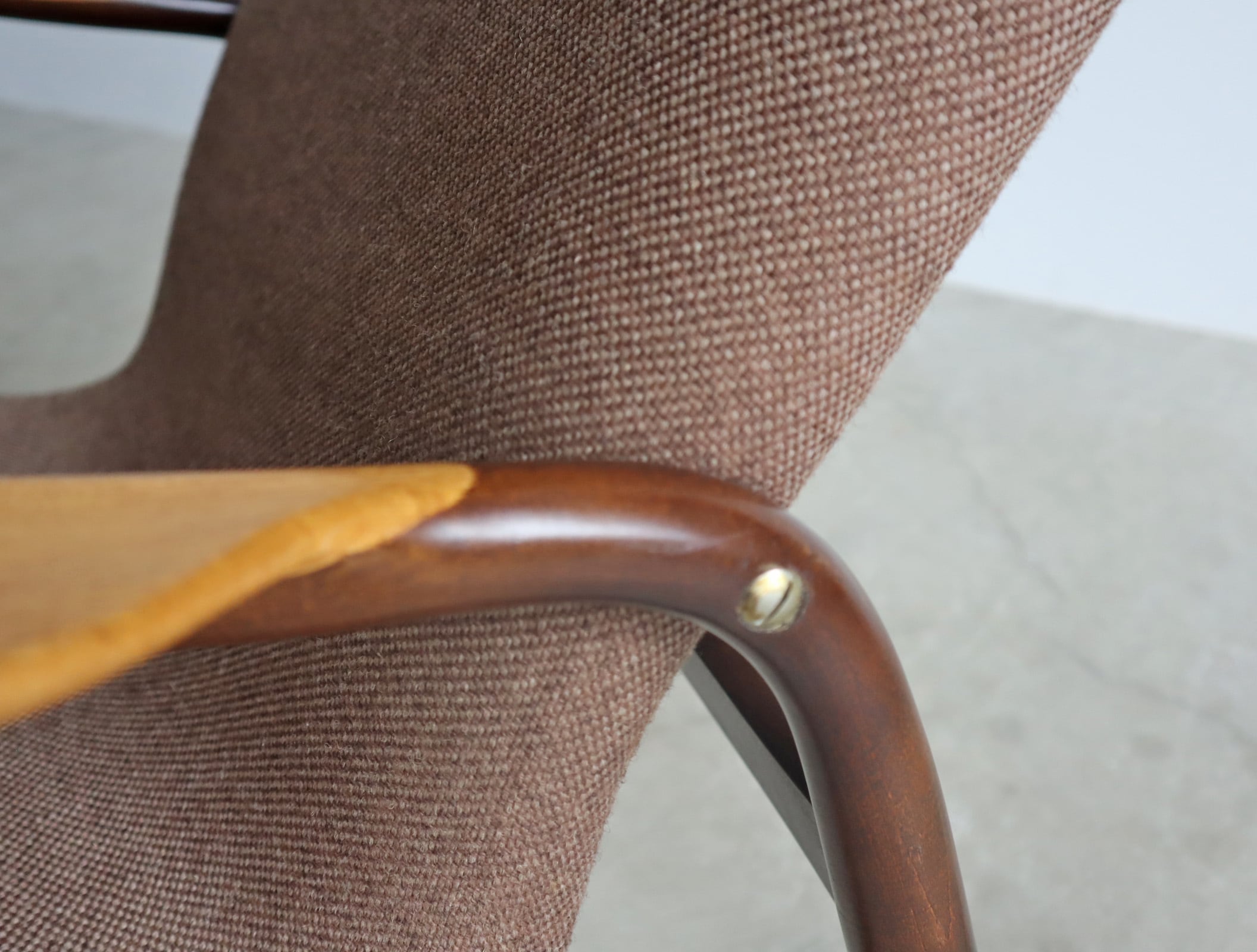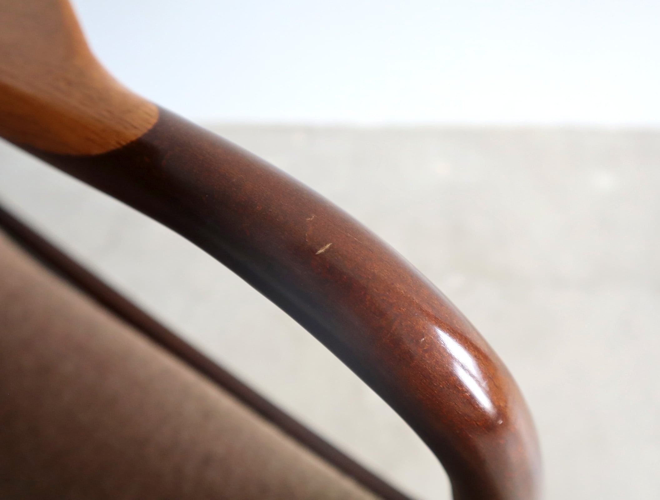トーン違いでメリハリの効いたひじ掛けは美しく削り出されたオーク材、東欧のクラシックなスタイルに北欧風のデザインを落とし込んだ、独特な存在感を纏います。