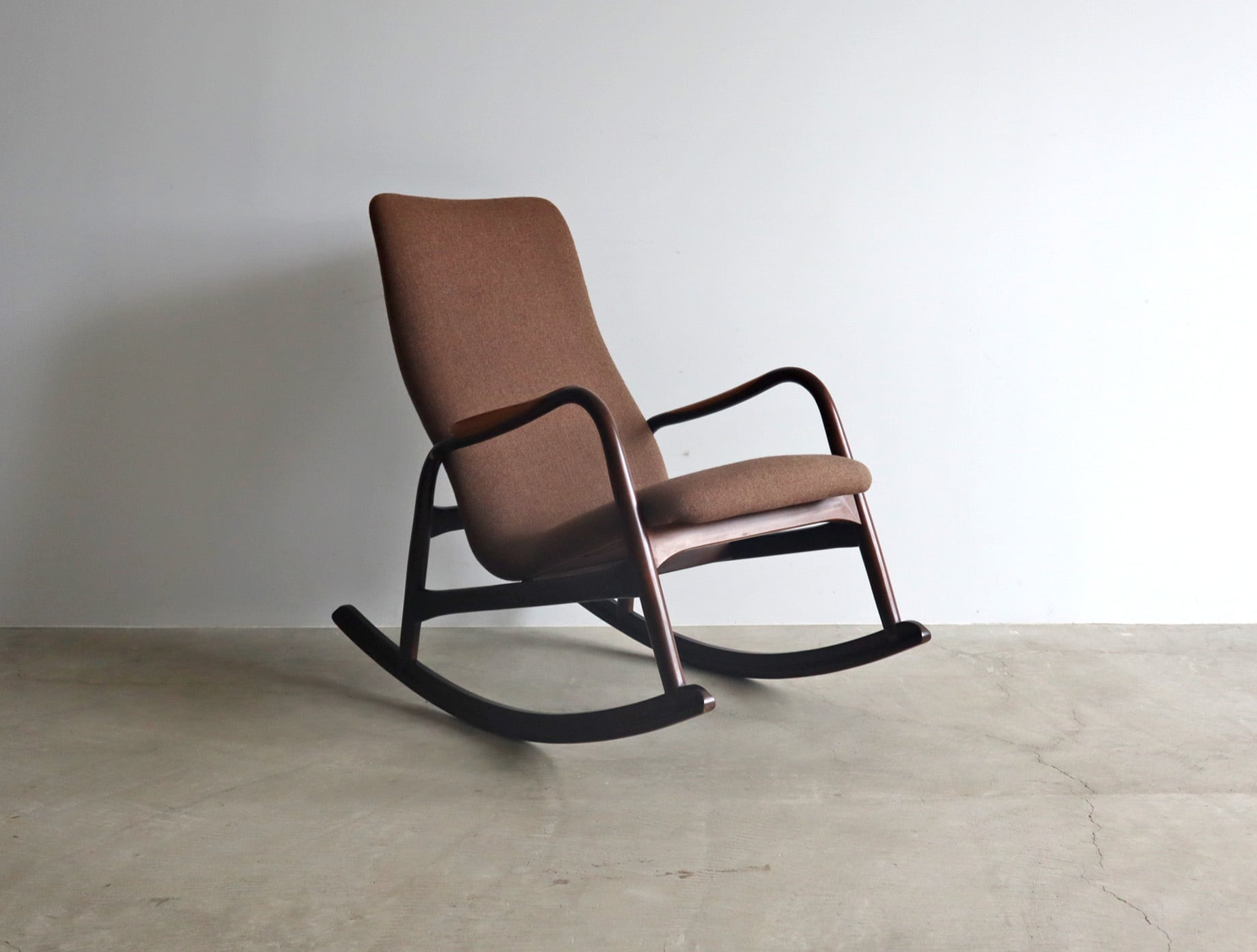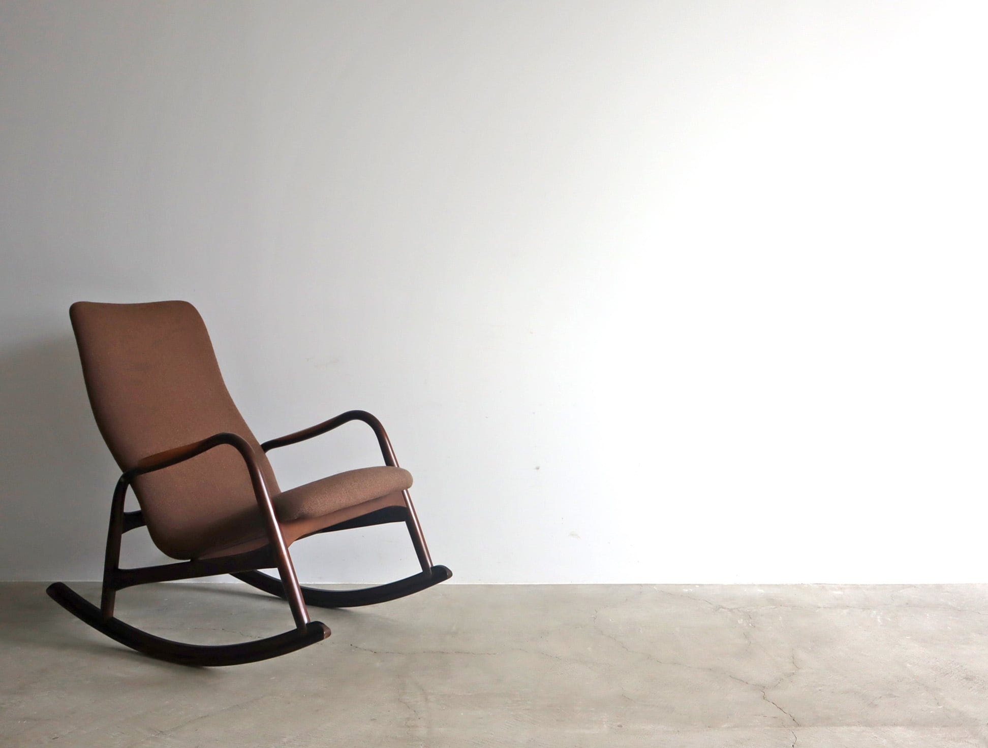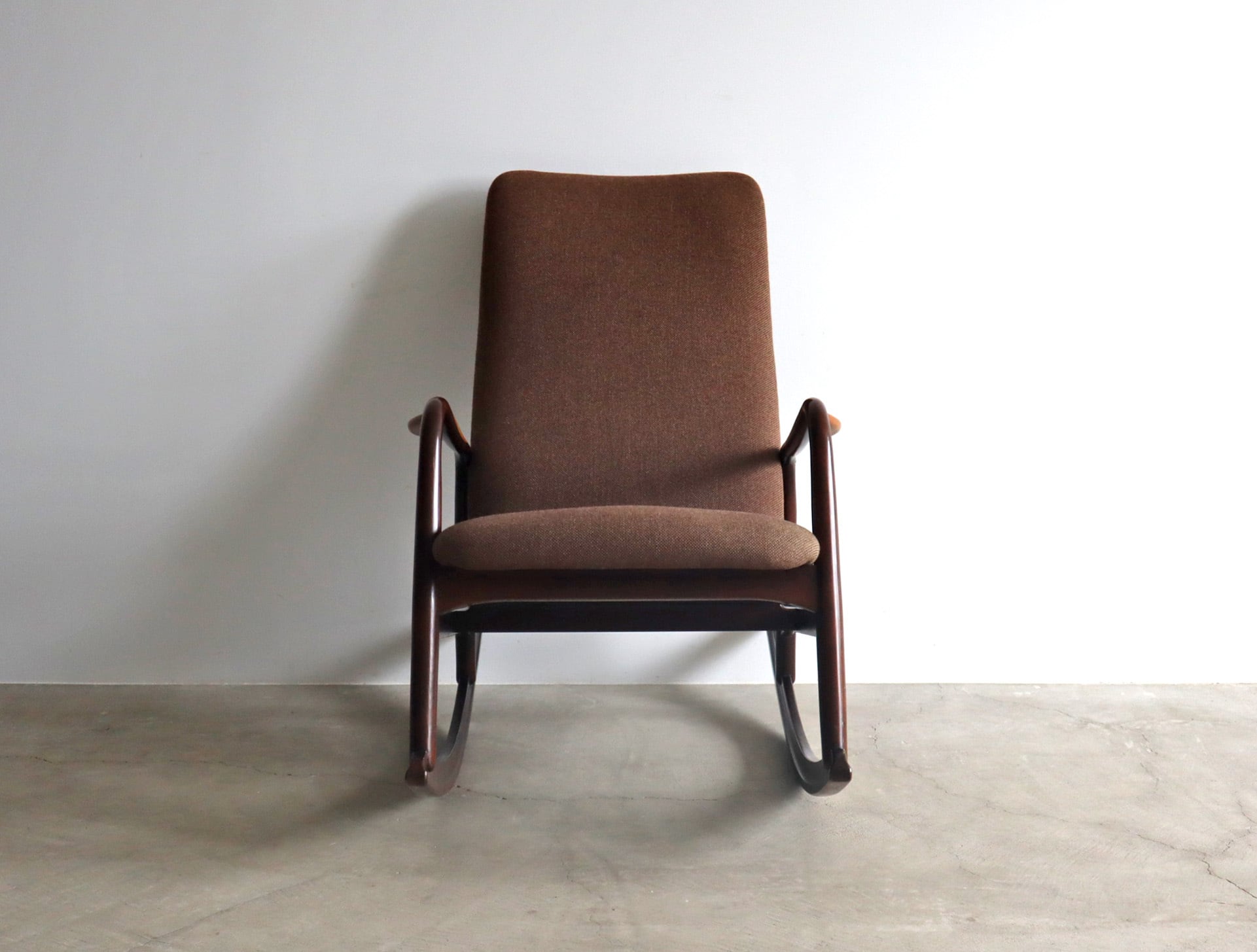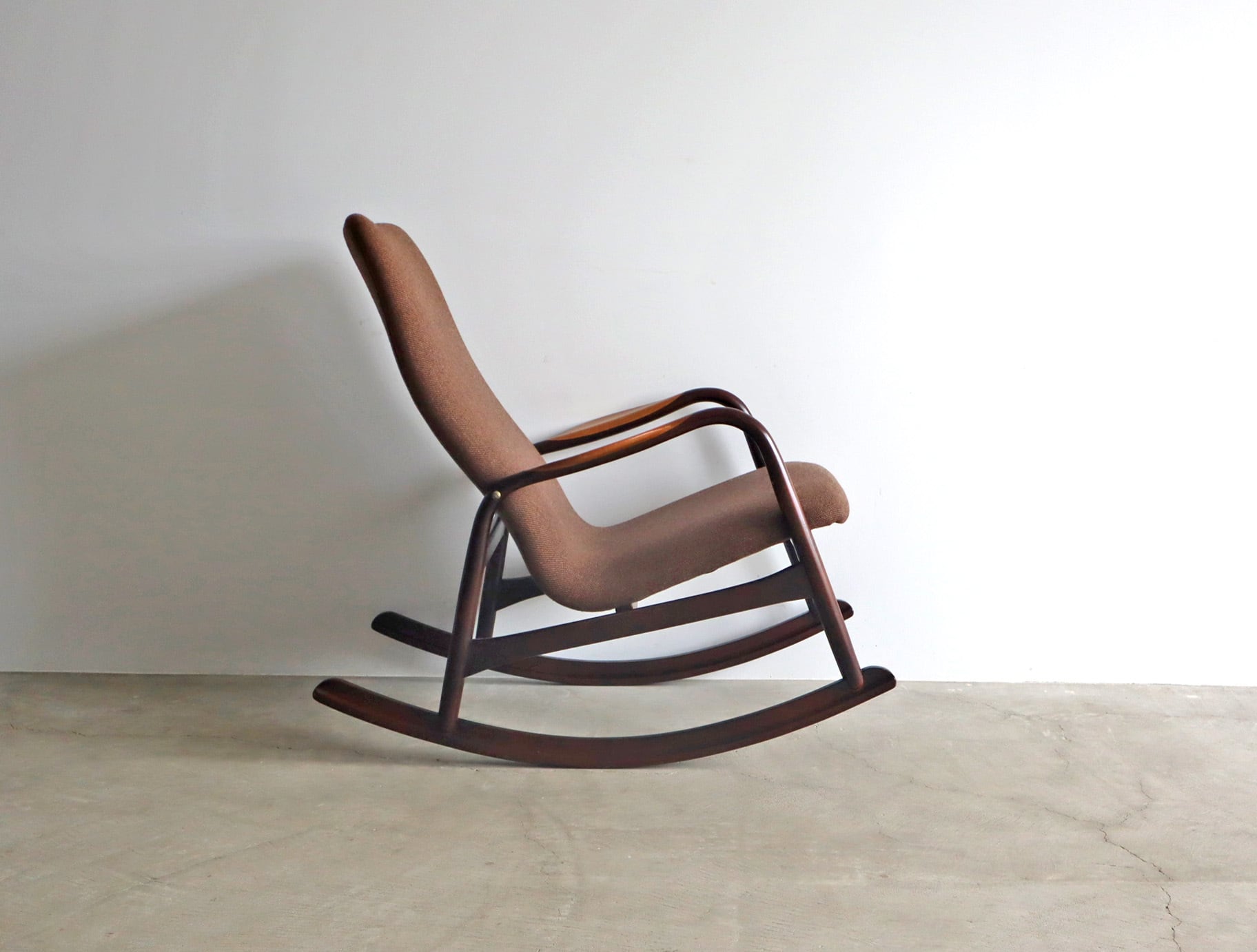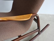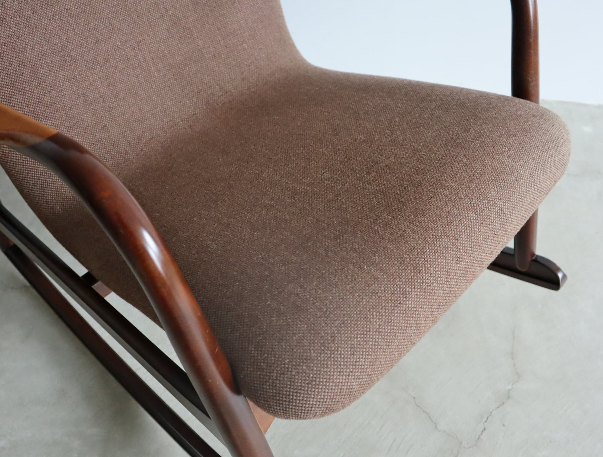 やわらかで包み込まれるようなファブリックシートと相まって、穏やかな揺れの中に深い安心感をもたらしてくれる一脚。