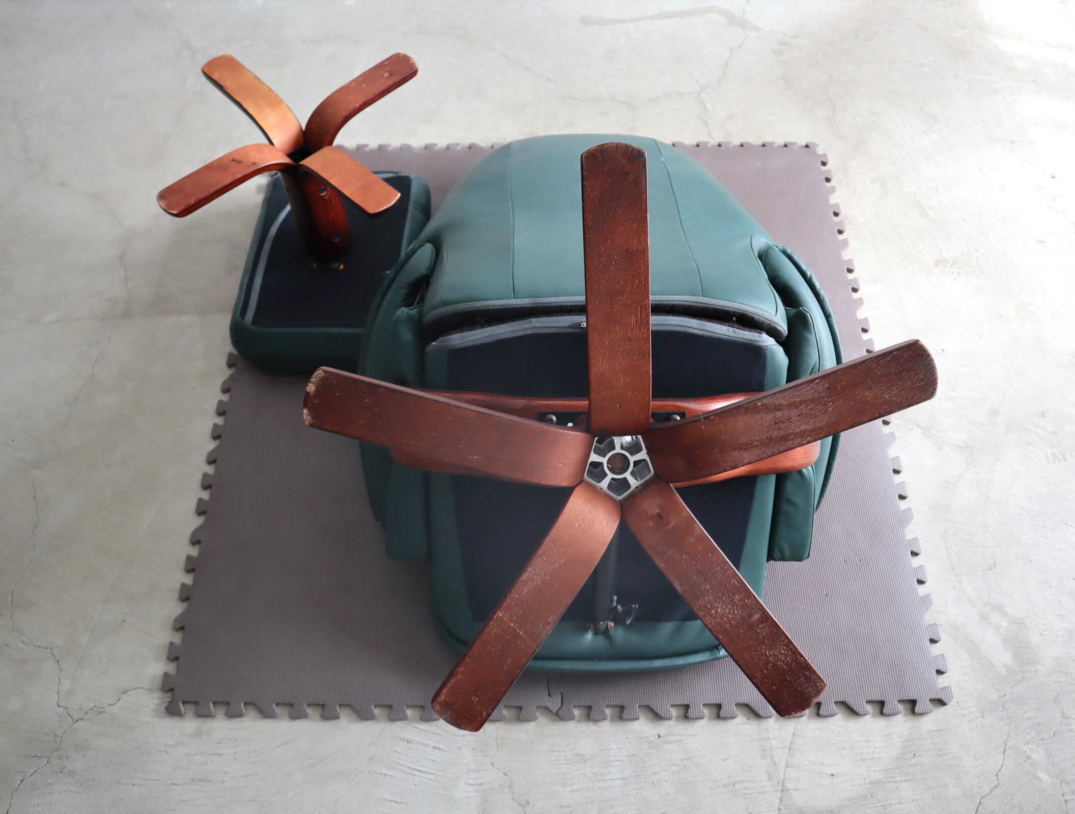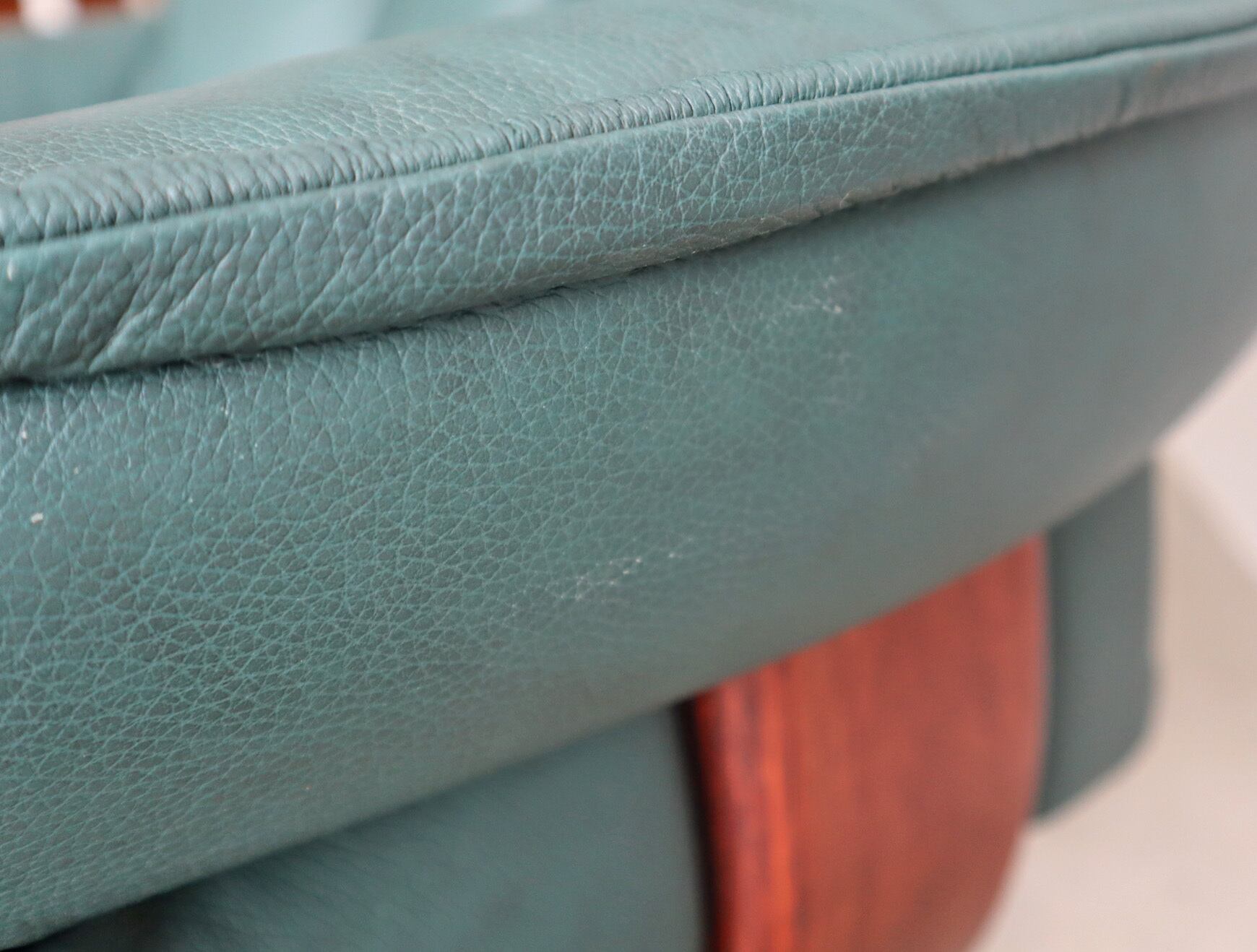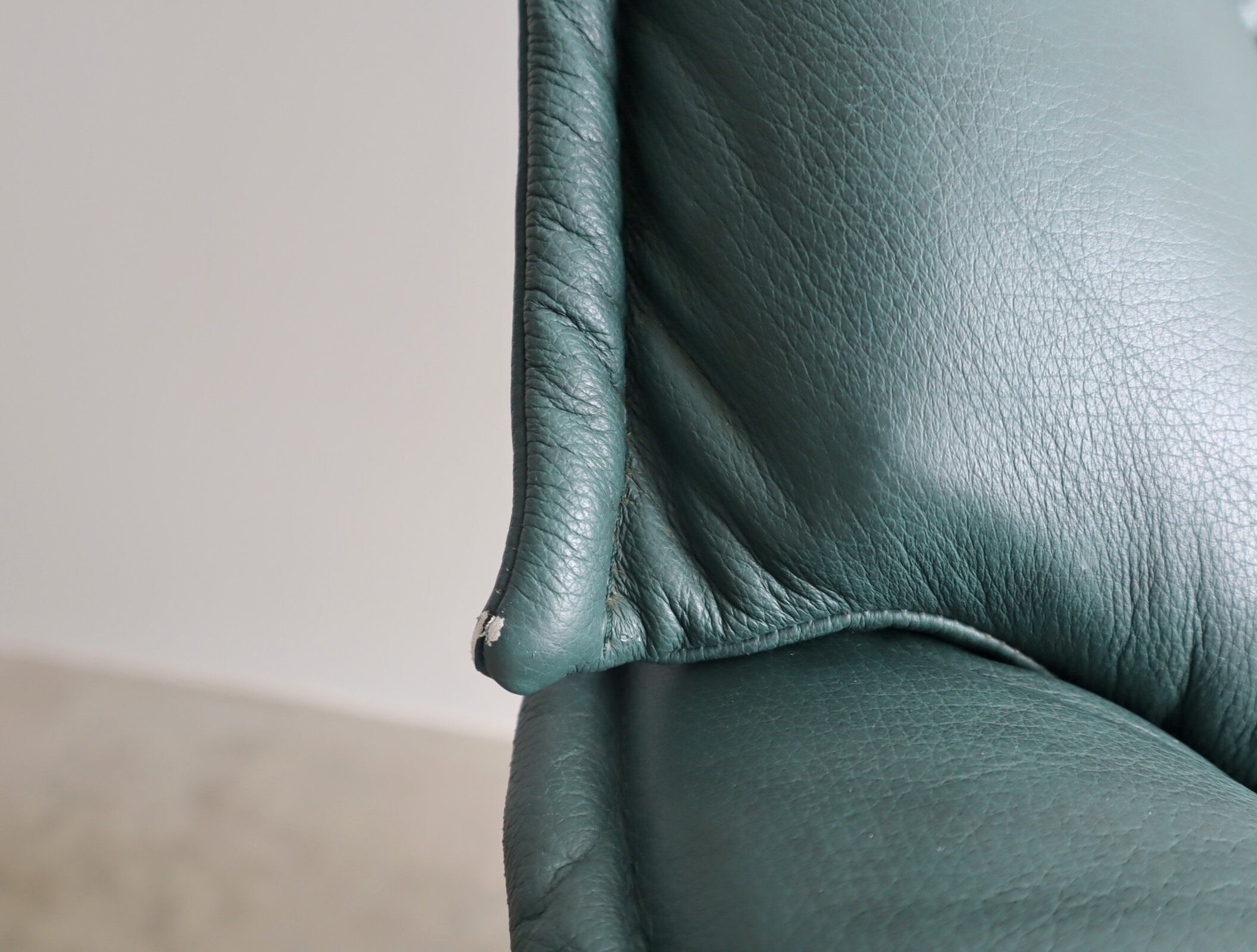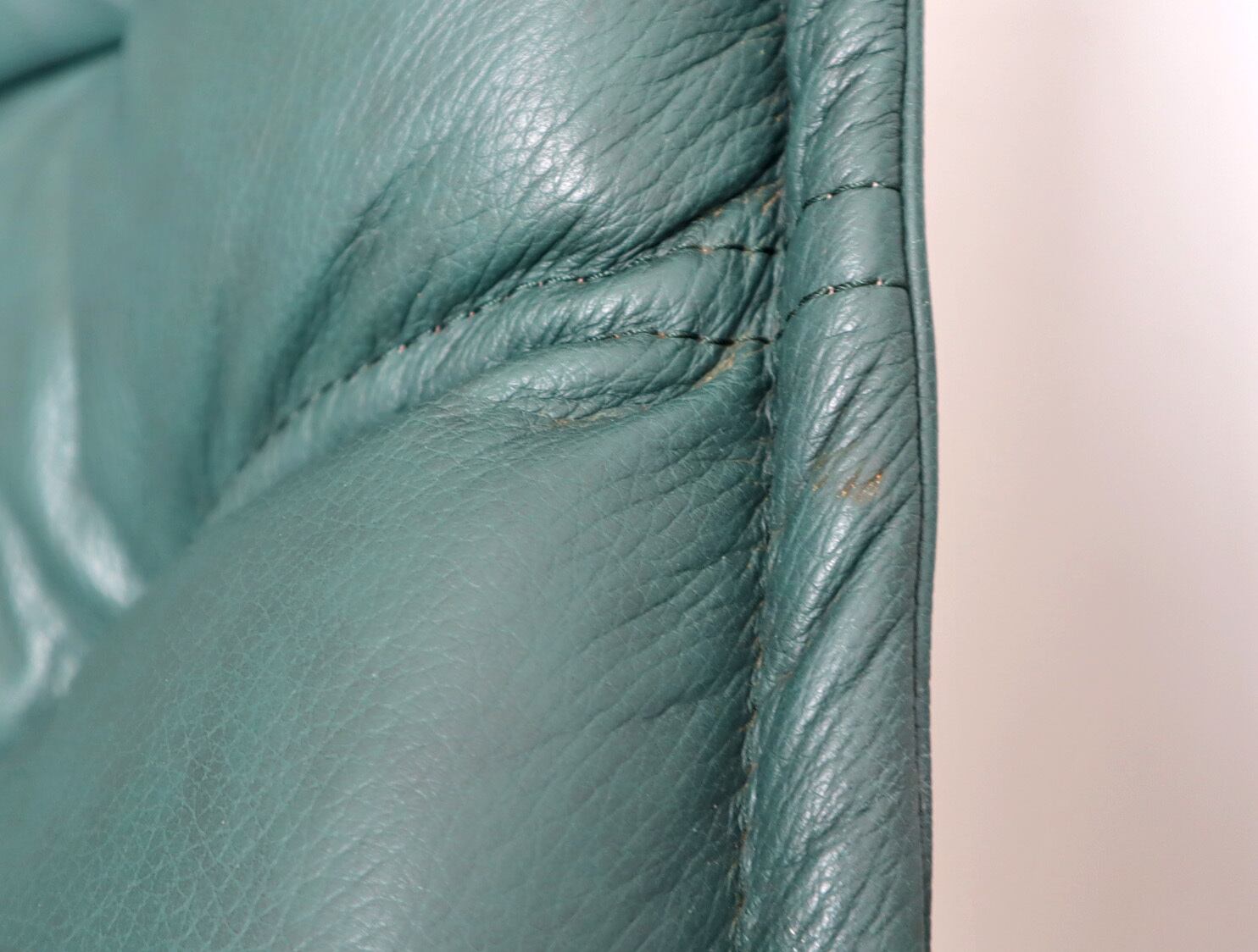 深い森を思わせるグリーンと、重厚感ある木脚が調和した佇まいは、ヴィンテージ家具としても存在感抜群。リビングに置くだけで、時間の流れをゆるやかに感じさせる特別な空気を生み出します。