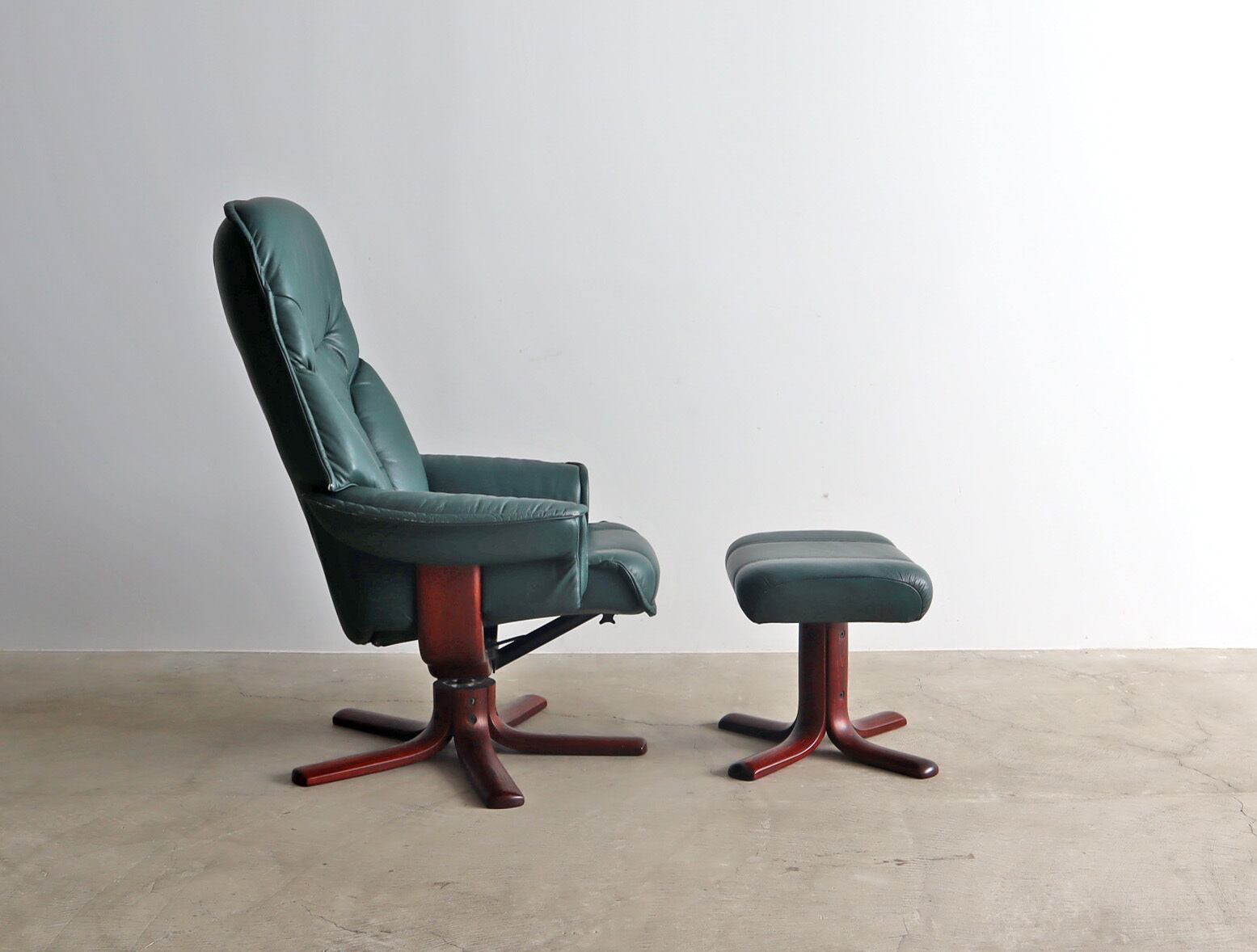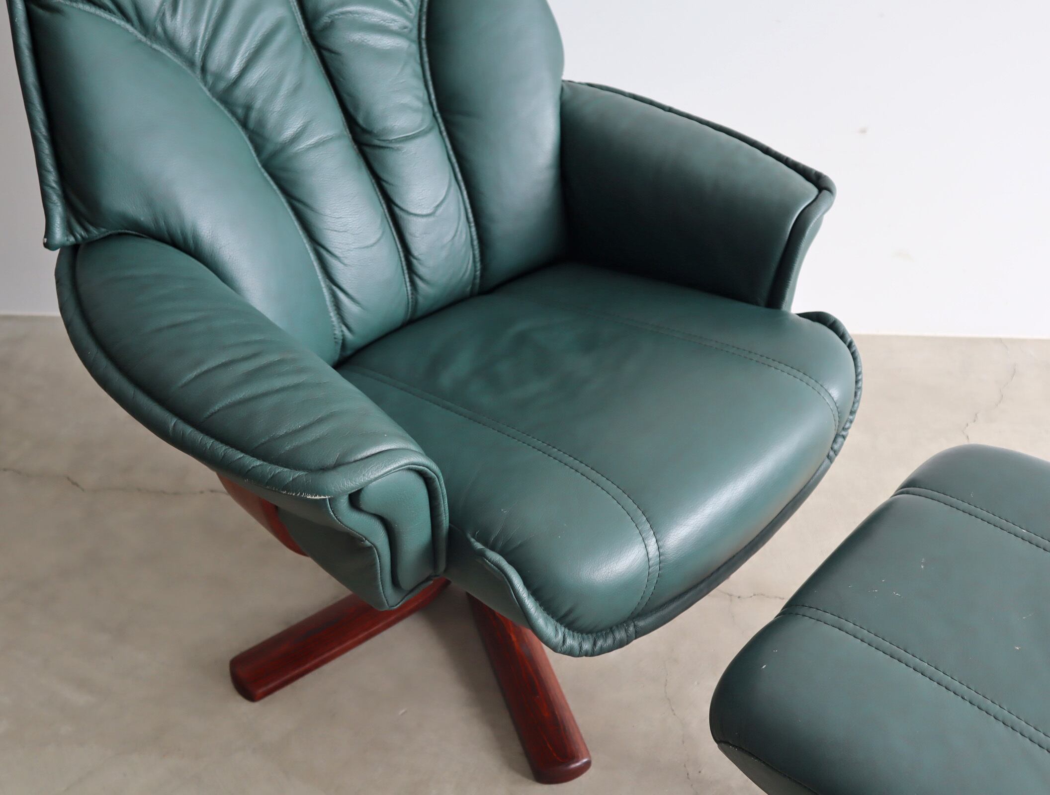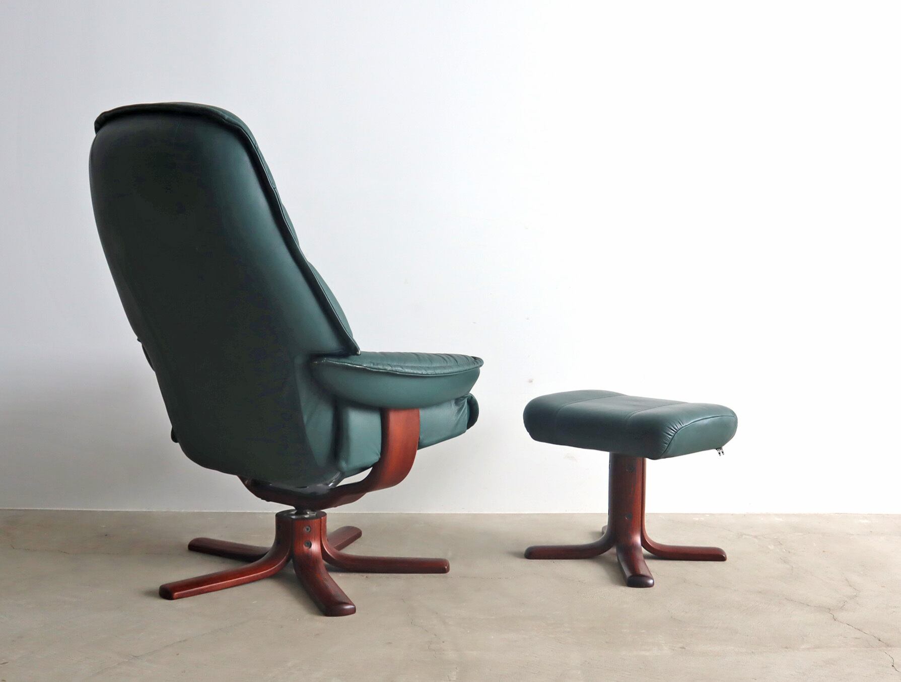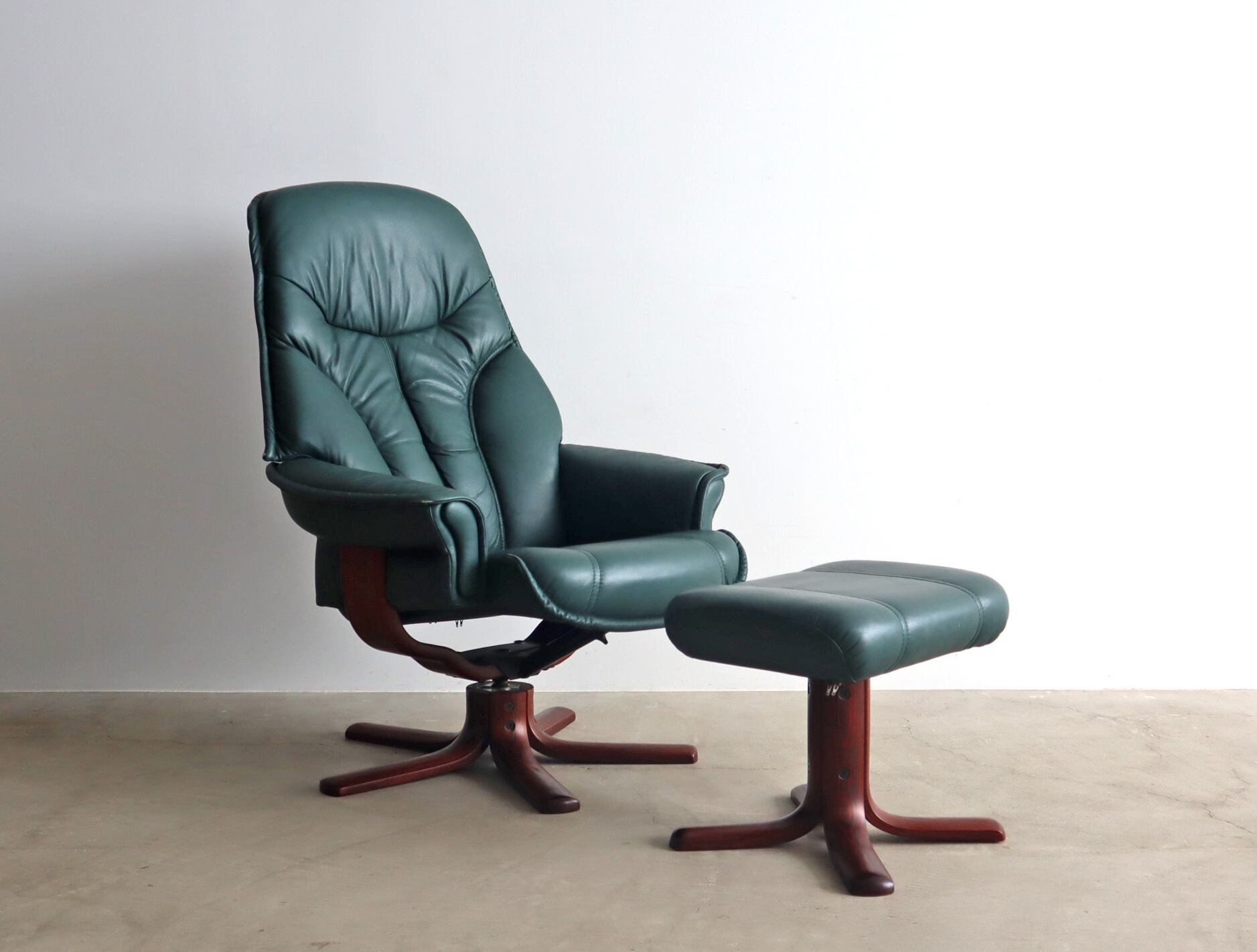 こちらのリクライニングチェアとオットマンのセットは美しい深緑のレザーと、温もりあるプライウッドのベースが織りなすコントラストが北欧家具ならではの上質さを物語ります。