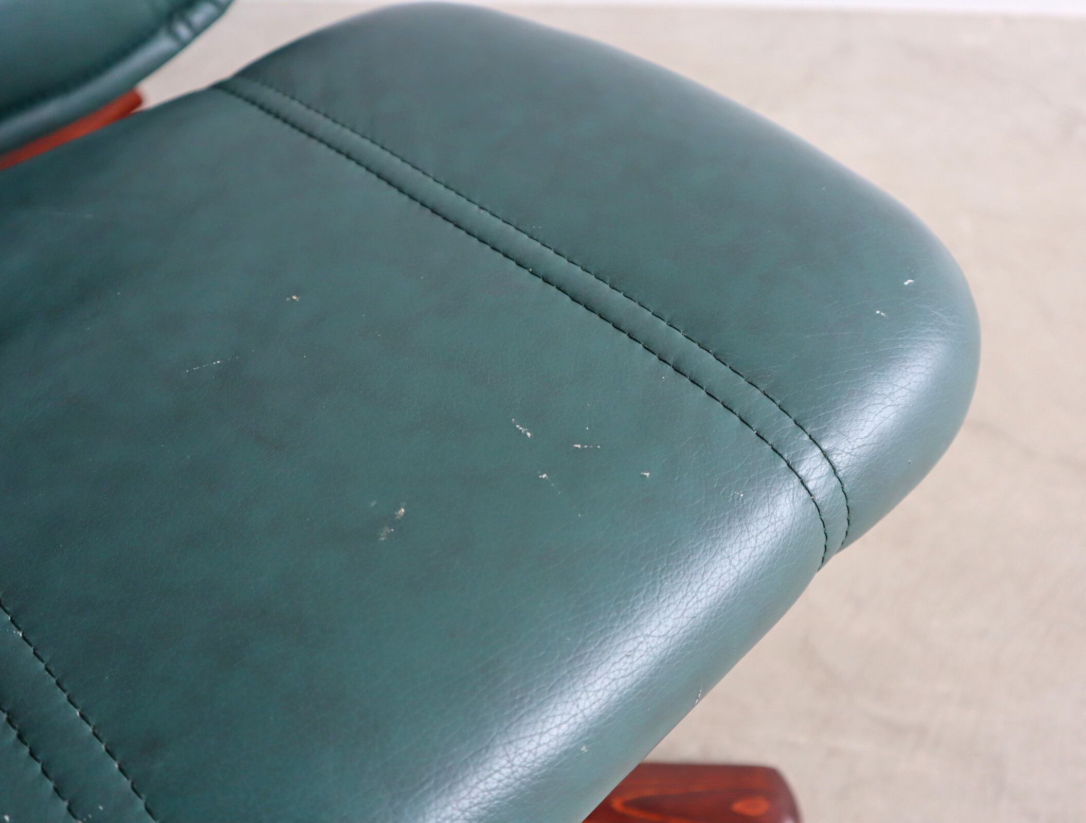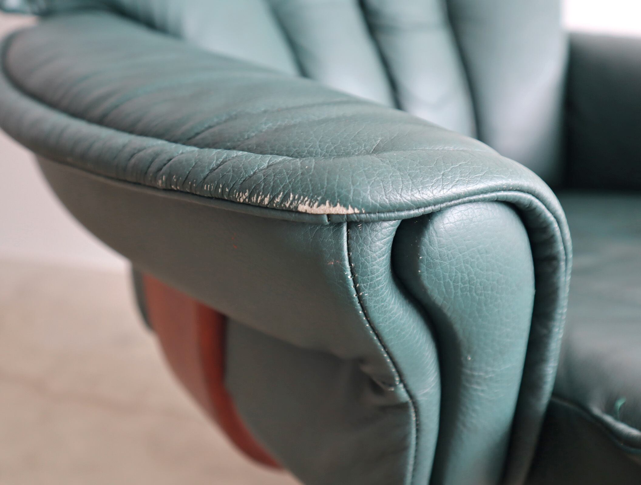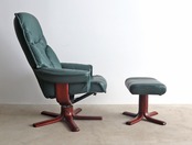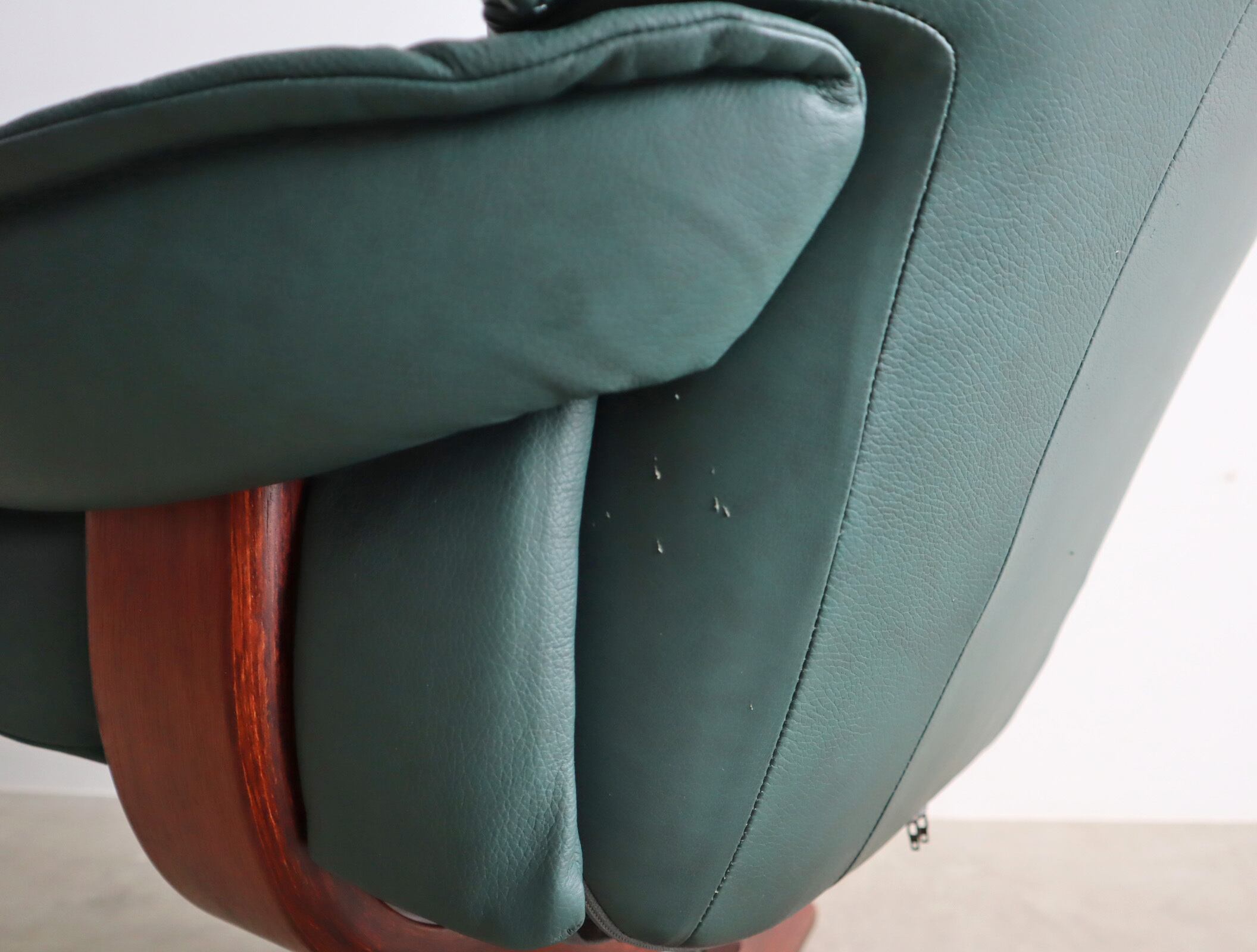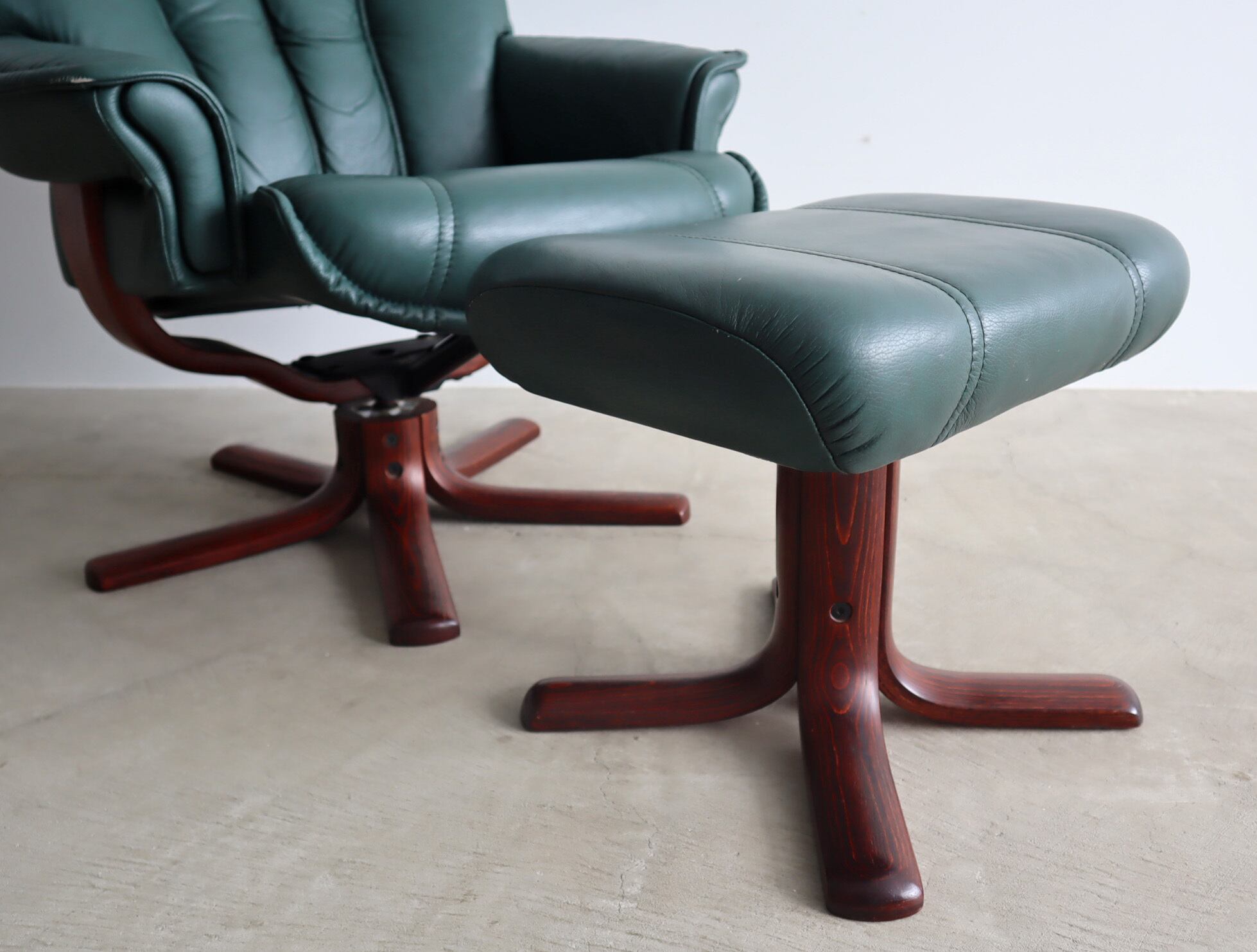 こちらのリクライニングチェアとオットマンのセットは美しい深緑のレザーと、温もりあるプライウッドのベースが織りなすコントラストが北欧家具ならではの上質さを物語ります。