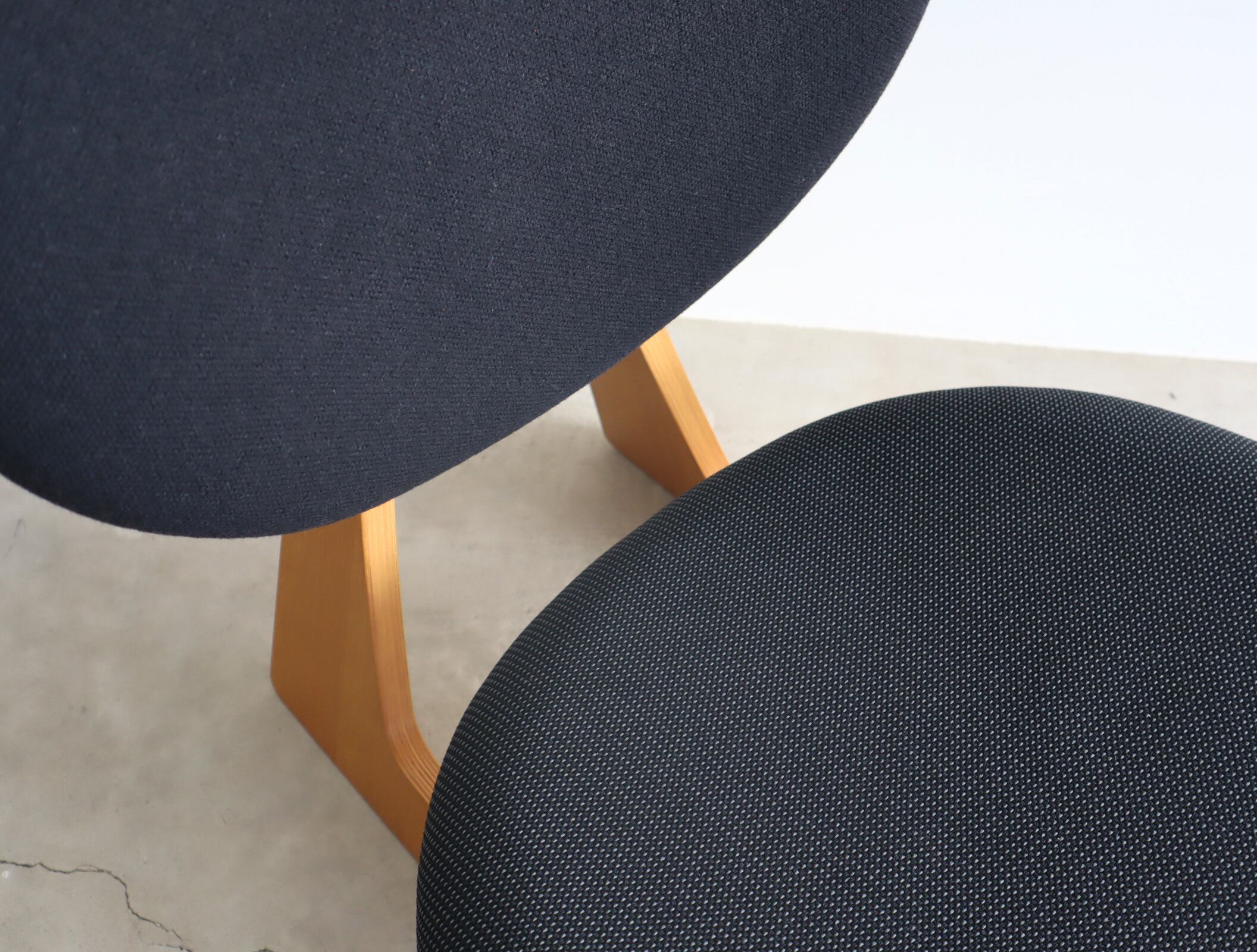 座面は炭黒にグレーの横糸を使用したざっくりとした立体感のある平織、背面は黒単色の細かい平織、画像におきましては光の当たり加減で濃紺のような印象もございますが、厳密に表現いたしますと張地のカラーは背もたれ、座面、総じてブラックになります。
