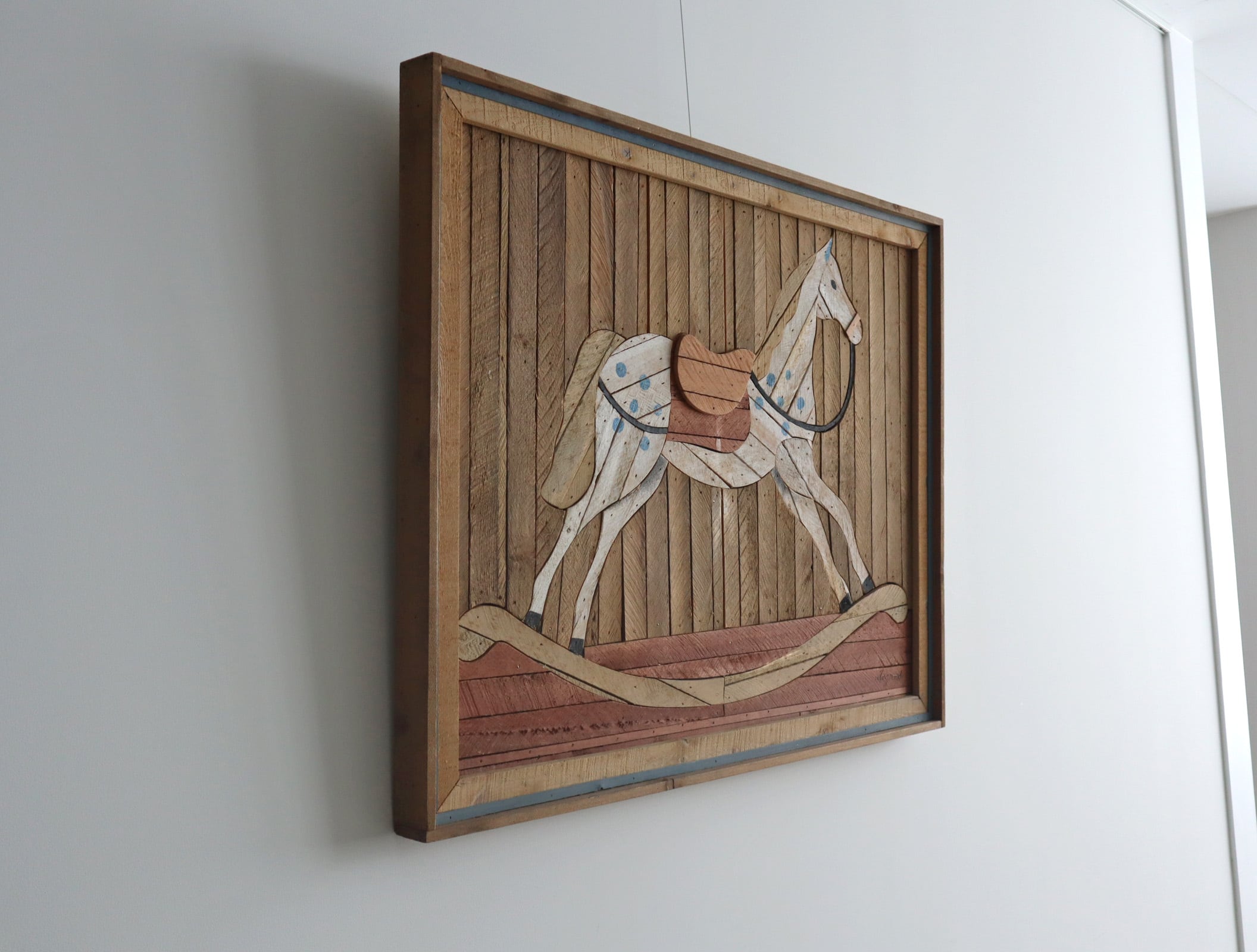 木片を丁寧に組み合わせてロッキングホースを描いた一枚です。