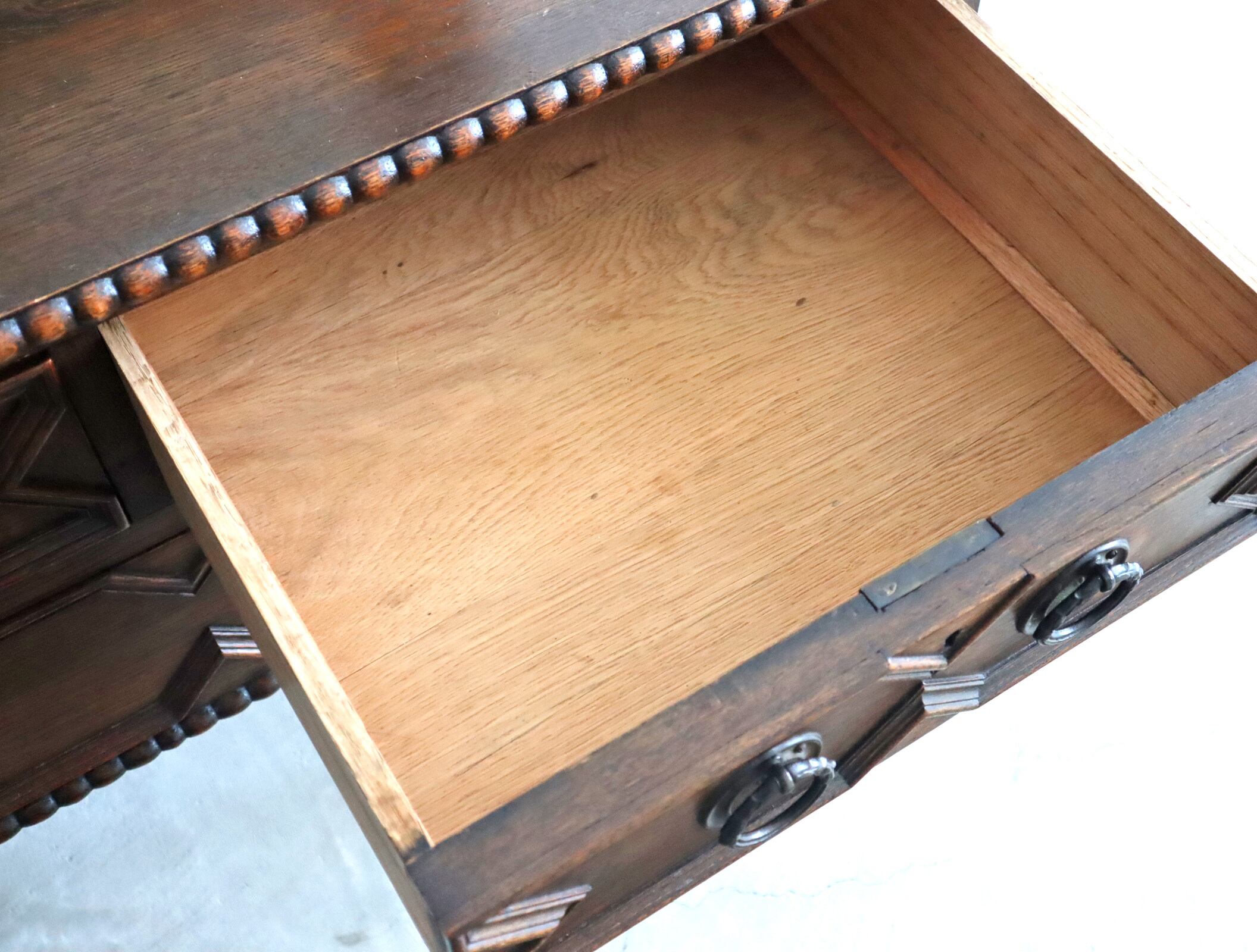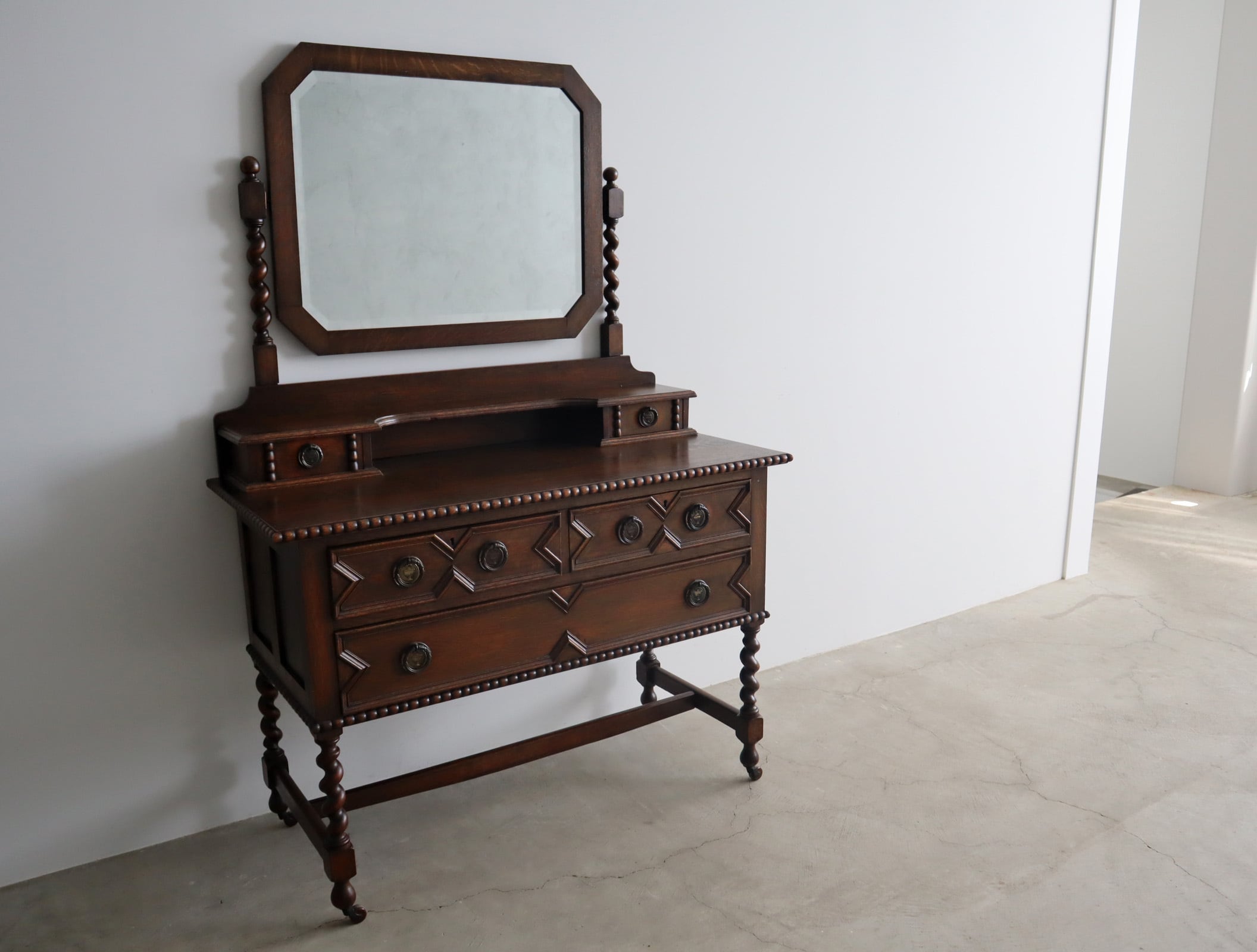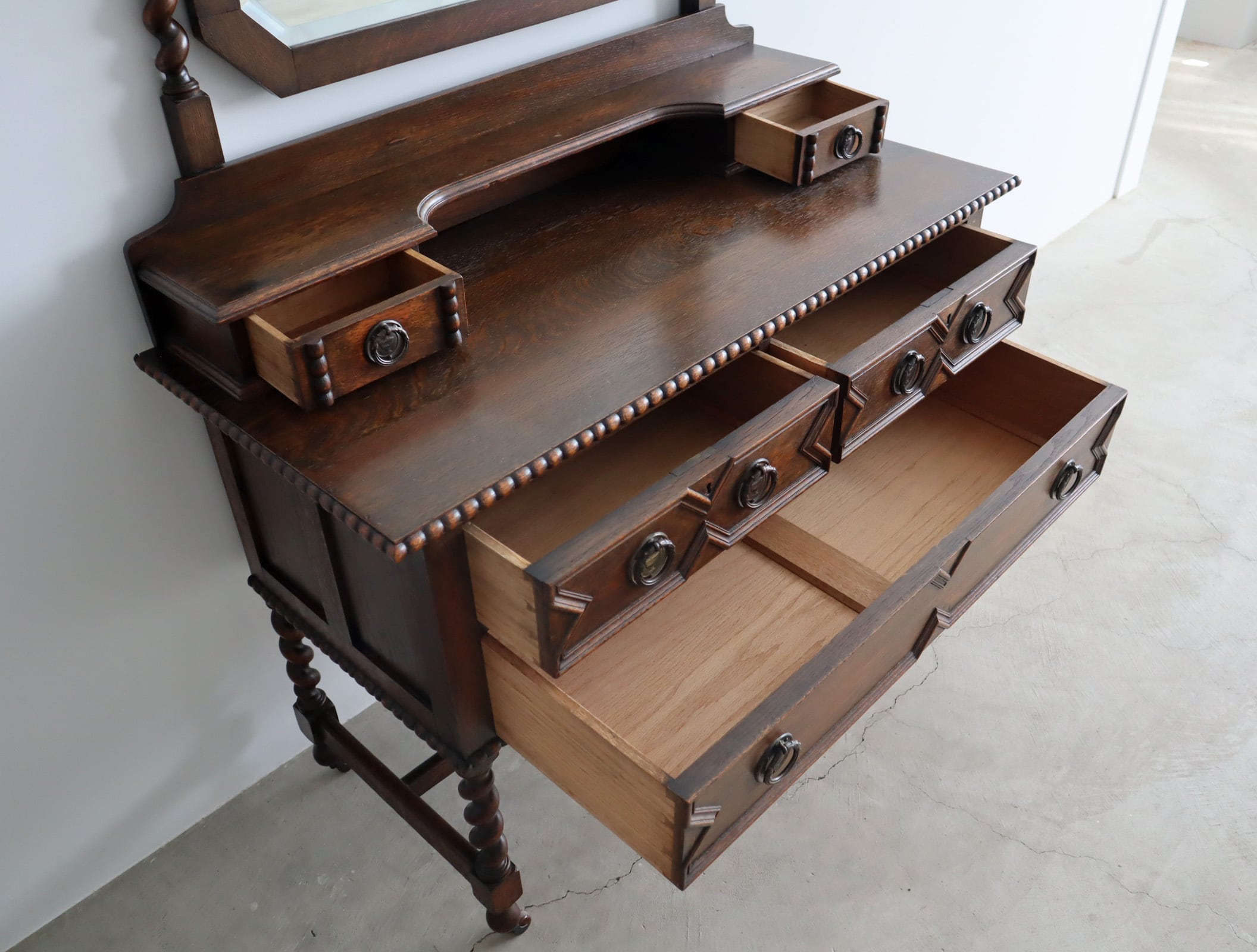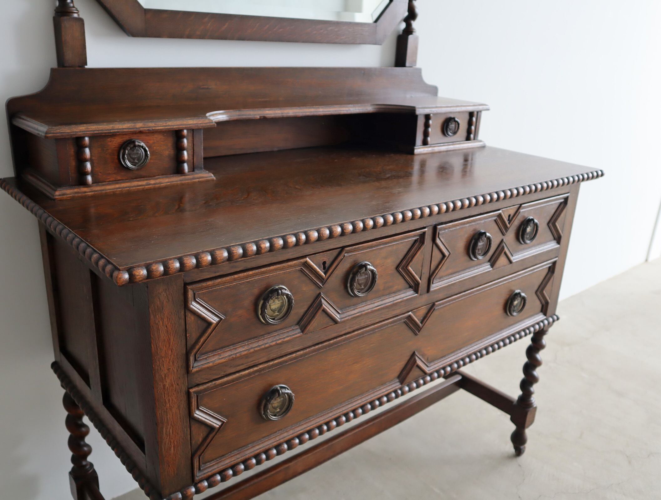 引き出し部分には立体的なモールディングが施され、実用性と装飾性を両立、ミラー背板と上段小引き出しの底板のみベニヤですが、他は全てオーク無垢材が用いられた贅沢な仕様。