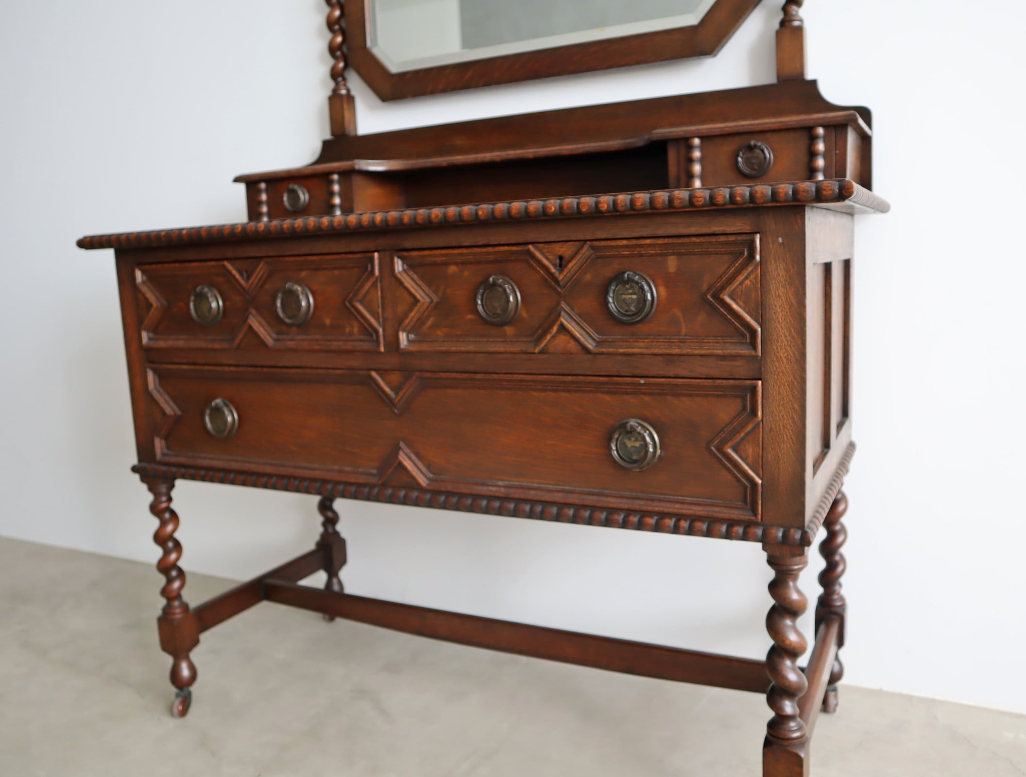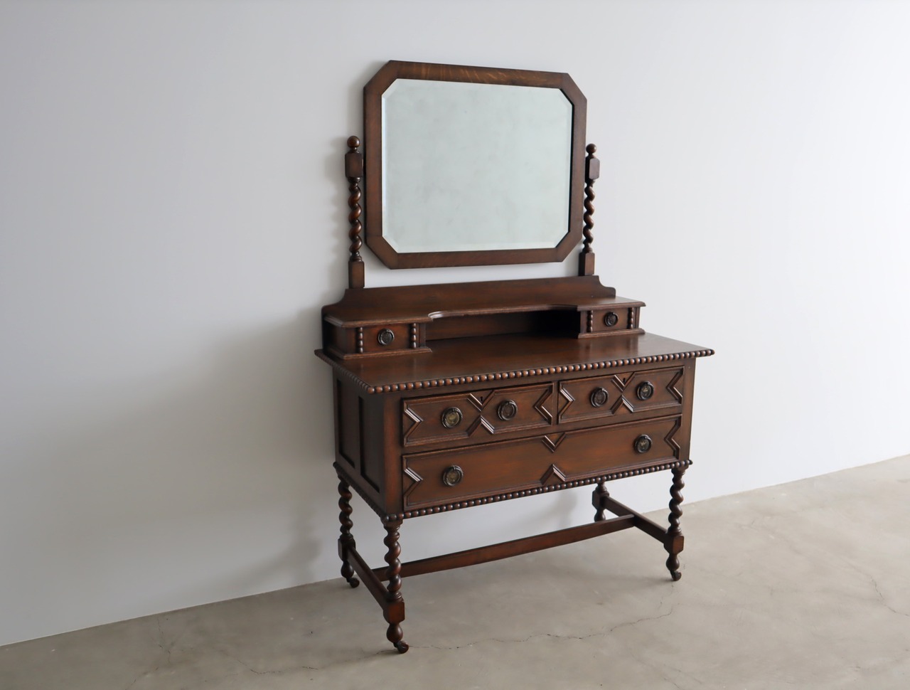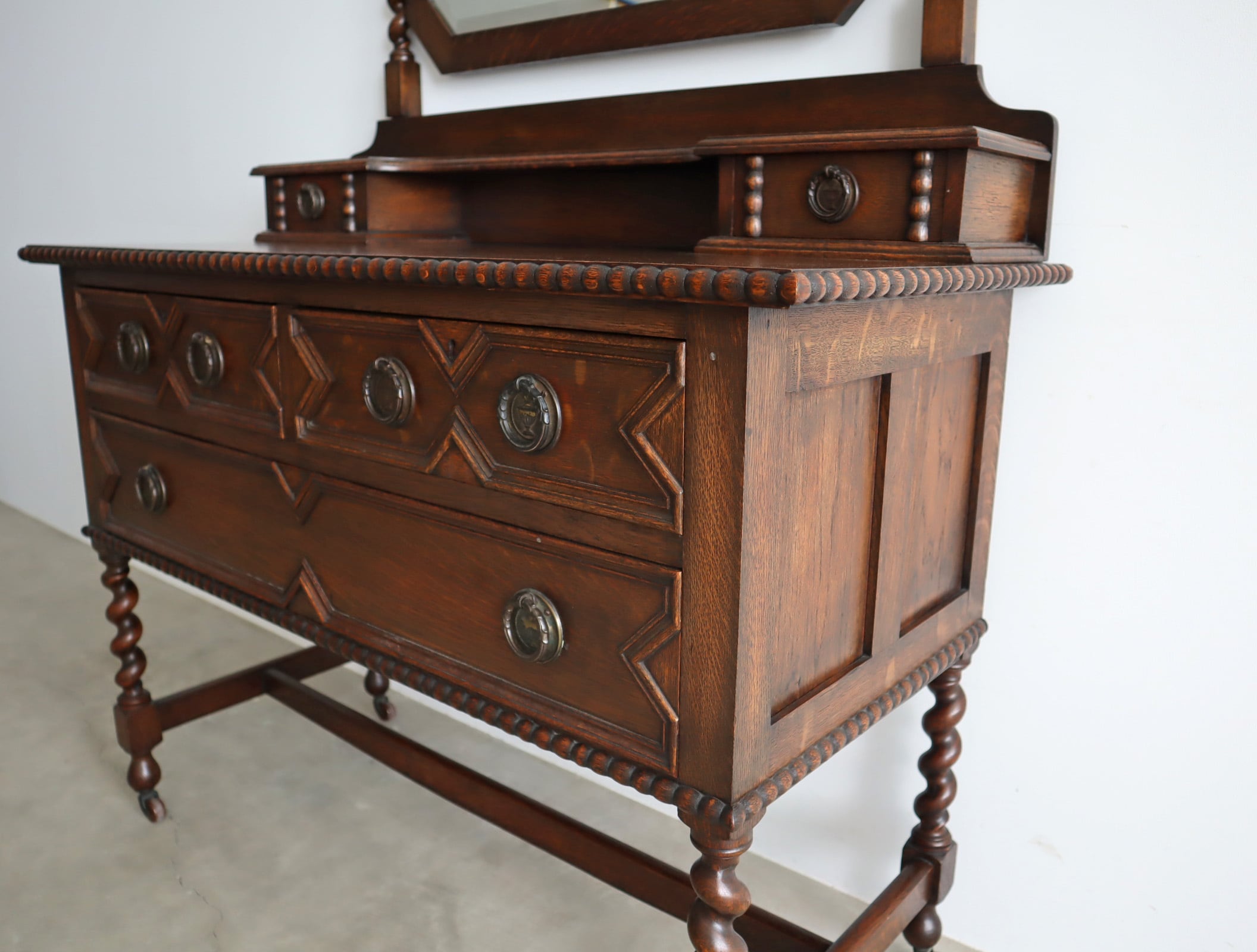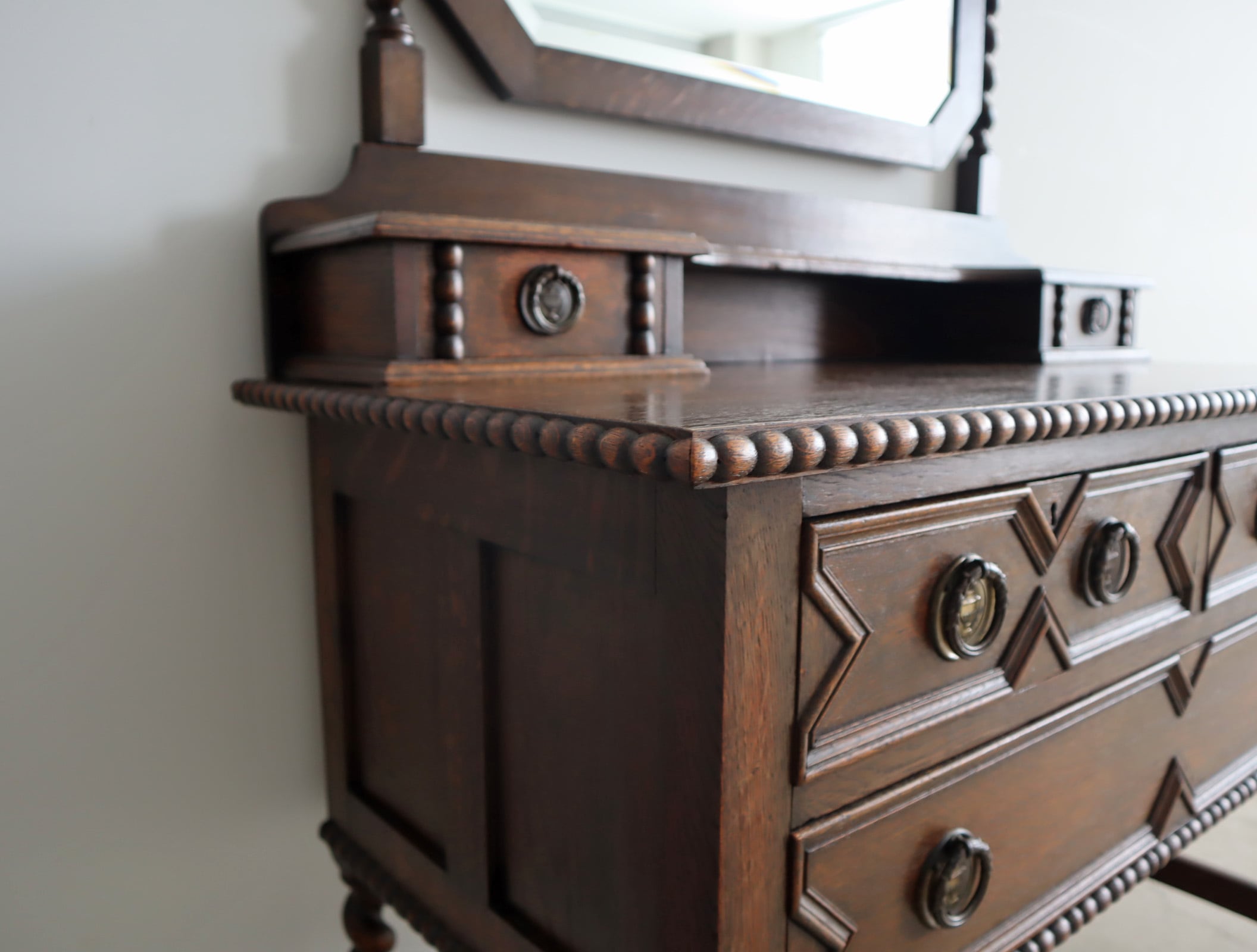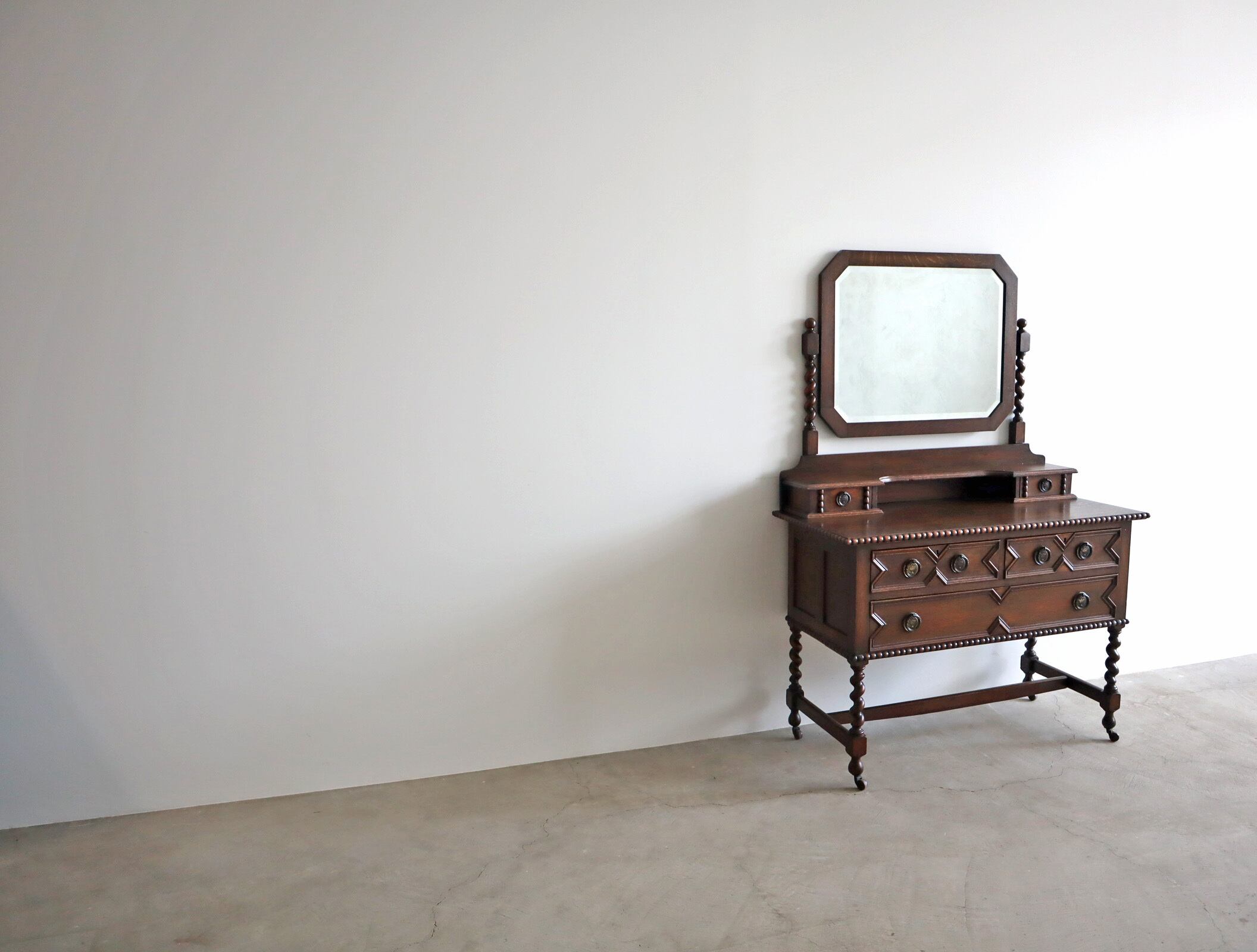 引き出し部分には立体的なモールディングが施され、実用性と装飾性を両立、ミラー背板と上段小引き出しの底板のみベニヤですが、他は全てオーク無垢材が用いられた贅沢な仕様。