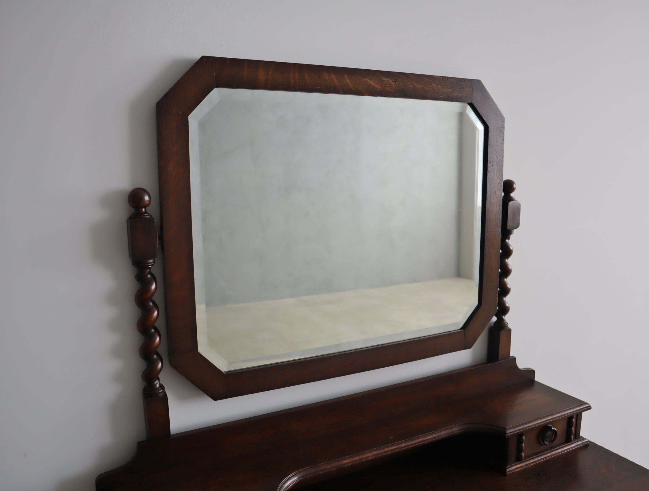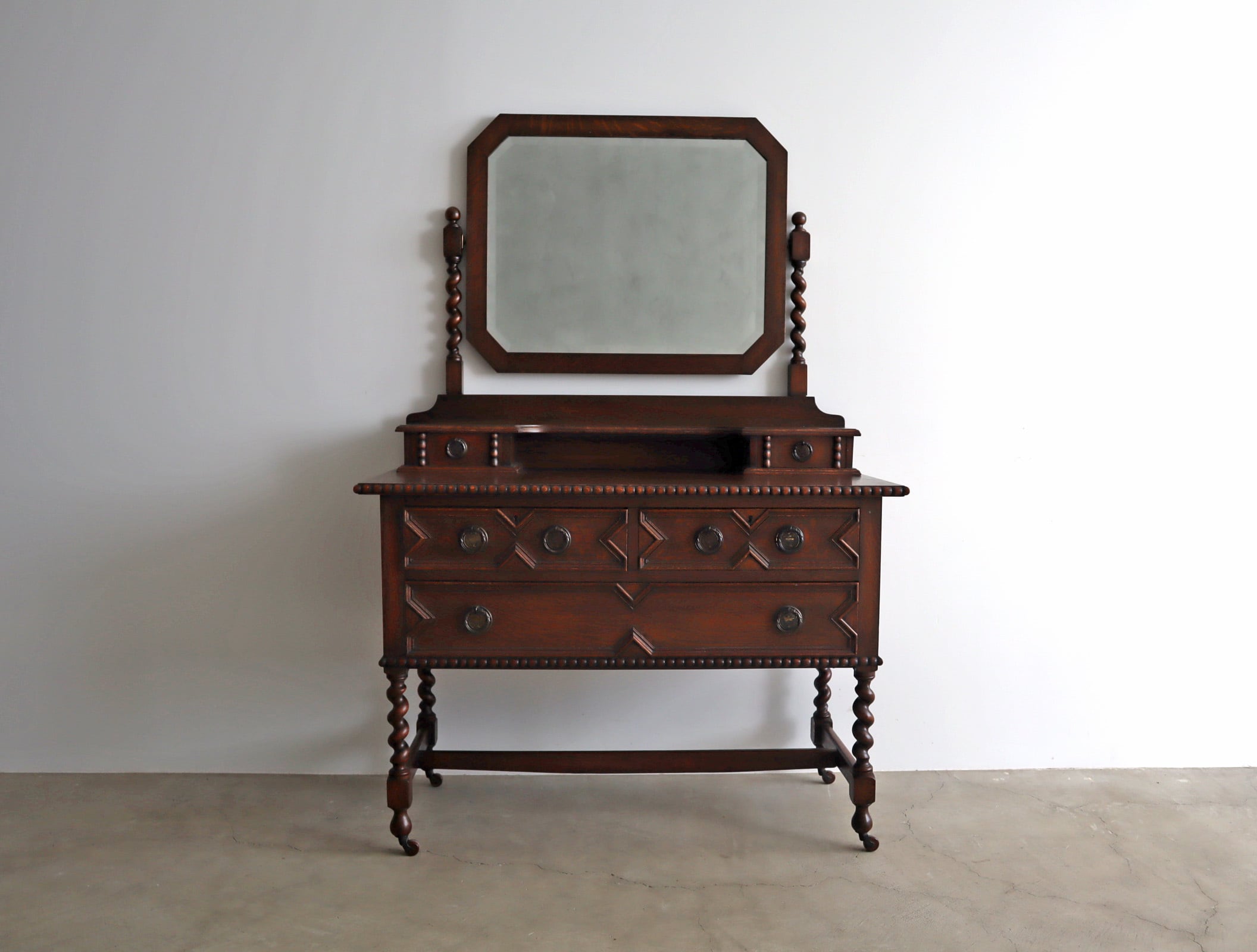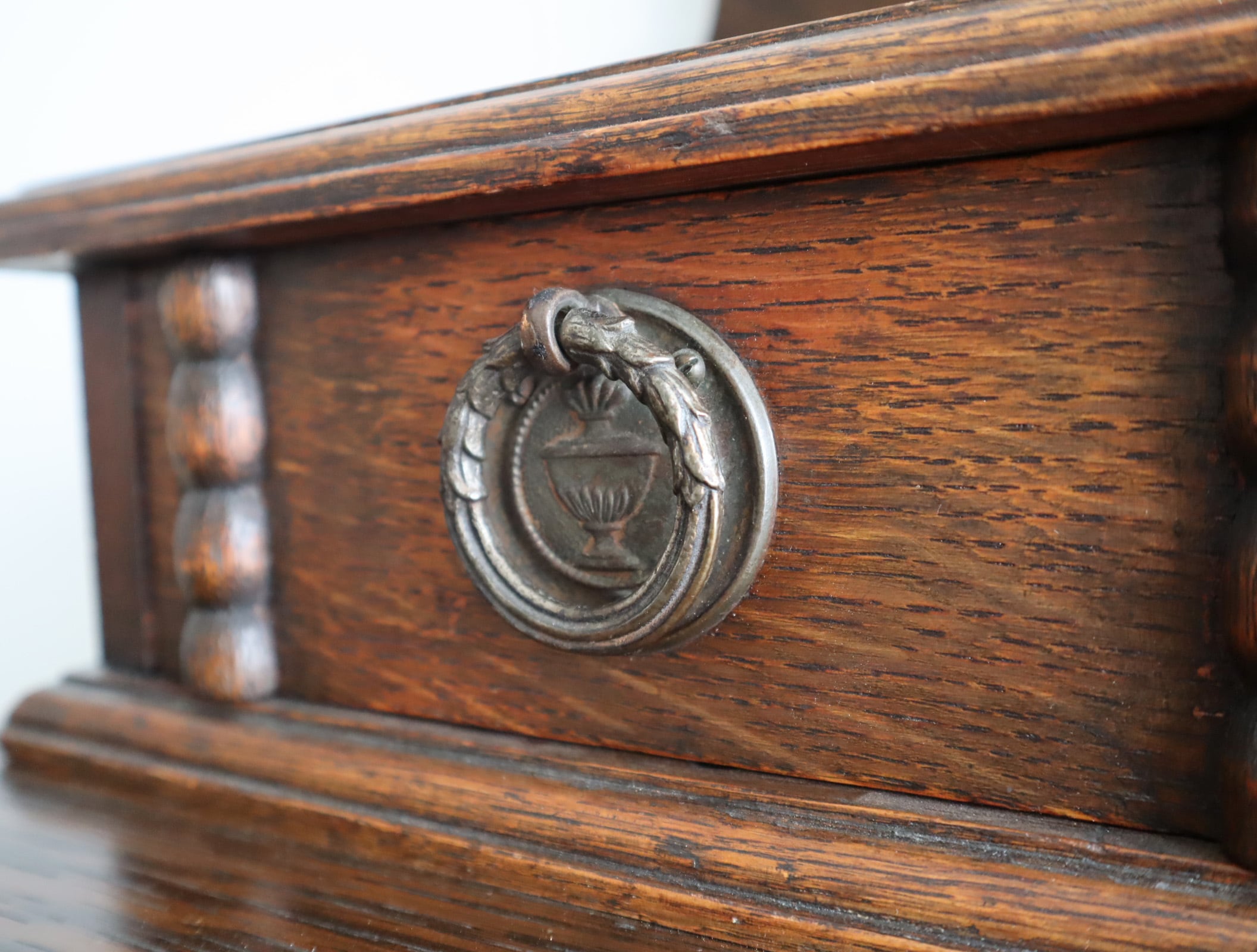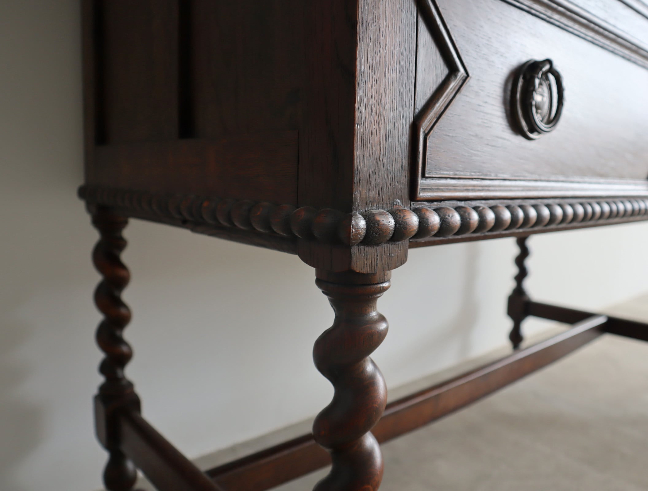 引き出し部分には立体的なモールディングが施され、実用性と装飾性を両立、ミラー背板と上段小引き出しの底板のみベニヤですが、他は全てオーク無垢材が用いられた贅沢な仕様。