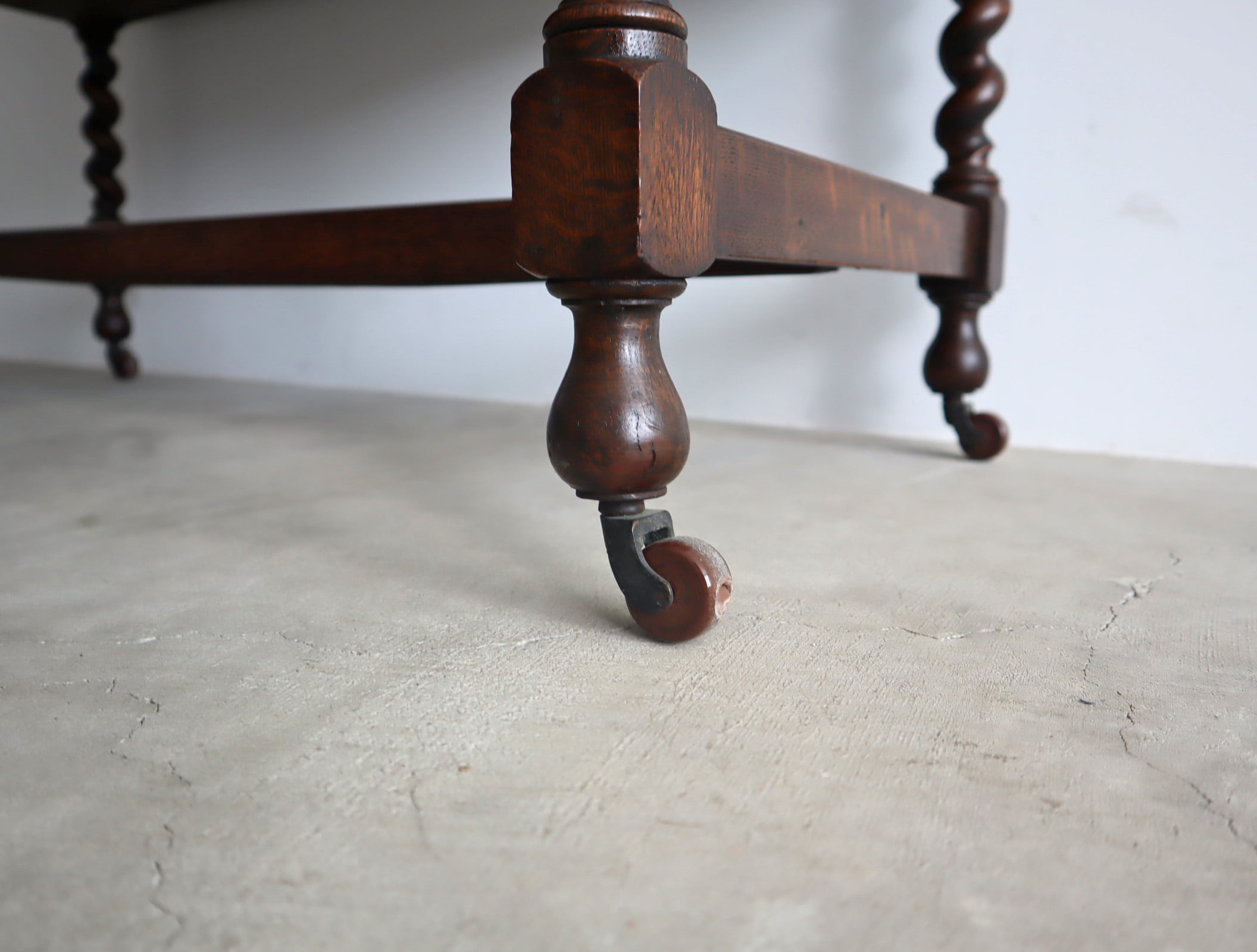 深みのあるダークブラウンの木肌に、丁寧な装飾とツイストの支柱が美しく映える一台です。