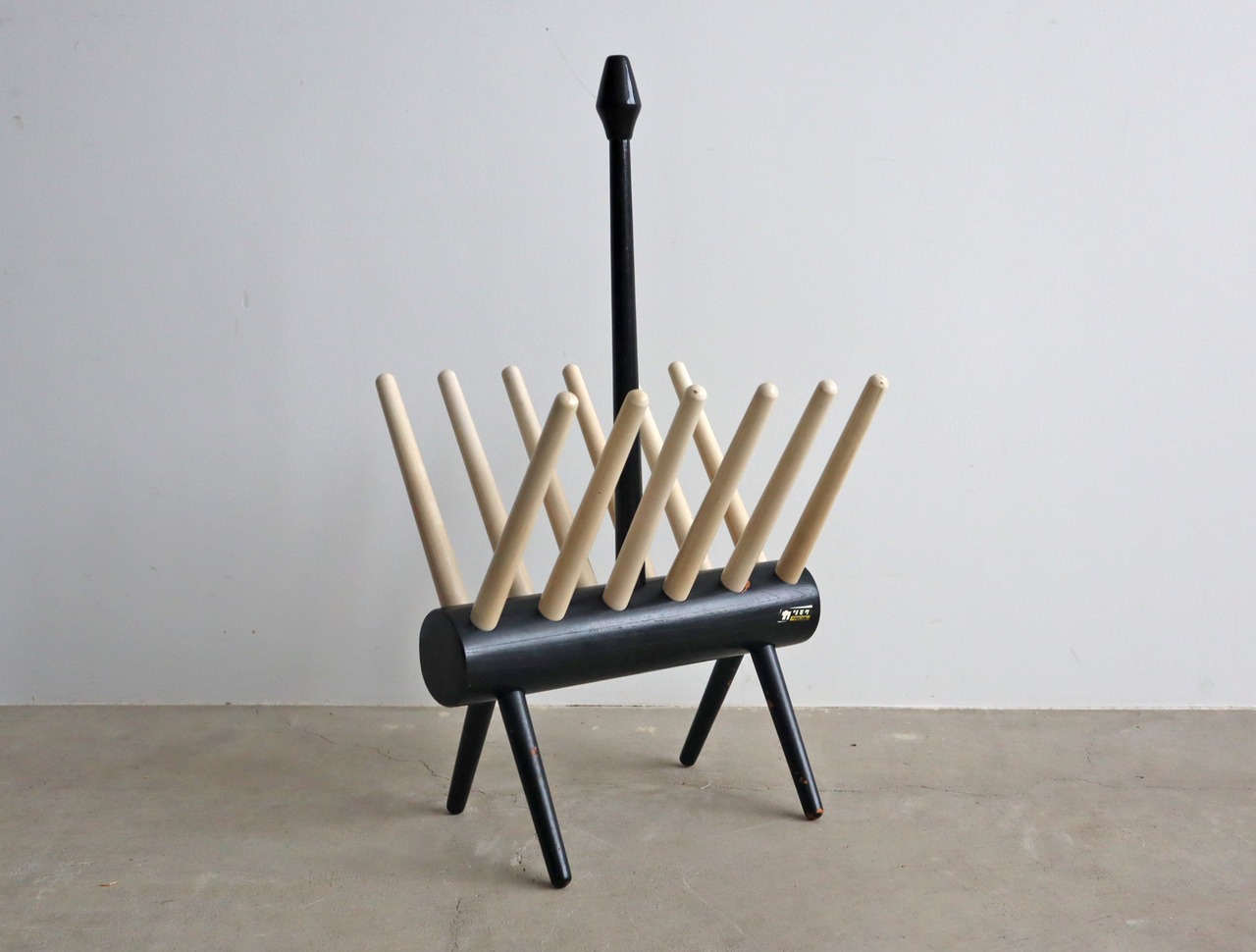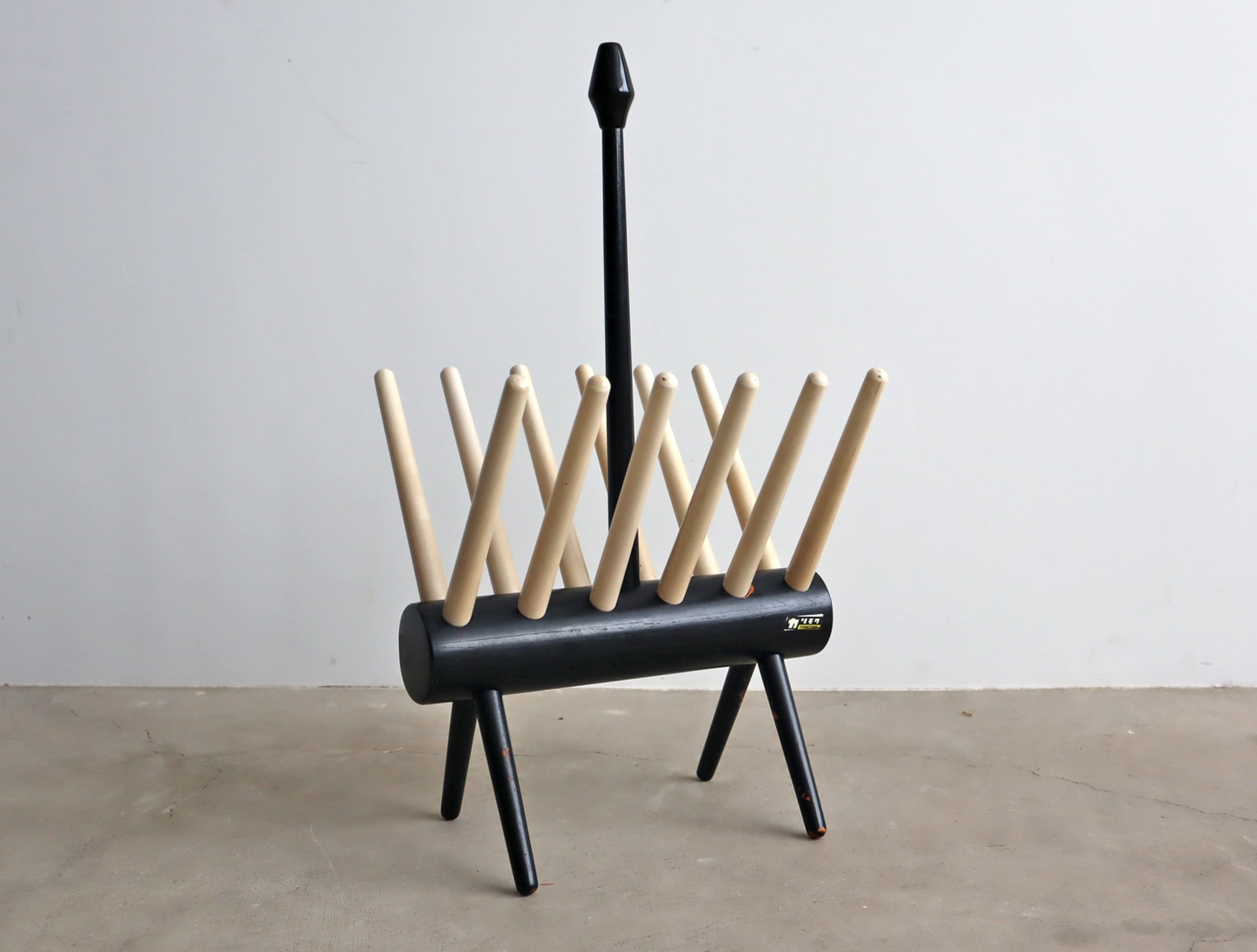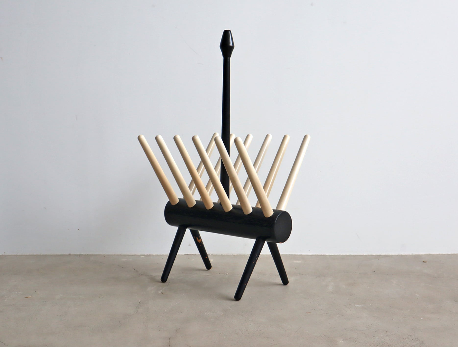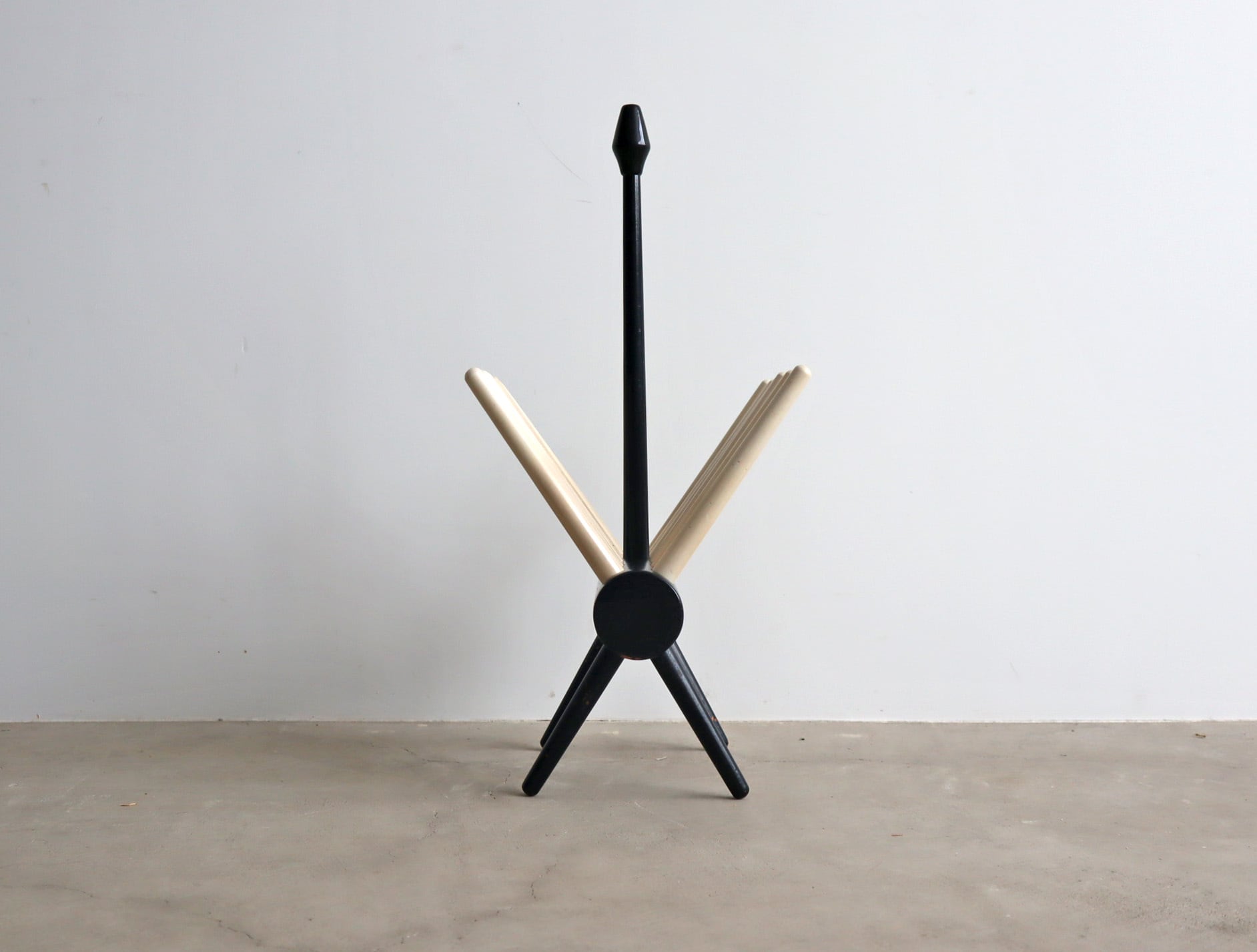 丸みを帯びた脚部と放射状に広がるホルダーがシンプルな空間に心地よいアクセントを添え、木の温もりと構造美が融合したフォルムは、実用家具でありながらオブジェのような存在感を放ちます。