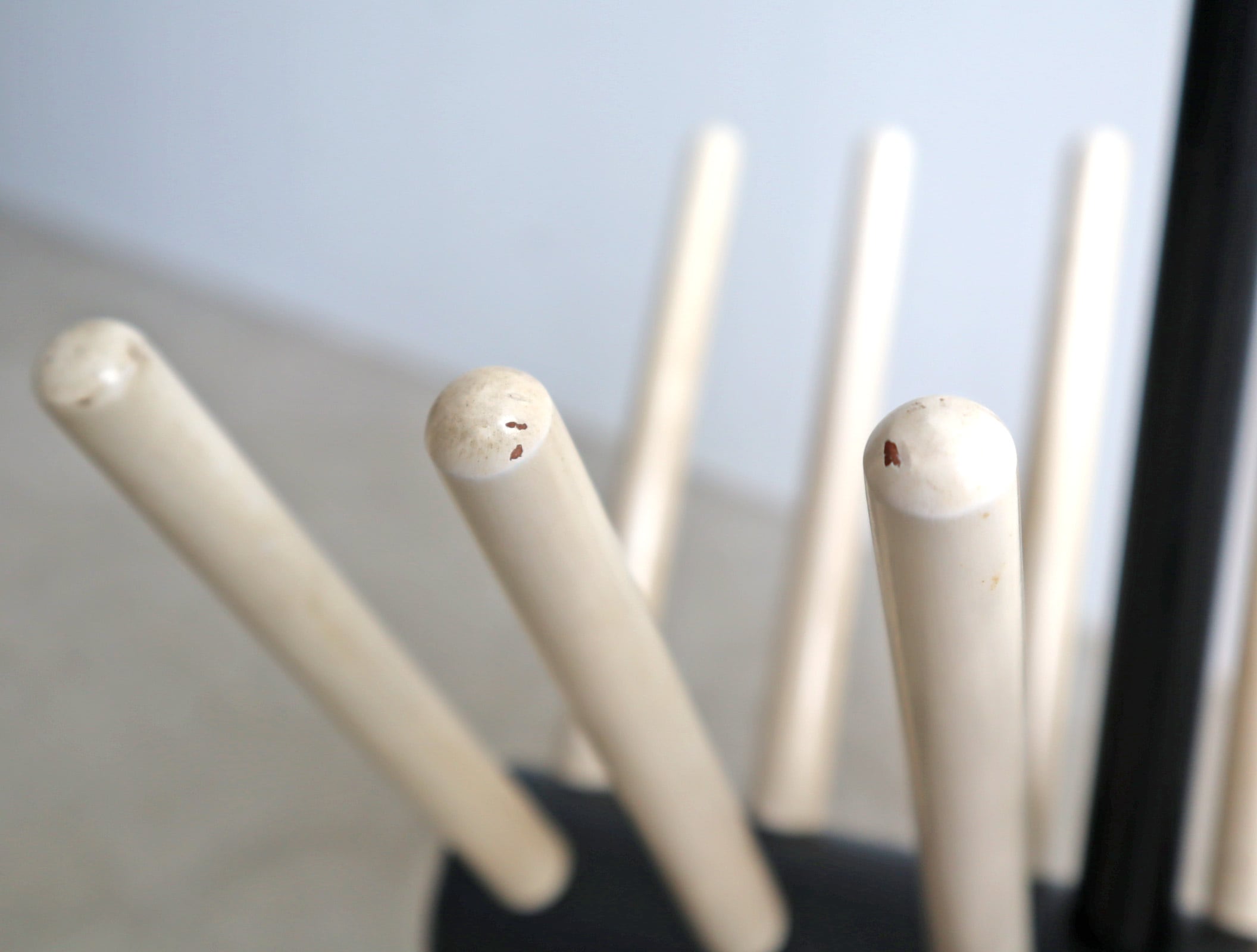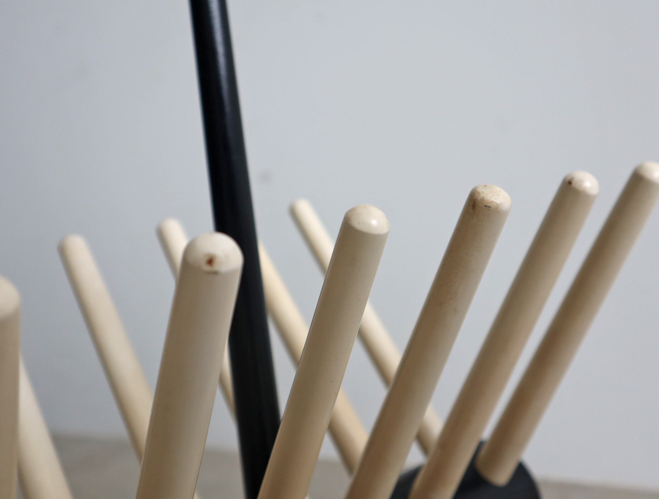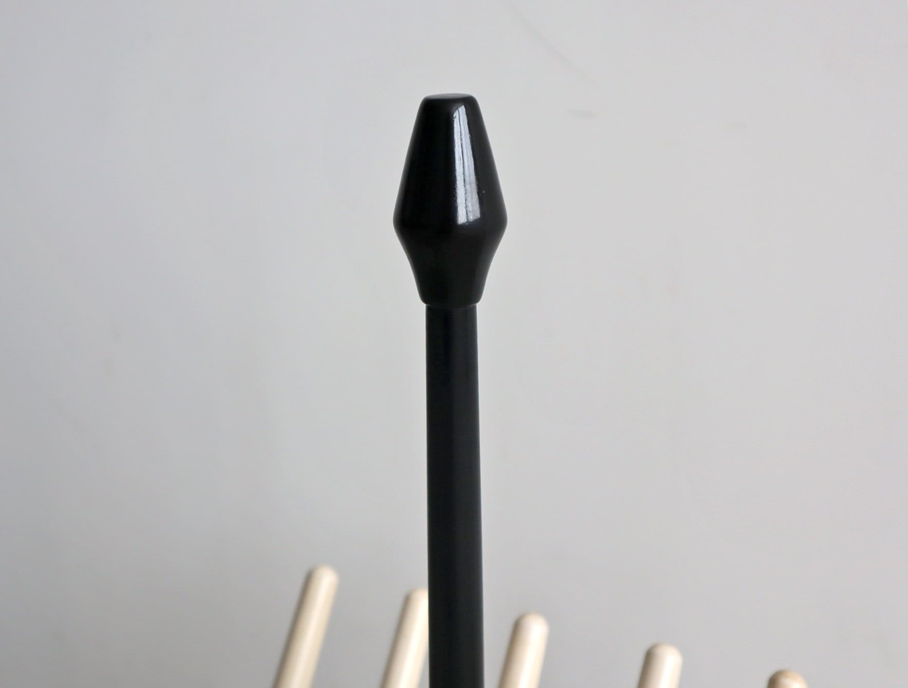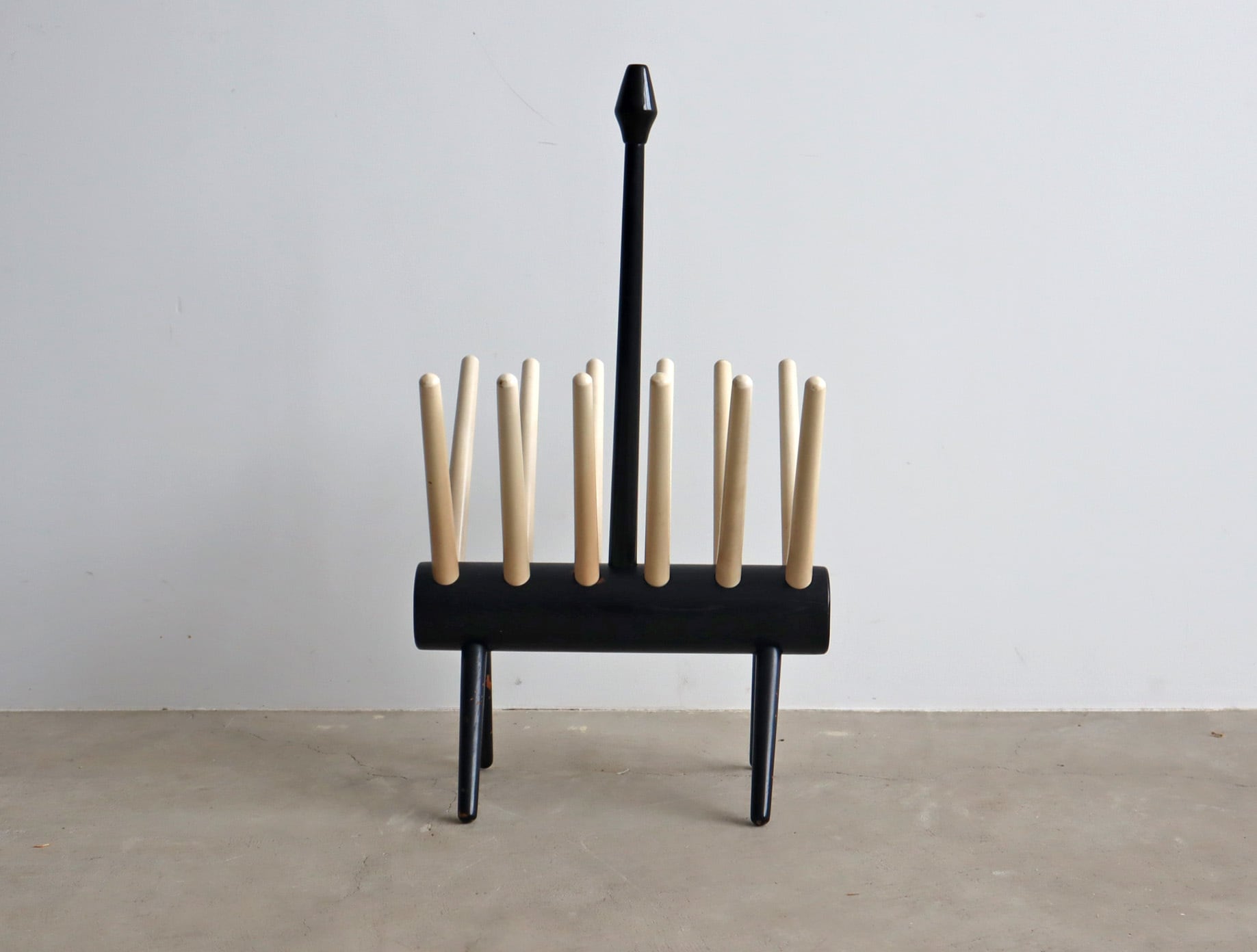 丸みを帯びた脚部と放射状に広がるホルダーがシンプルな空間に心地よいアクセントを添え、木の温もりと構造美が融合したフォルムは、実用家具でありながらオブジェのような存在感を放ちます。