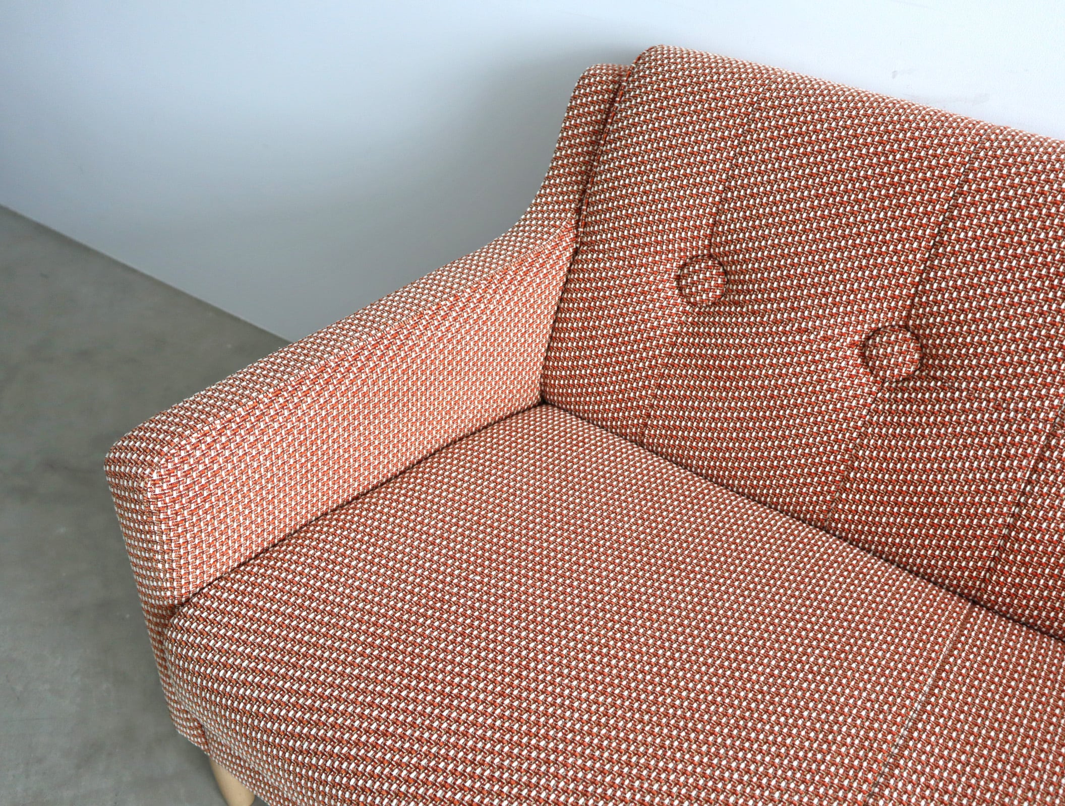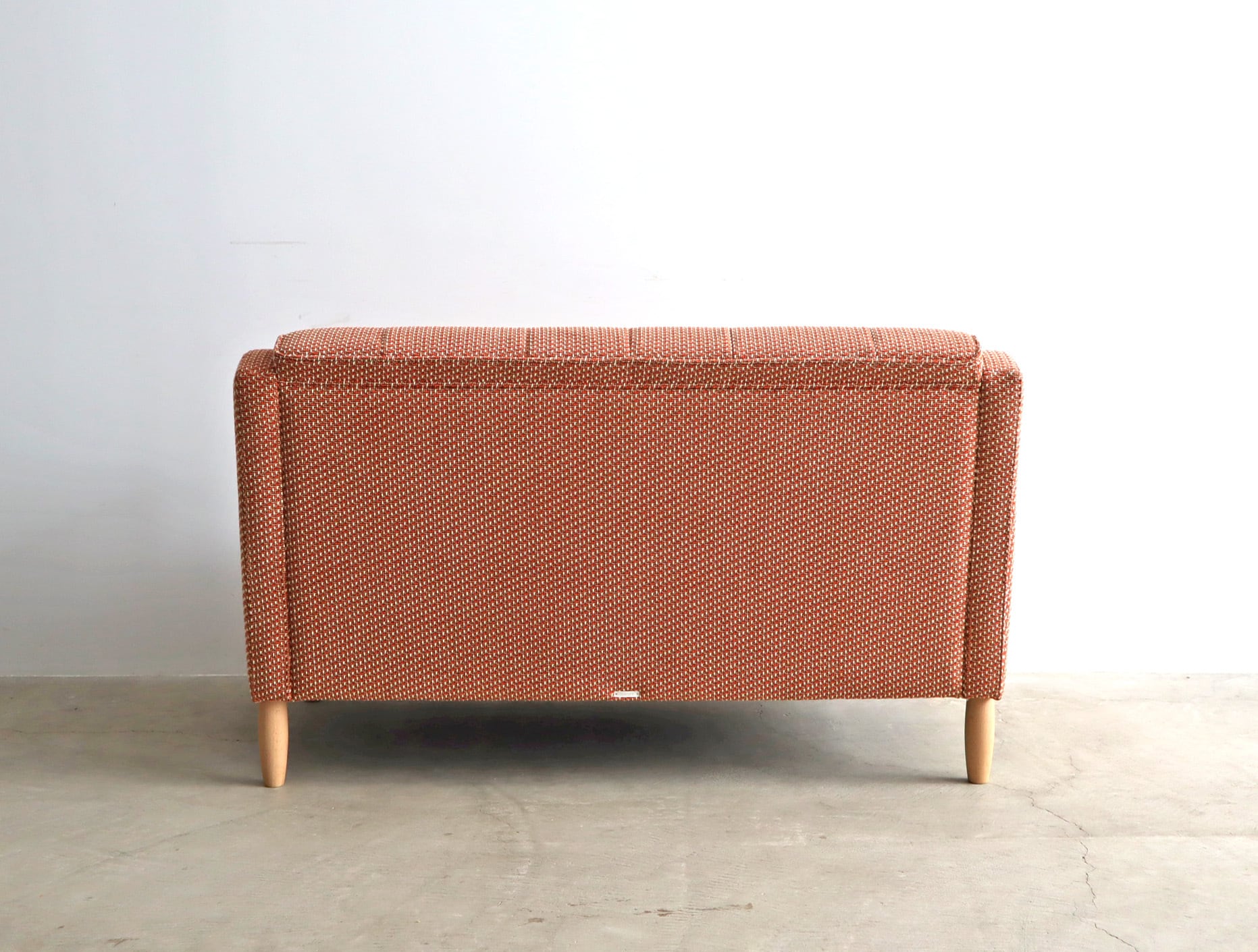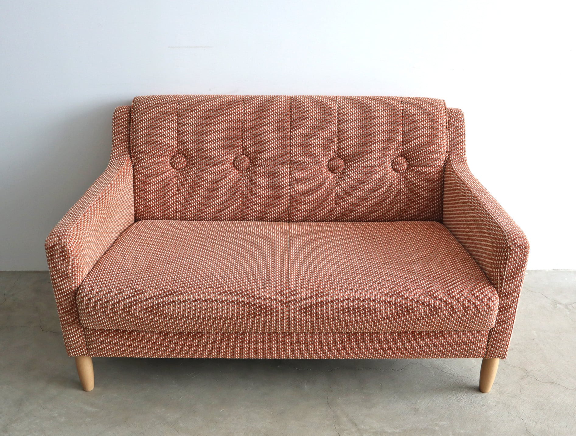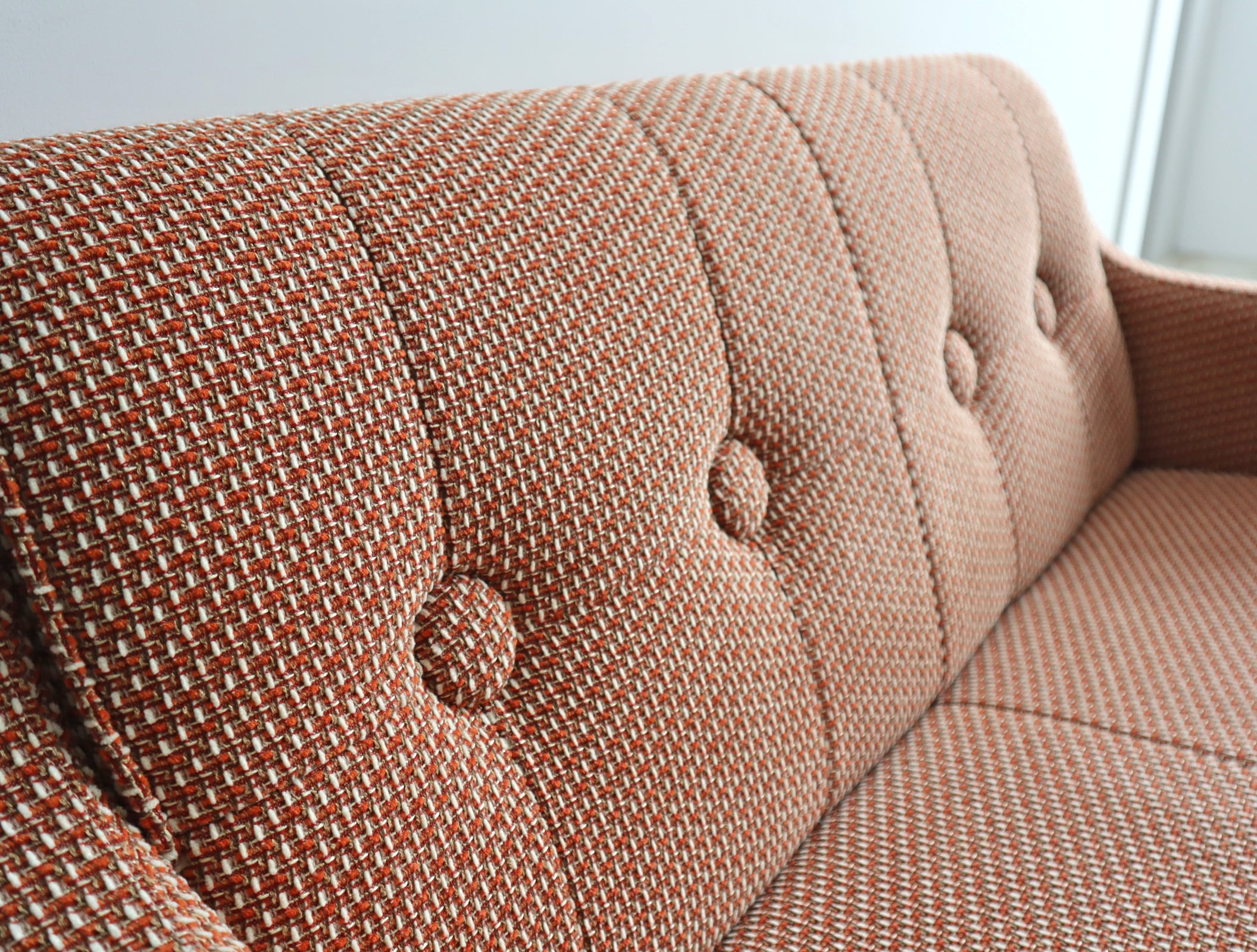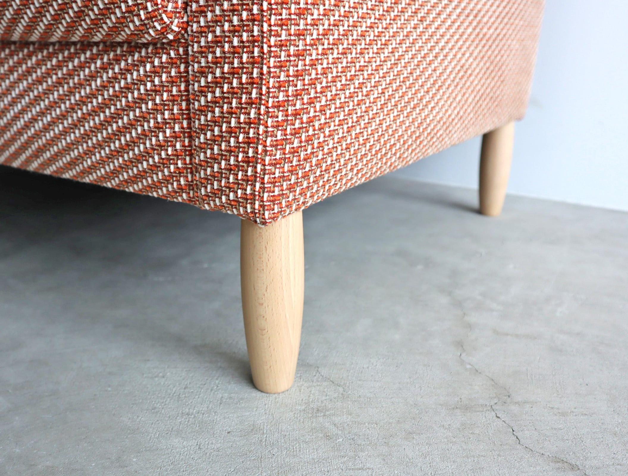 細やかな織り模様のファブリックはオレンジとベージュが混ざり合うような優しいトーンで、空間に自然と馴染みながらどこか愛らしさを添えてくれます。
