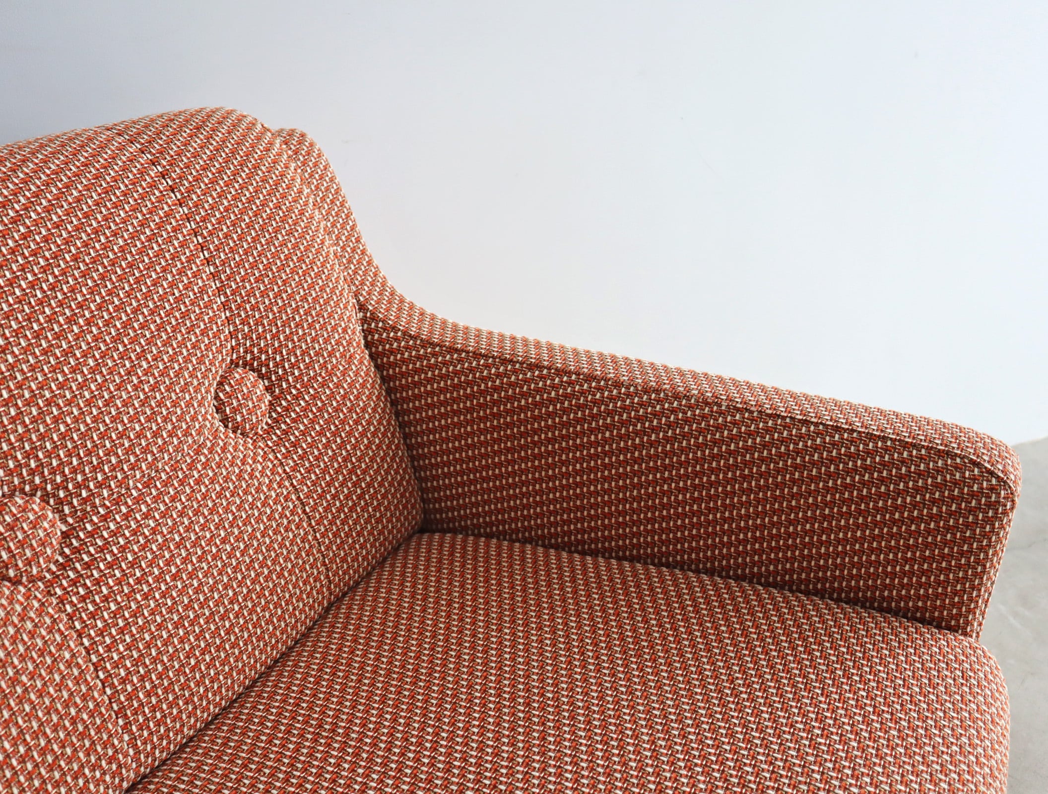 背もたれには大きめのくるみボタンが並び、シンプルなデザインの中に柔らかなアクセントとなっており、程よく丸みを帯びたアームは肘を預けたときに心地よく、見た目にも安心感のあるシルエット。
