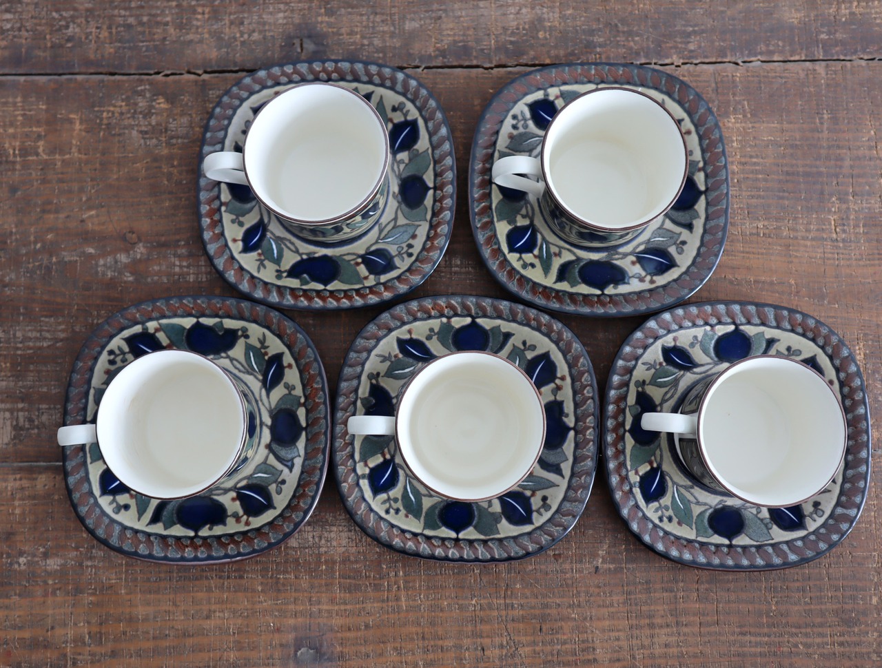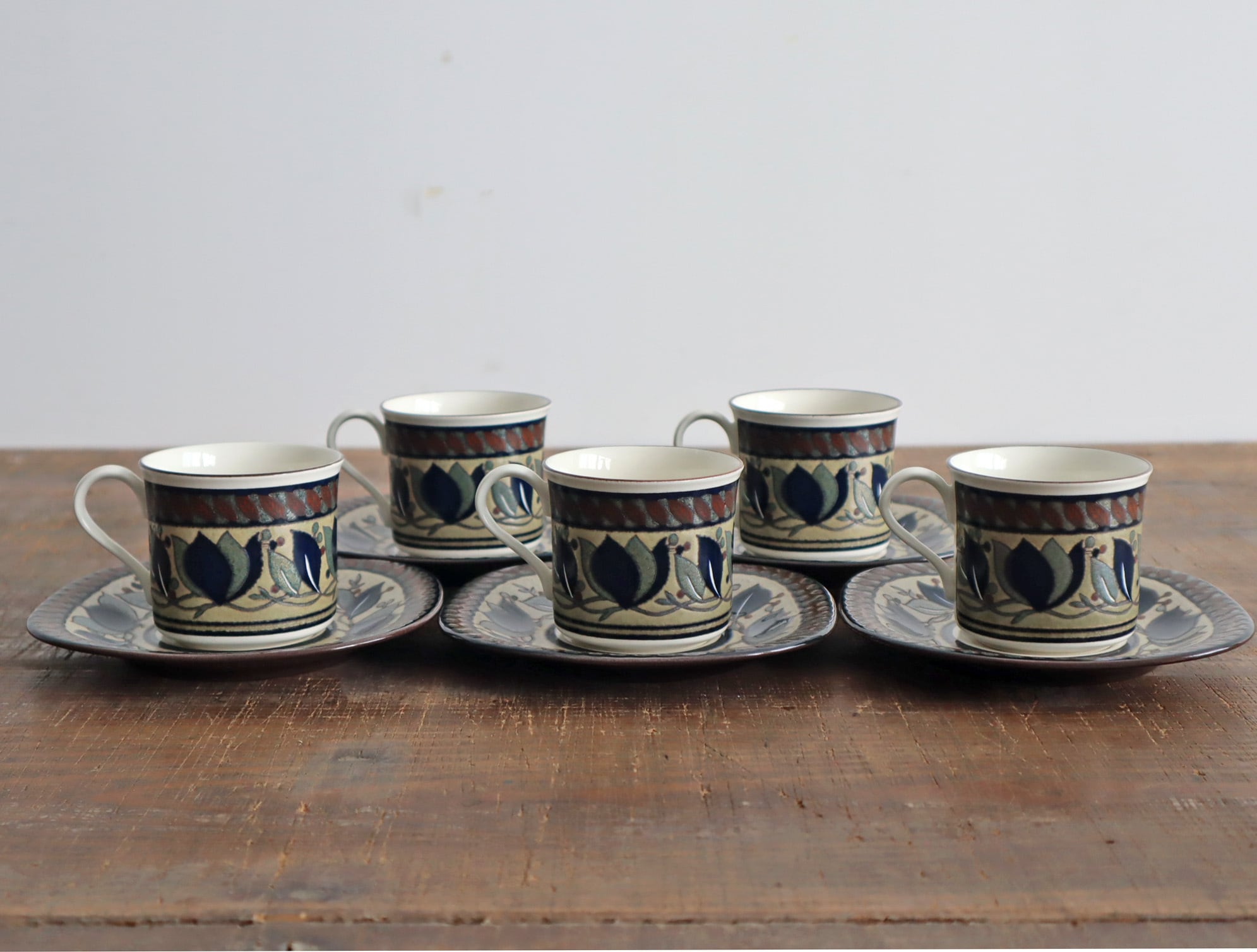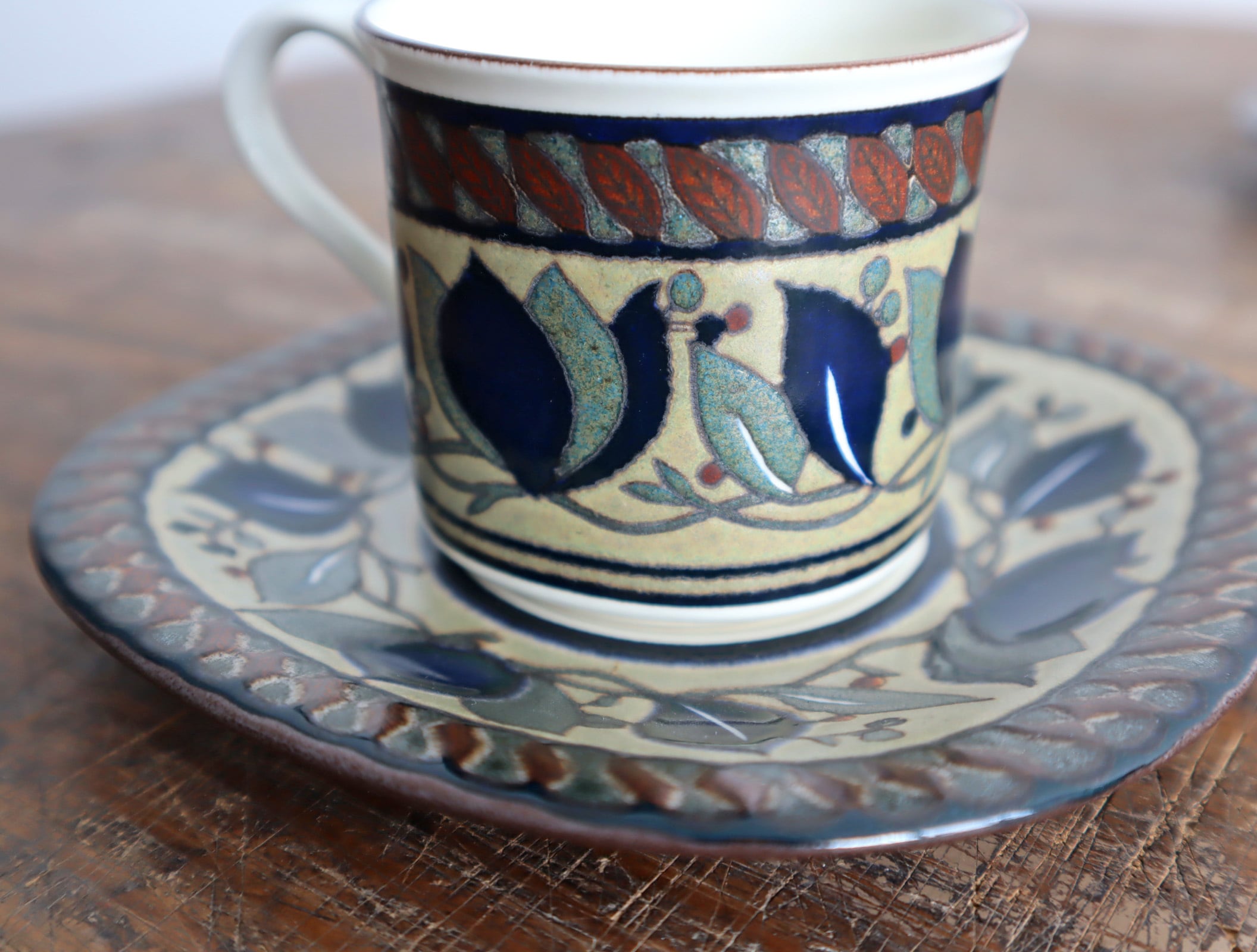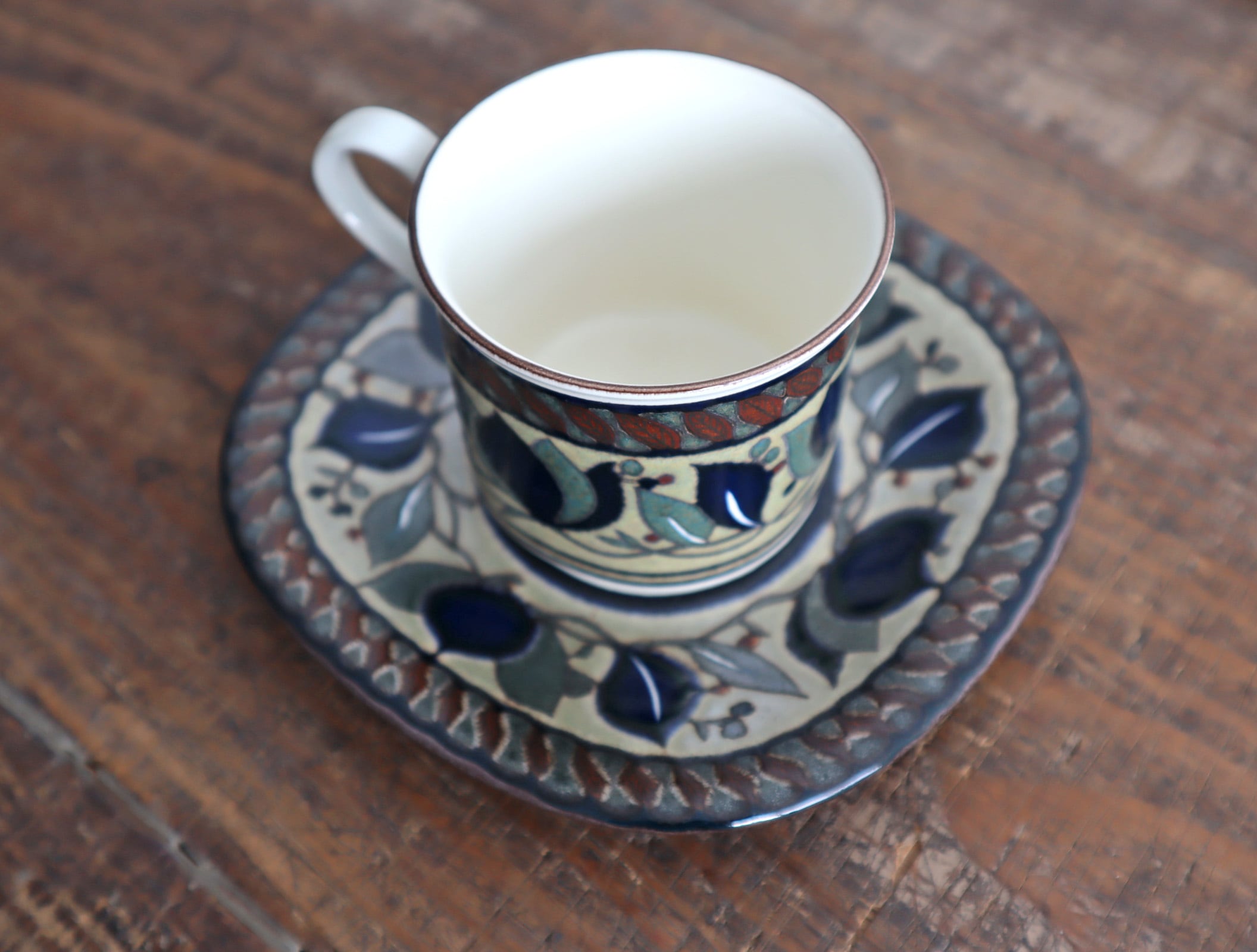 こちらのカップ&ソーサーは深みのあるブラウンを基調に、リーフや実のモチーフが描かれており、艶を抑えた釉薬と手描きのようなタッチが、どこか温もりを感じさせてくれるデザインです。