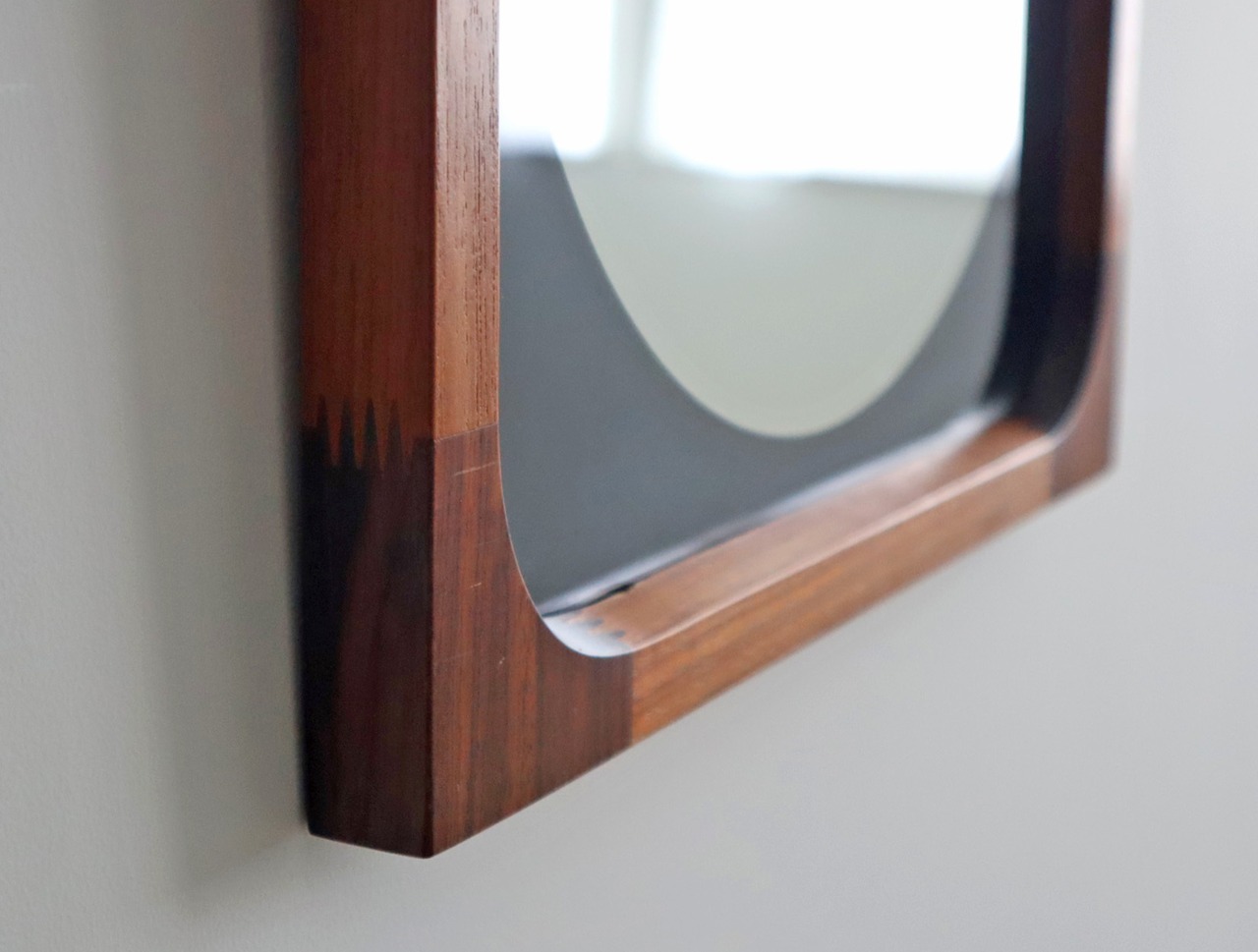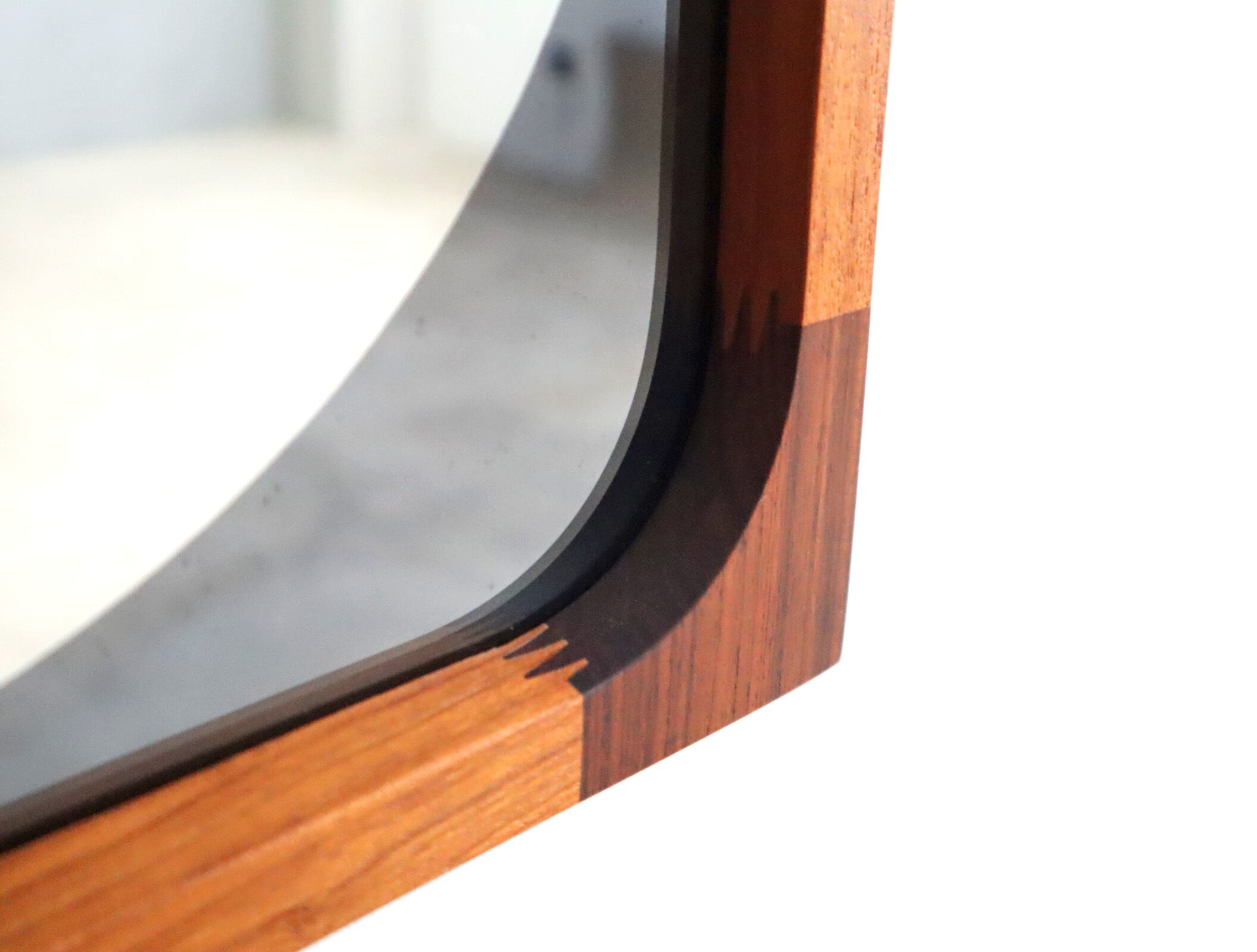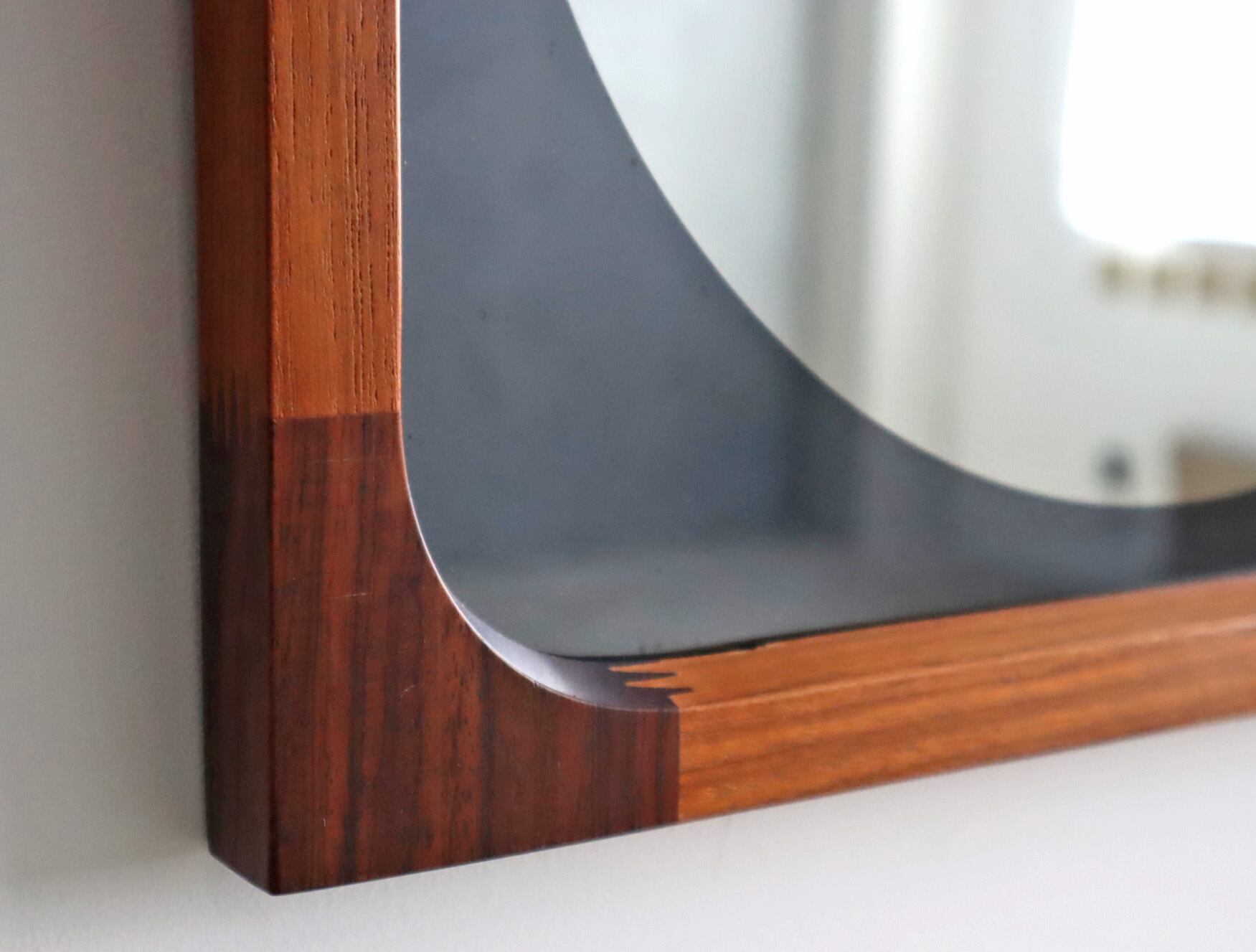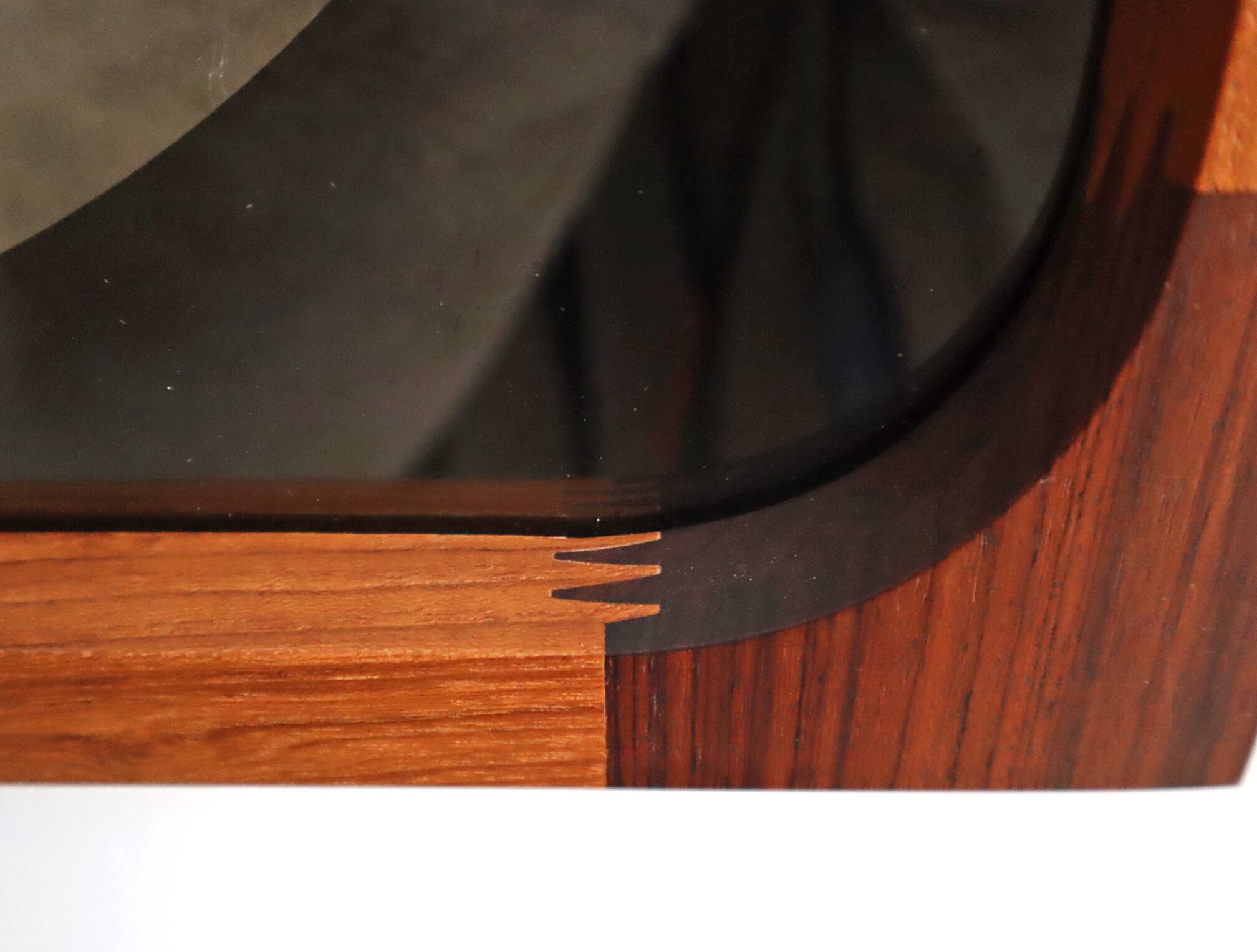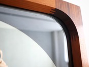 曲木の技術で有名な秋田木工ですが、こちらのミラーはのローズウッドとチーク材を贅沢に使用しフィンガージョイントという工法で繋ぎ合わせた目を惹く意匠となっており、ミラー部分の四方は角を落とした柔らかなアールを描き、映り込みさえも優しく感じられるデザイン性が高い仕上がり。