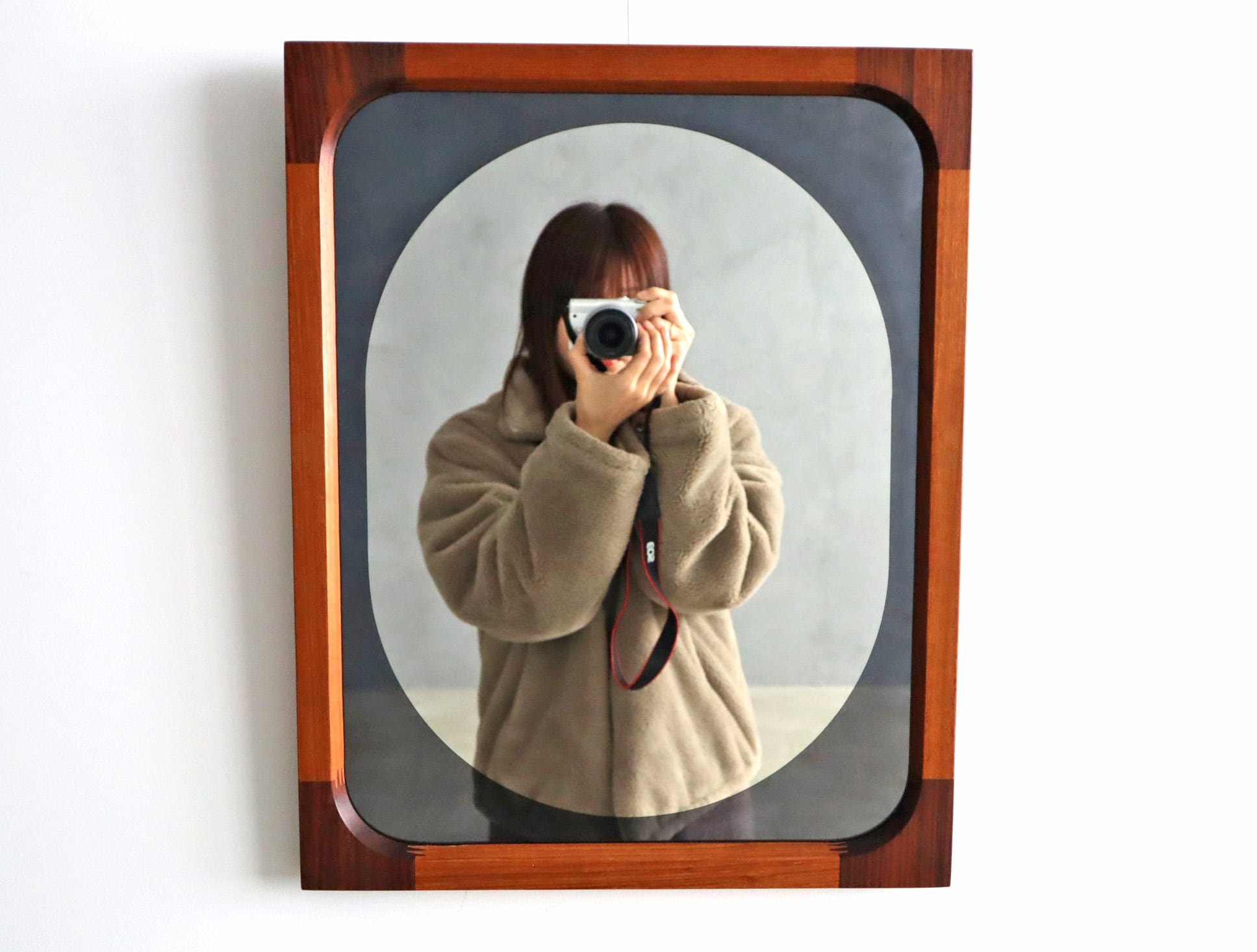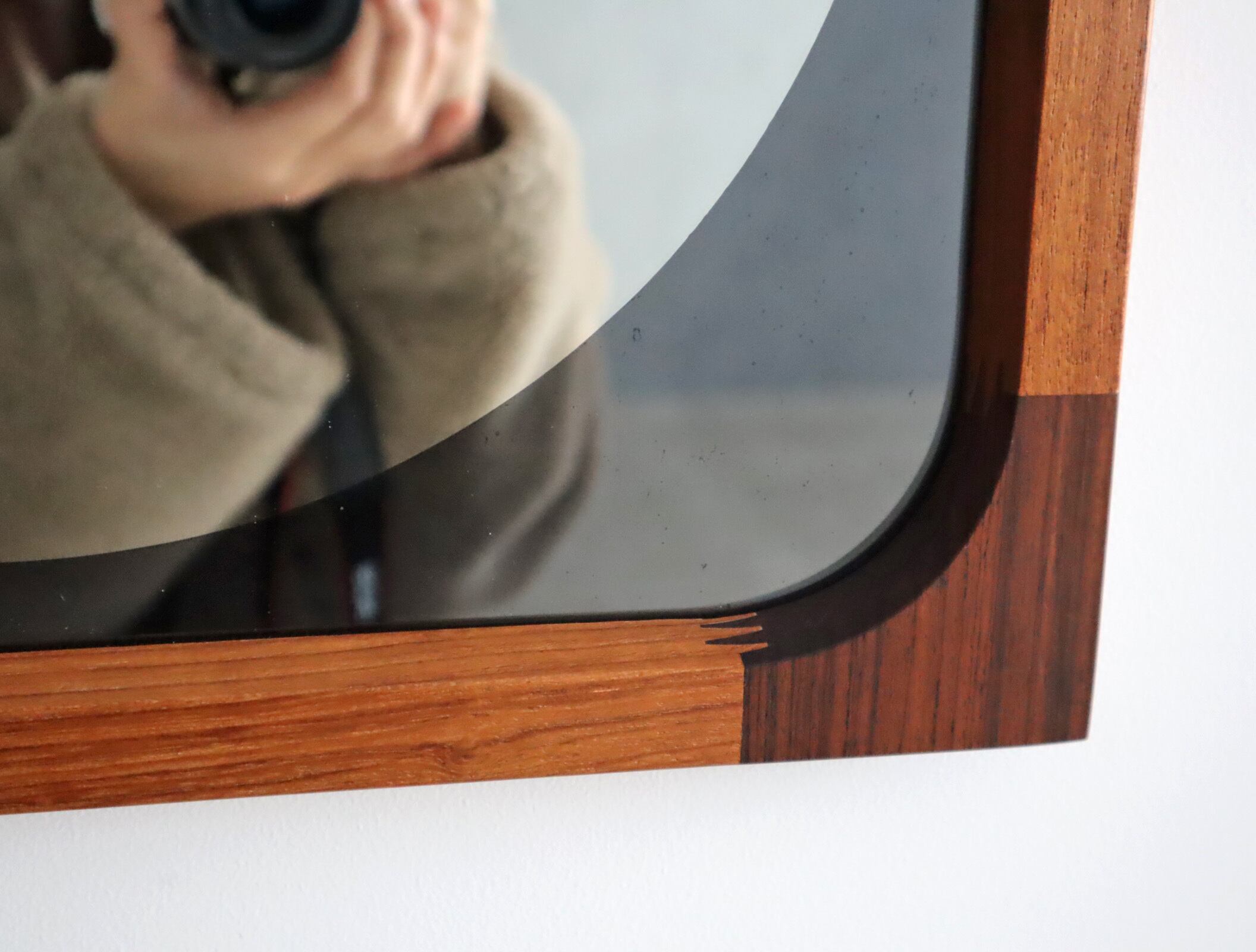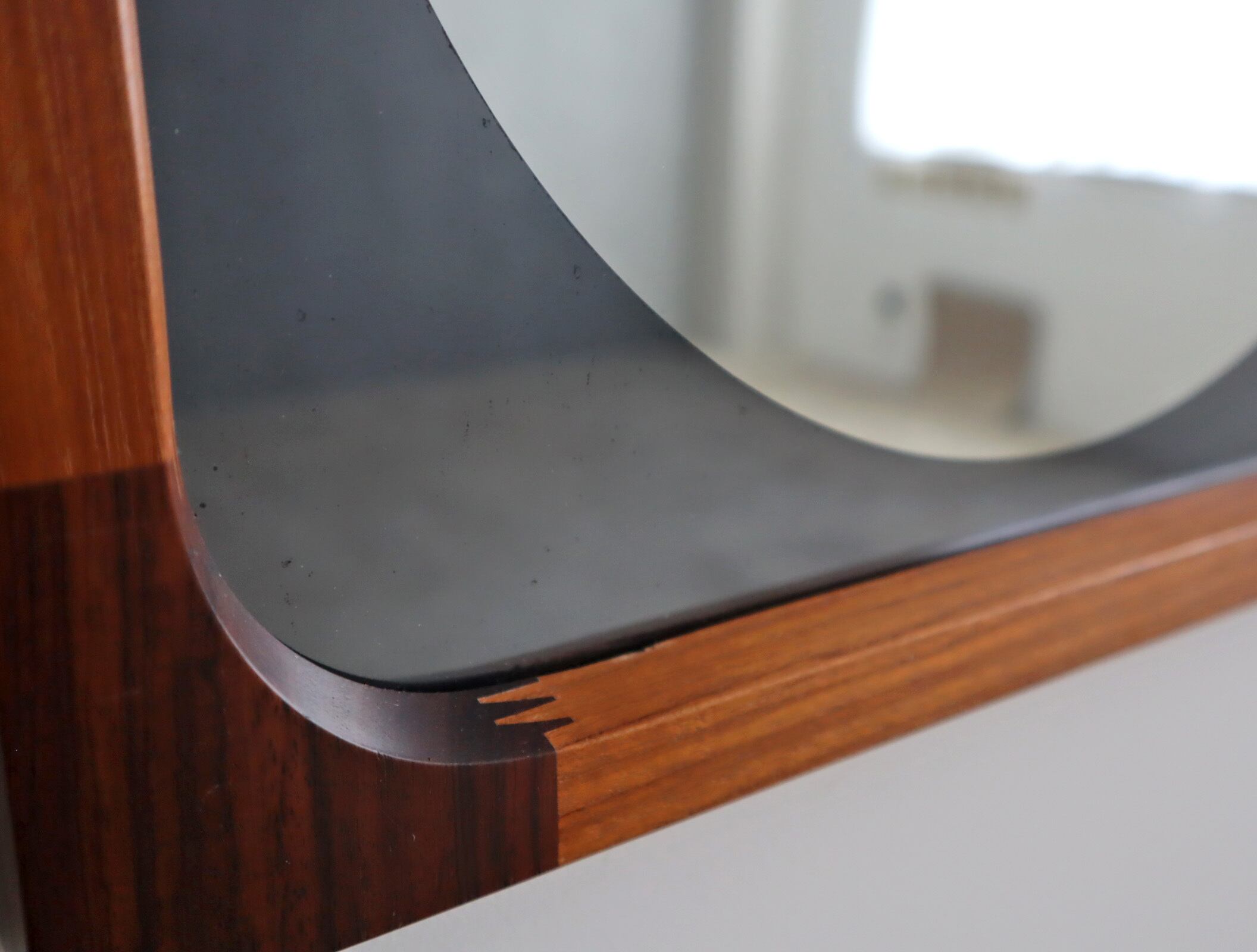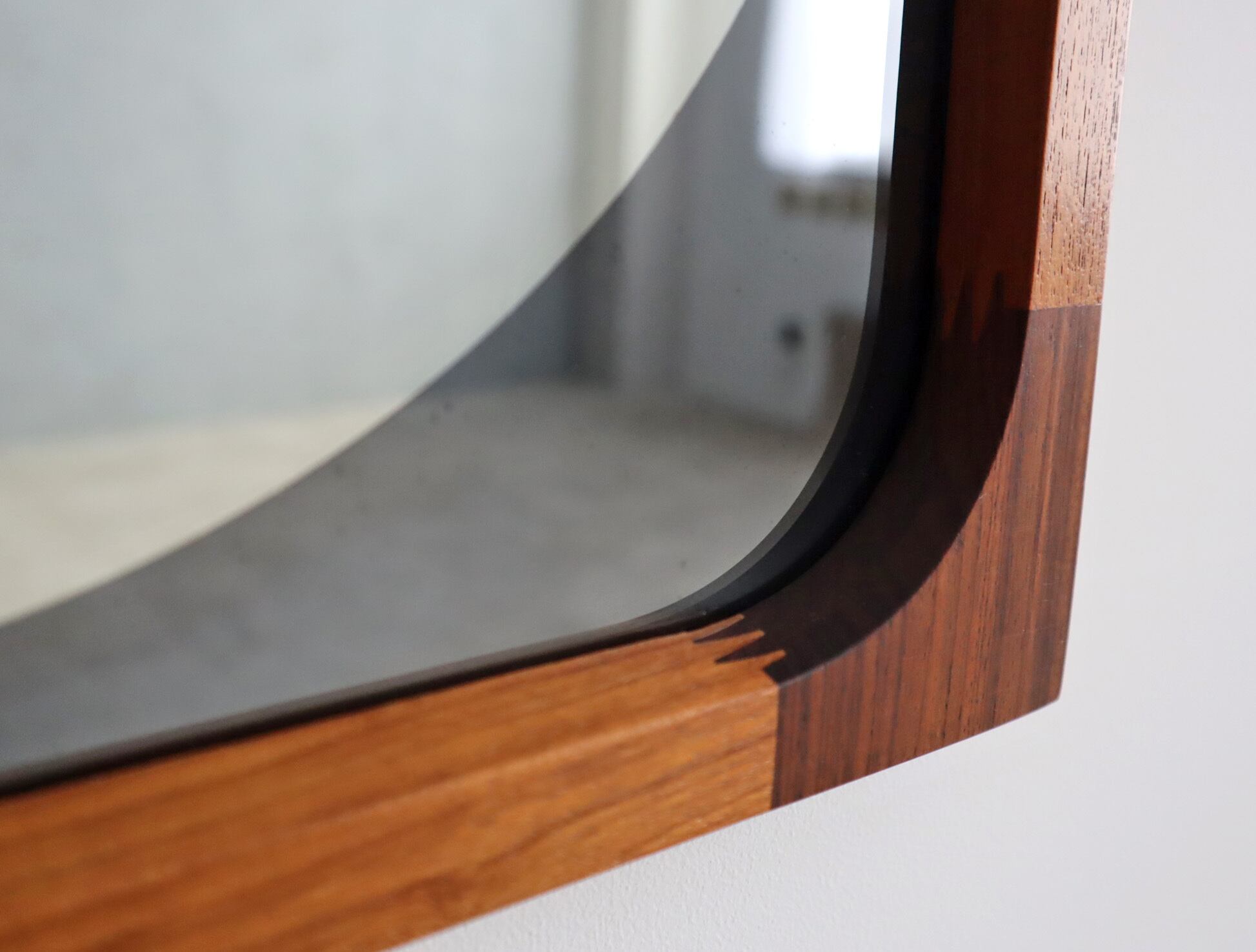 曲木の技術で有名な秋田木工ですが、こちらのミラーはのローズウッドとチーク材を贅沢に使用しフィンガージョイントという工法で繋ぎ合わせた目を惹く意匠となっており、ミラー部分の四方は角を落とした柔らかなアールを描き、映り込みさえも優しく感じられるデザイン性が高い仕上がり。