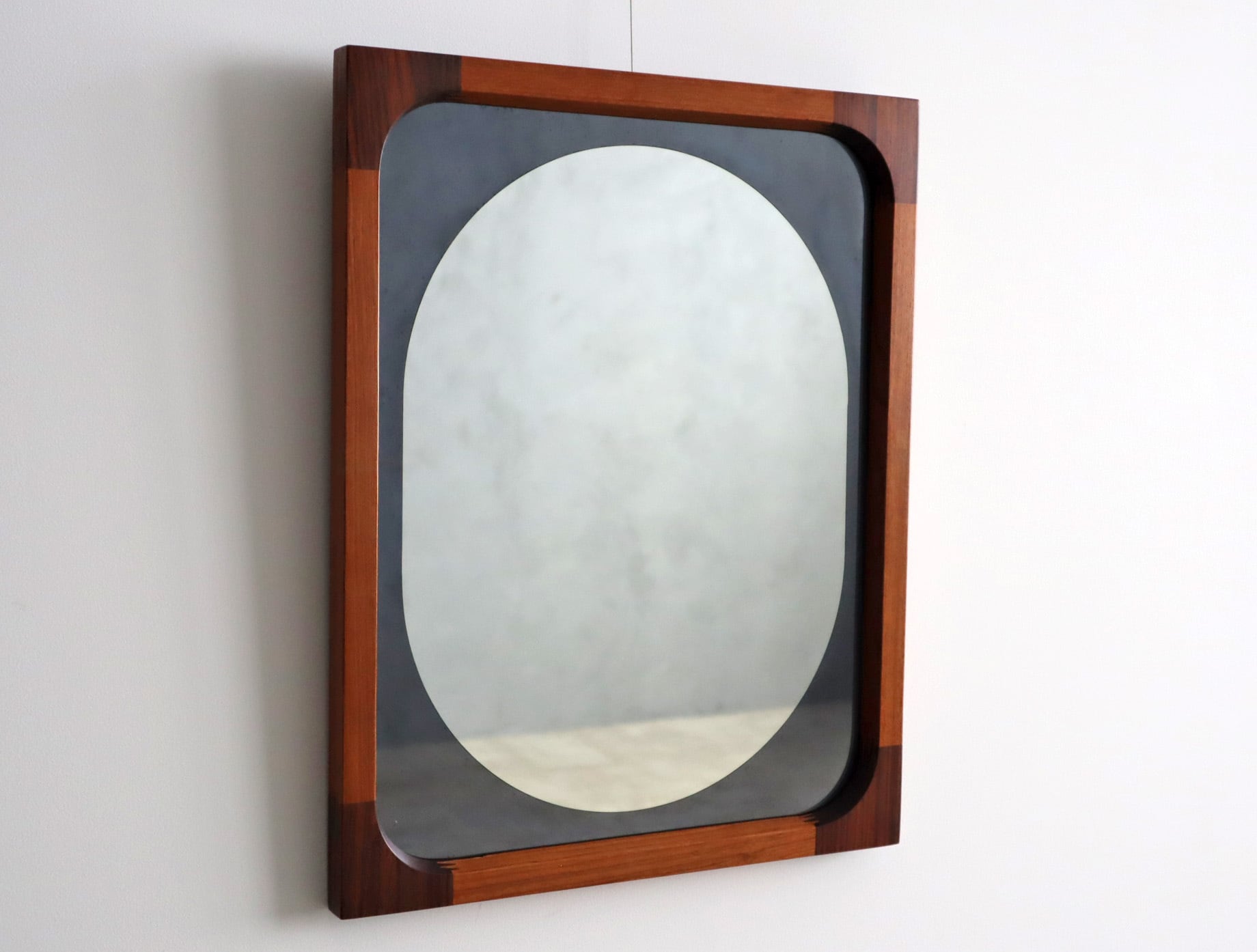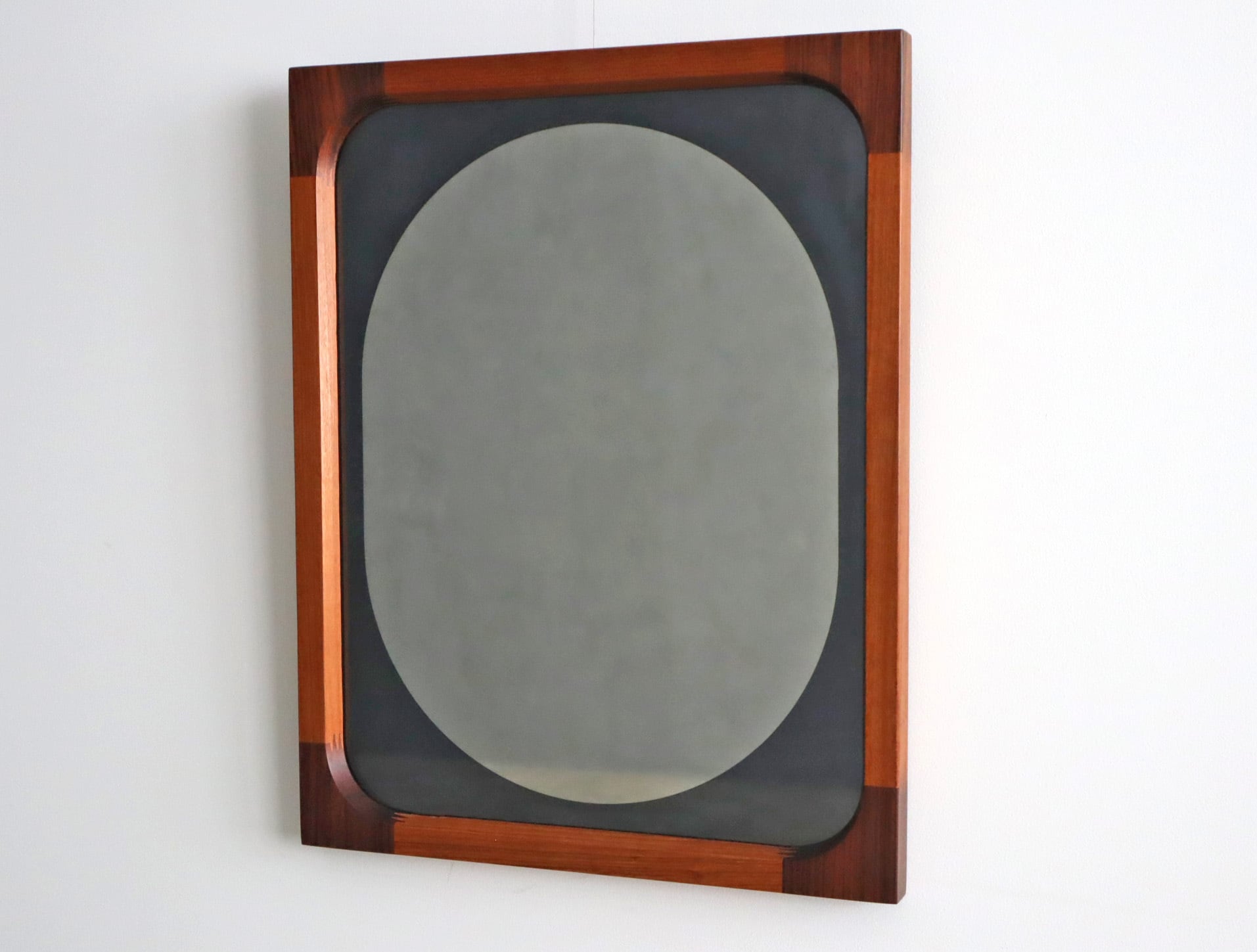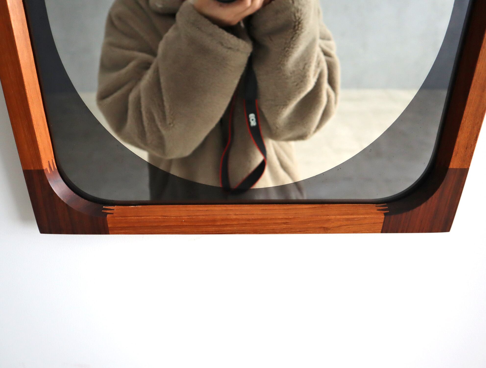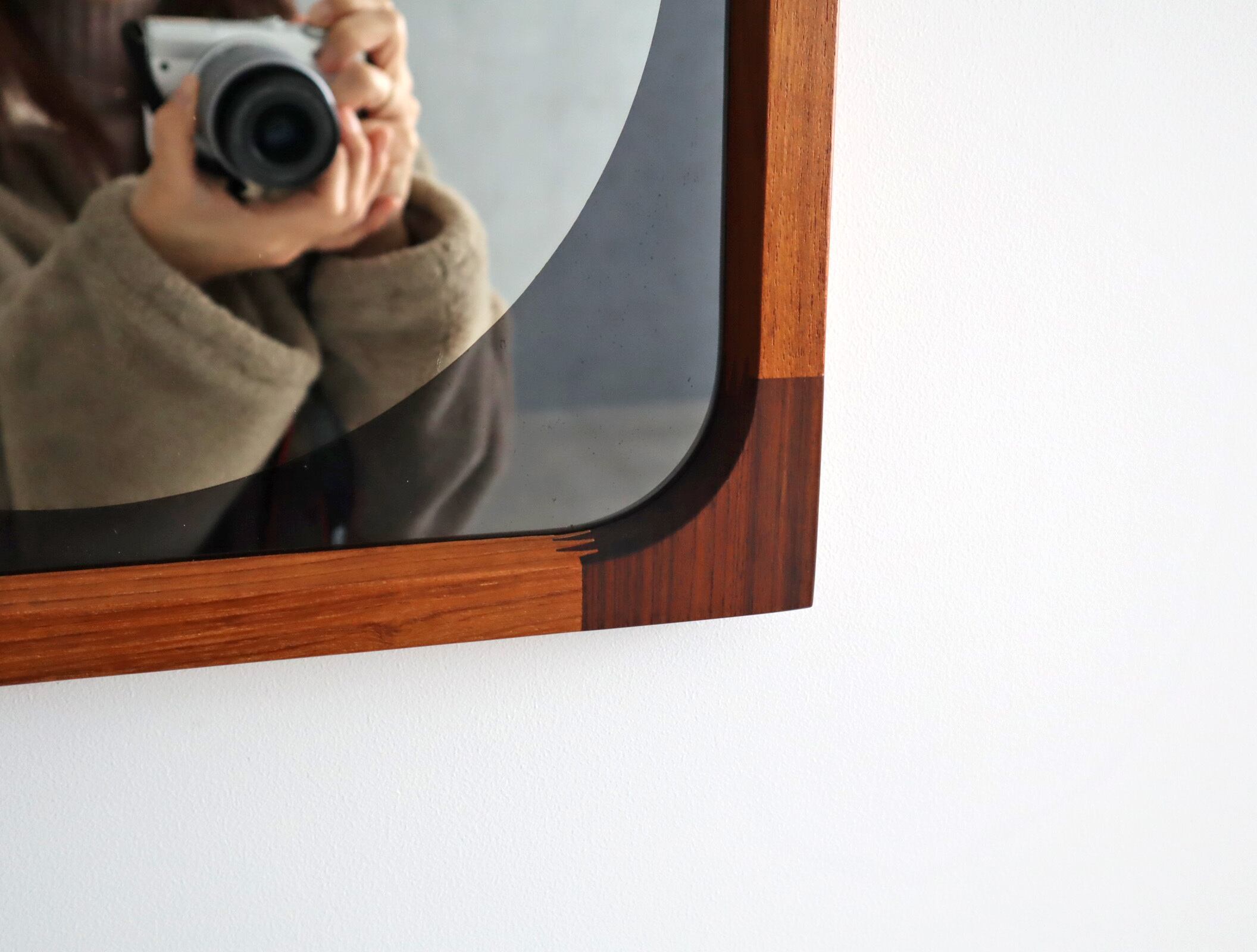 曲木の技術で有名な秋田木工ですが、こちらのミラーはのローズウッドとチーク材を贅沢に使用しフィンガージョイントという工法で繋ぎ合わせた目を惹く意匠となっており、ミラー部分の四方は角を落とした柔らかなアールを描き、映り込みさえも優しく感じられるデザイン性が高い仕上がり。