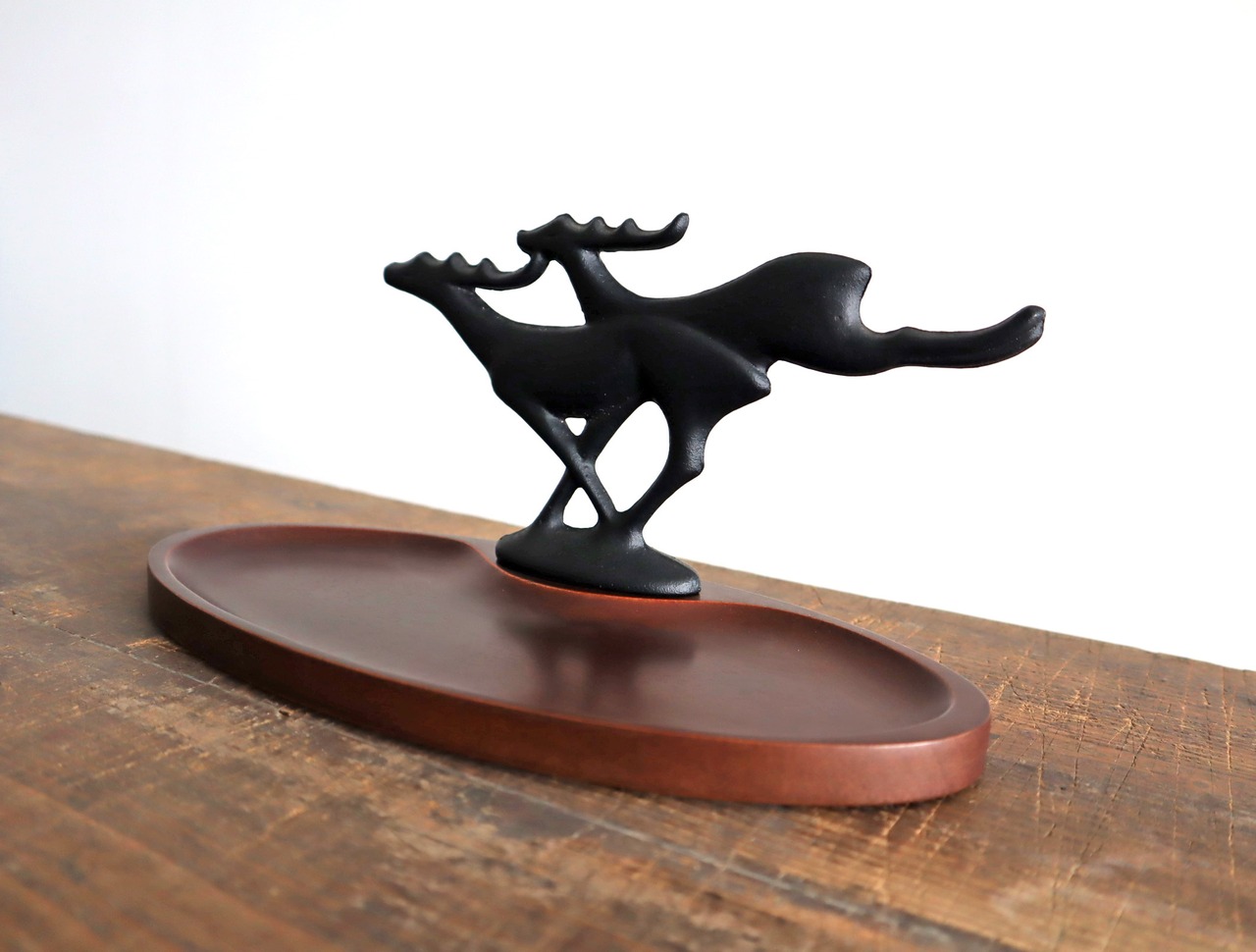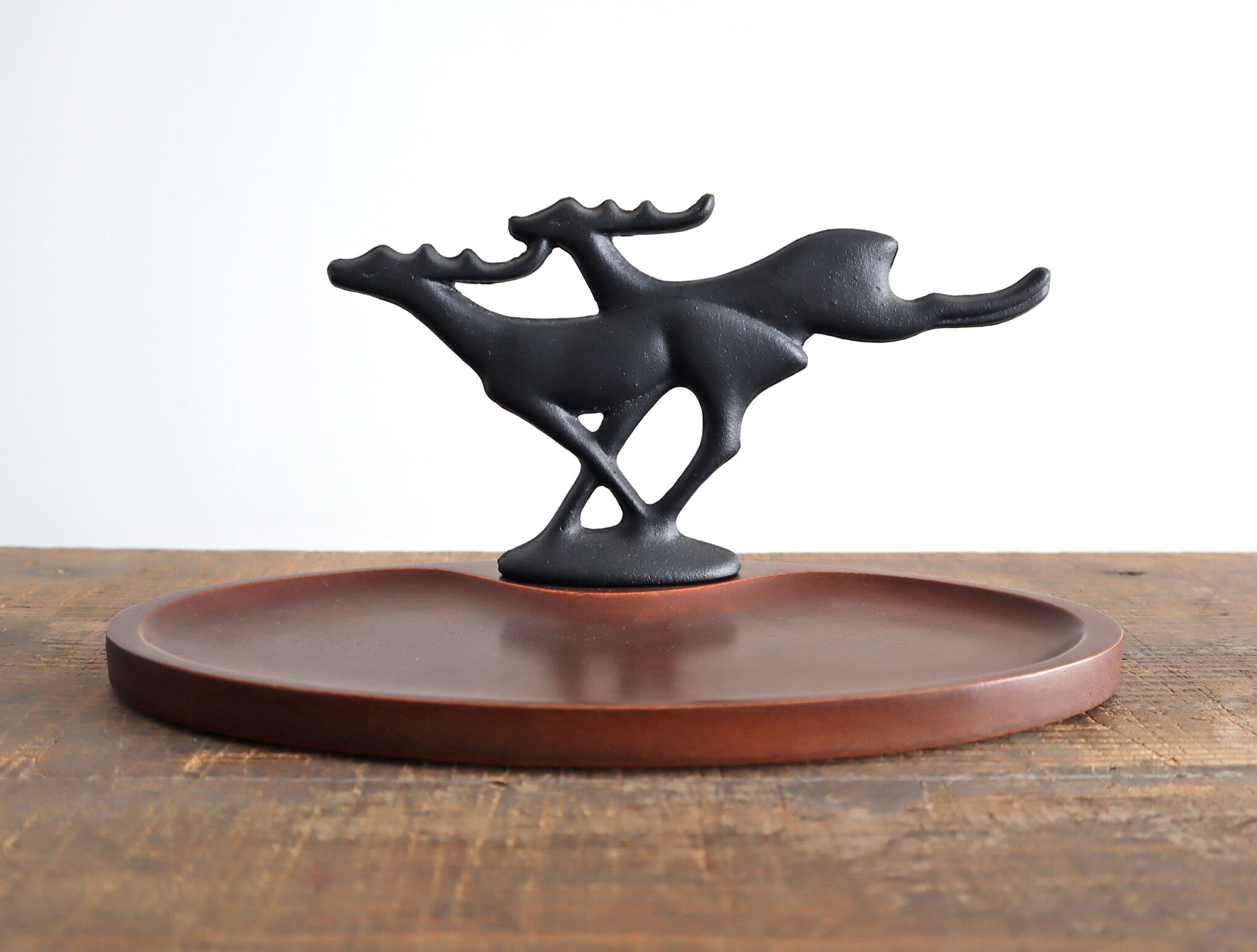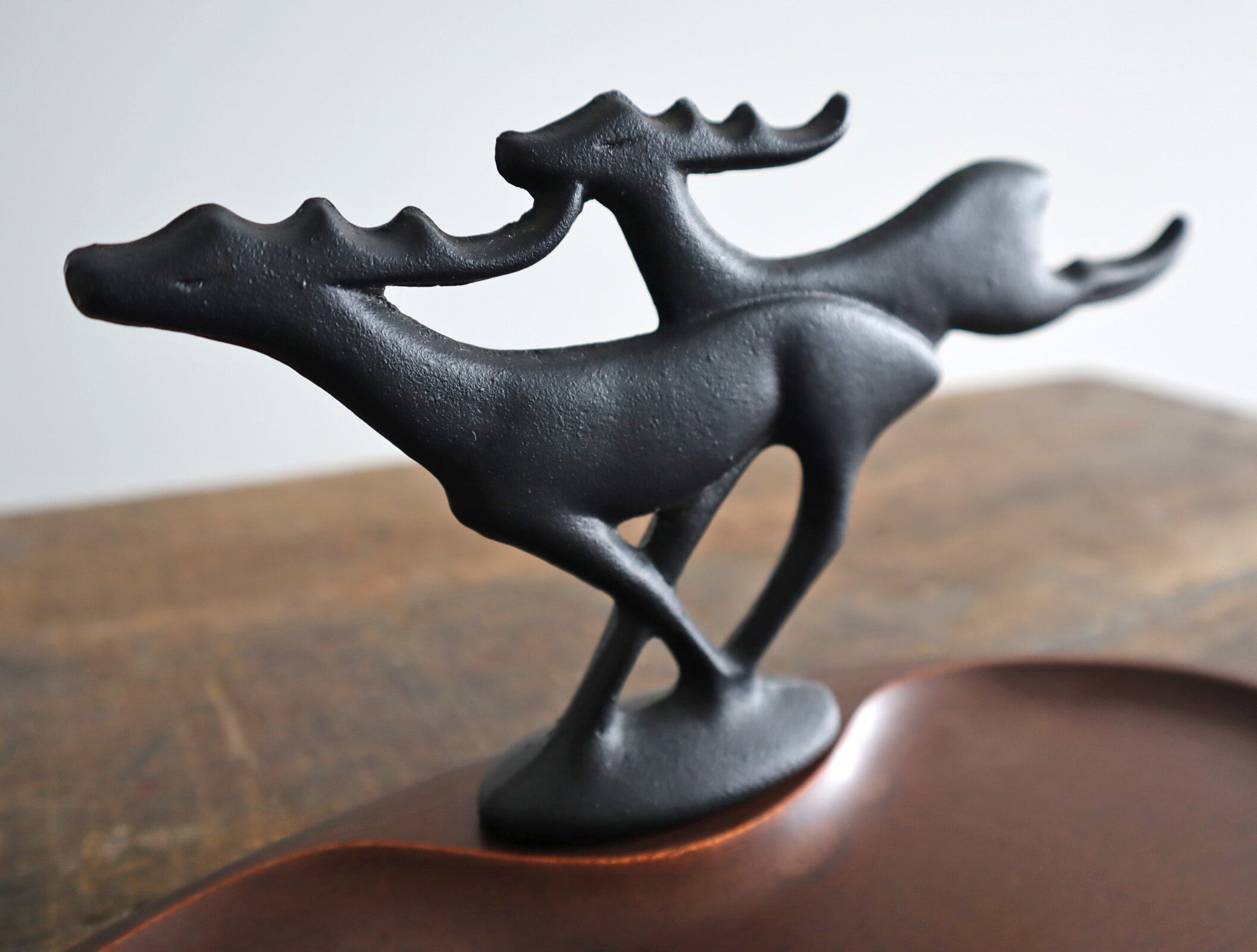 鉄とウッドのコンビネーションがモダンな存在感を放つ1970~80年頃のプロダクト、オーバル型のトレイと重なり合った鹿のシルエットが美しく、洗練された佇まいのヴィンテージ品。